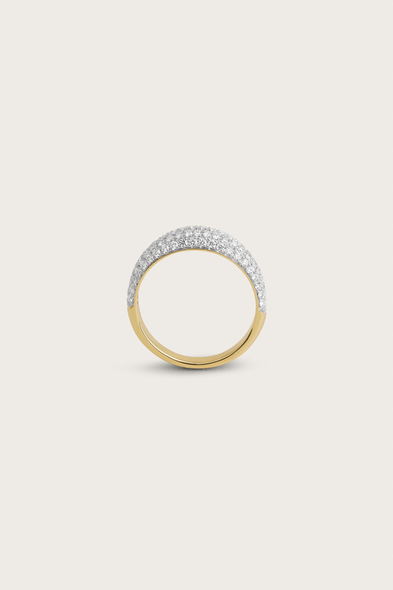 The Pavé Dome Ring combines classic and contemporary design with 115 pavé-set diamonds along its signature 'D' shape. Crafted from polished white and yellow gold, this luxurious ring offers bold elegance and comfort, making it an everyday favorite.