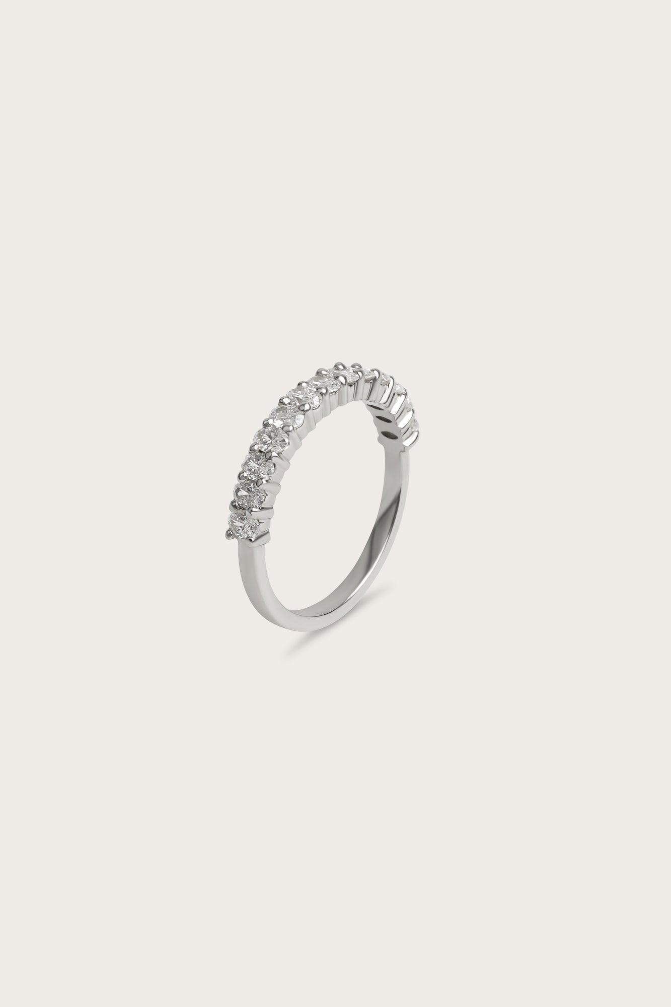 A delicate row of oval diamonds set halfway around the band. The Petite Oval Half Eternity Ring is a refined stacking ring designed to pair beautifully with engagement rings.