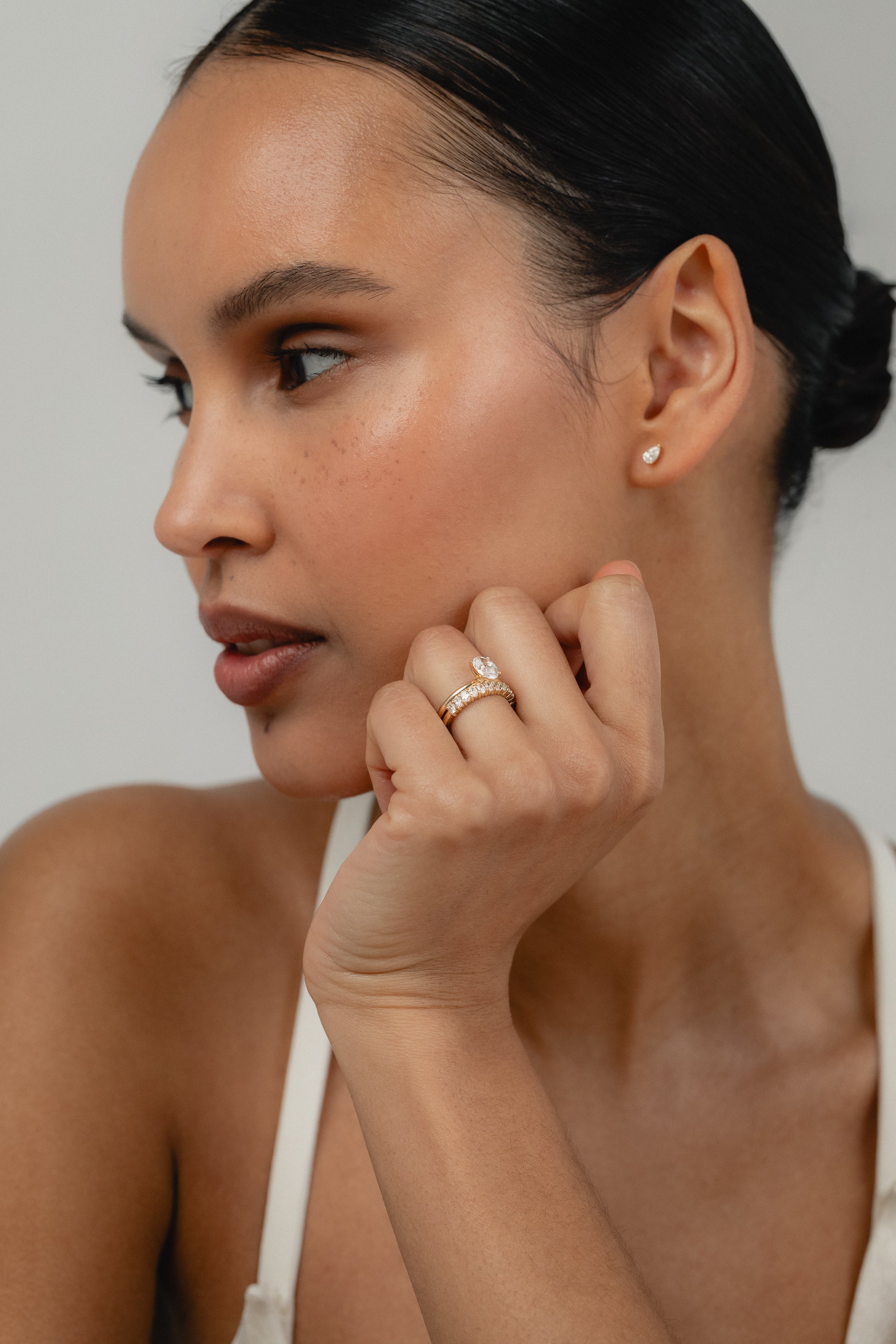 Crafted in 18k recycled gold, the slimmer proportions make this ring especially beautiful when paired with engagement rings around the one-carat range or with other daintier stacking bands. The result is a timeless piece that feels effortless, refined, and quietly luminous.
