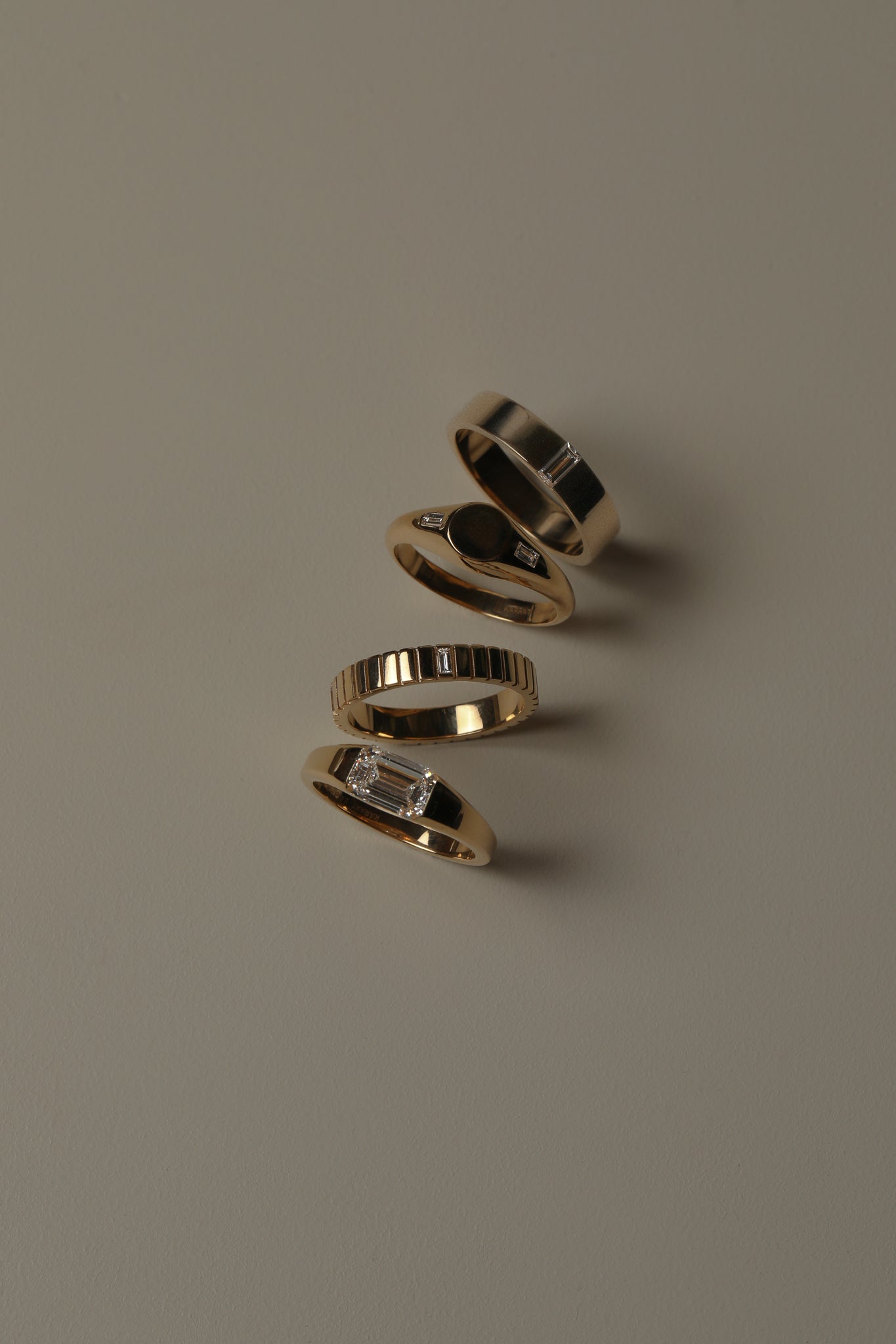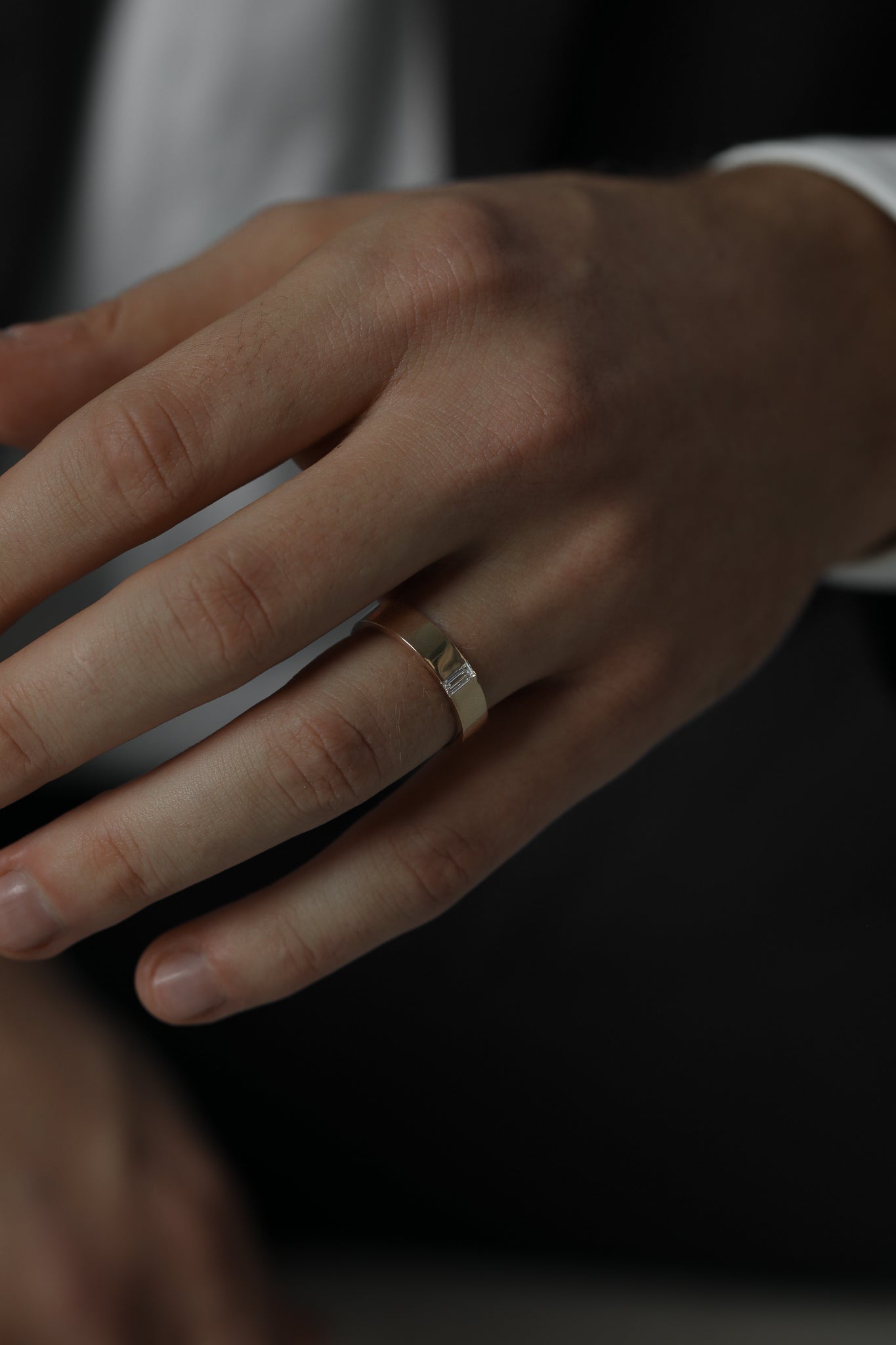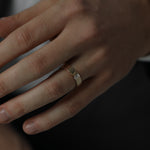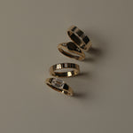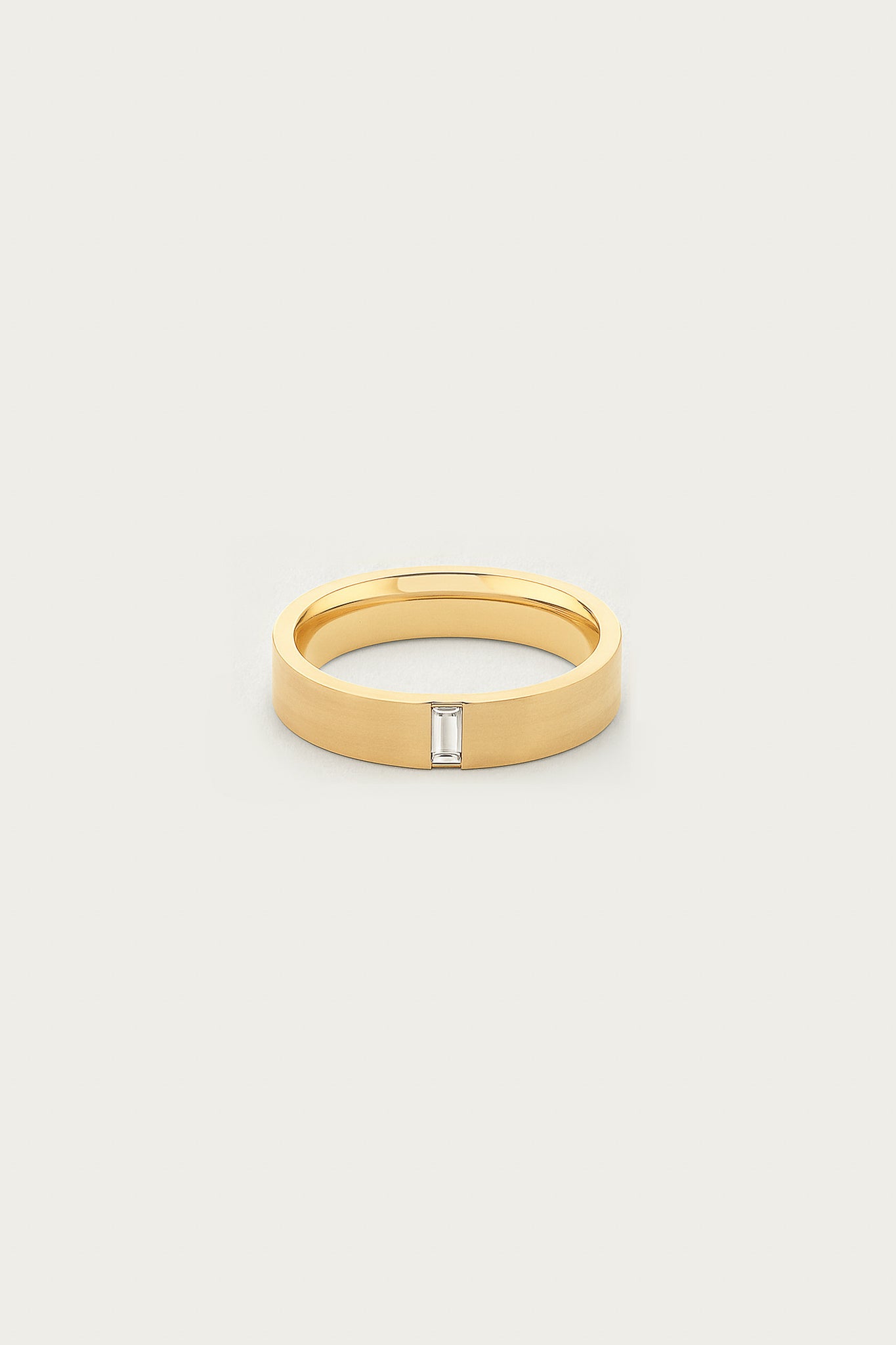 Solid 18k gold band with a brushed finish and a single baguette-cut lab-grown diamond. A modern classic with timeless weight and texture.