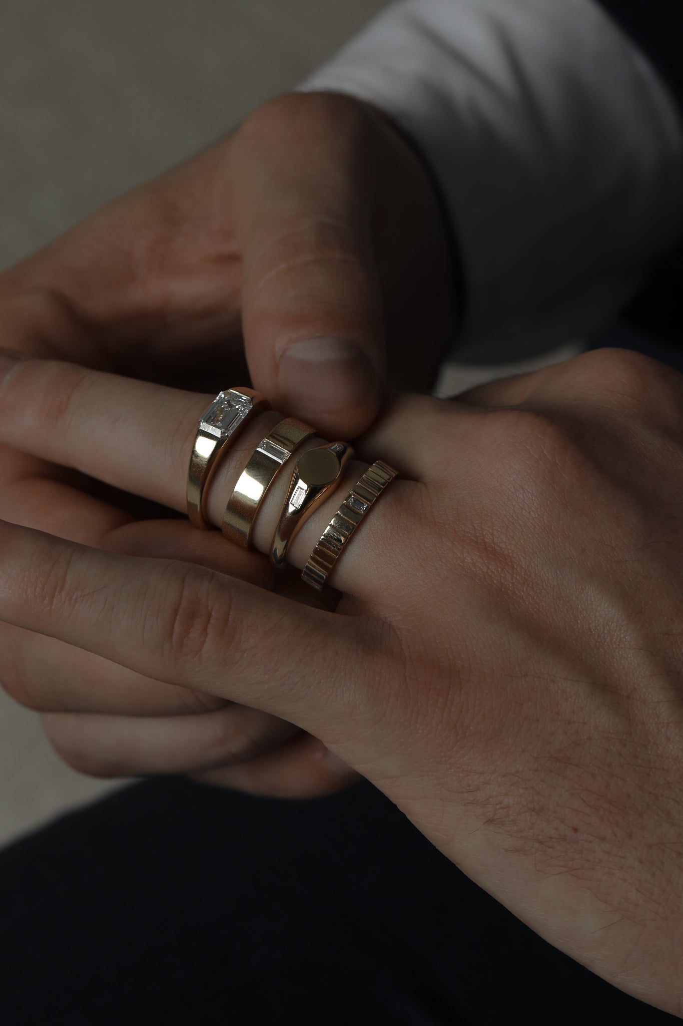 The Brushed Cigar Band embodies timeless presence. Made of solid 18k recycled gold, its brushed surface softens the light, creating a subtle texture that feels refined and contemporary. A single 0.2ct baguette-cut lab-grown diamond punctuates the surface, adding quiet brilliance to the ring’s sculptural simplicity. Designed with weight and proportion, it’s a modern classic — a wedding band or everyday statement that conveys confidence through understatement.