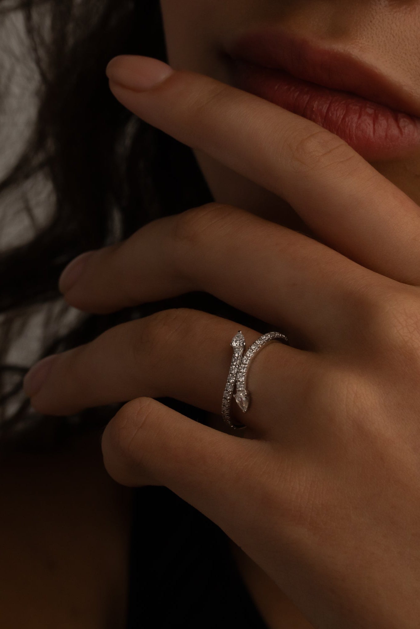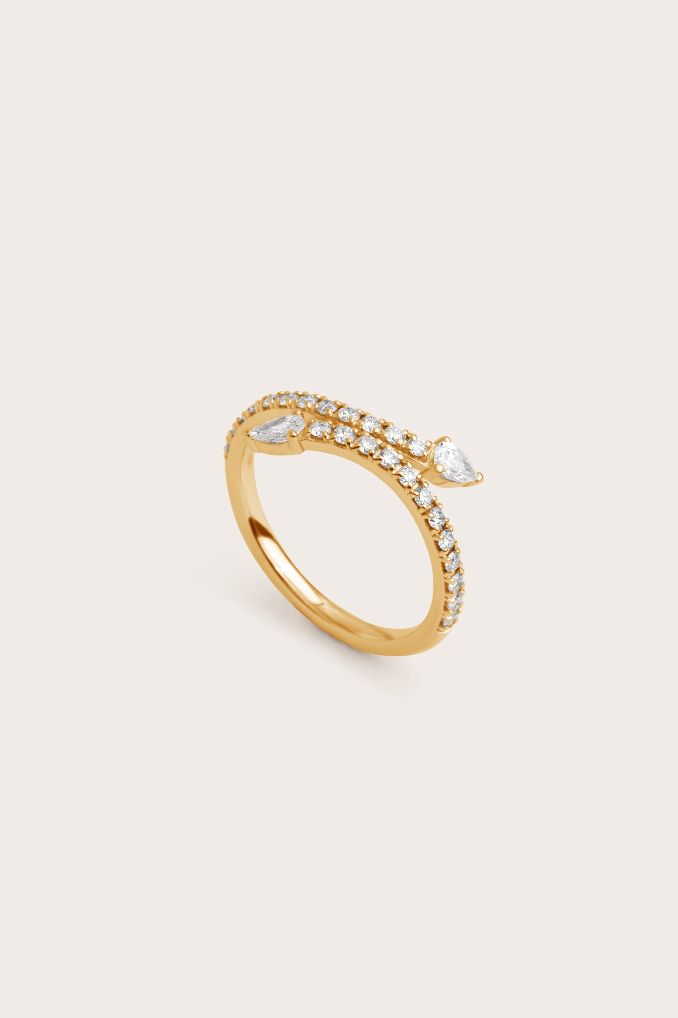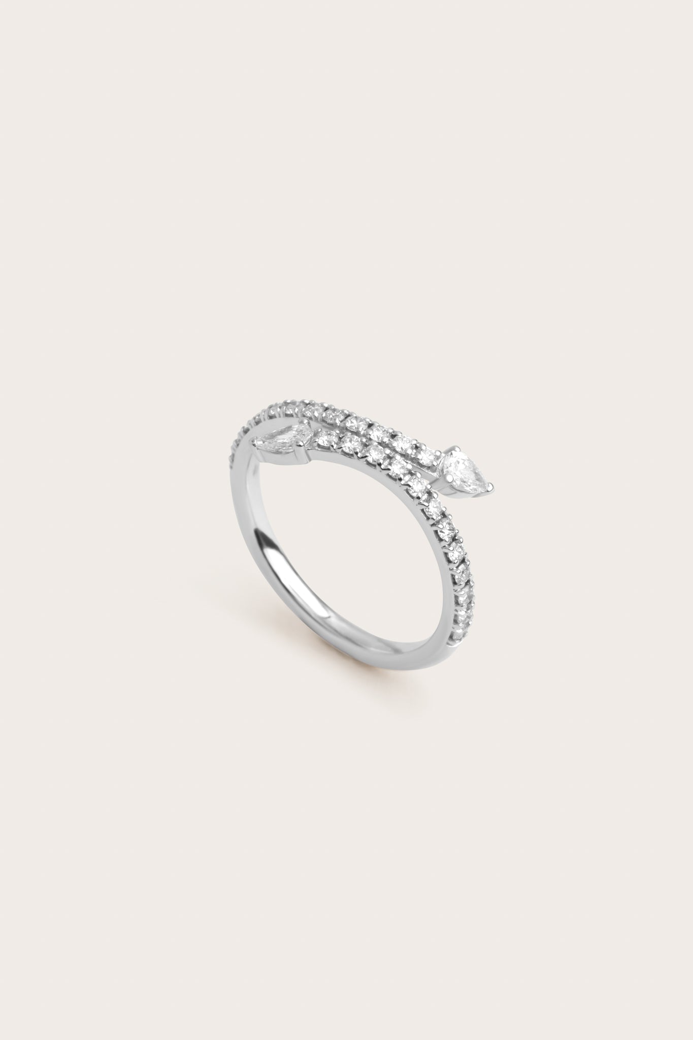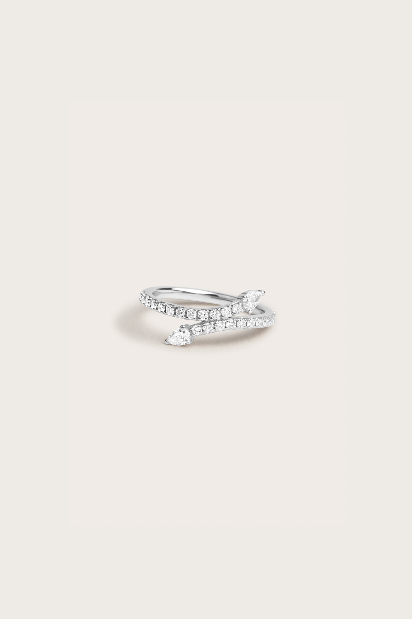 The Serpent Diamond Ring captivates with a coiled, serpent-inspired design featuring pear-cut and pavé diamonds in 18K gold.
