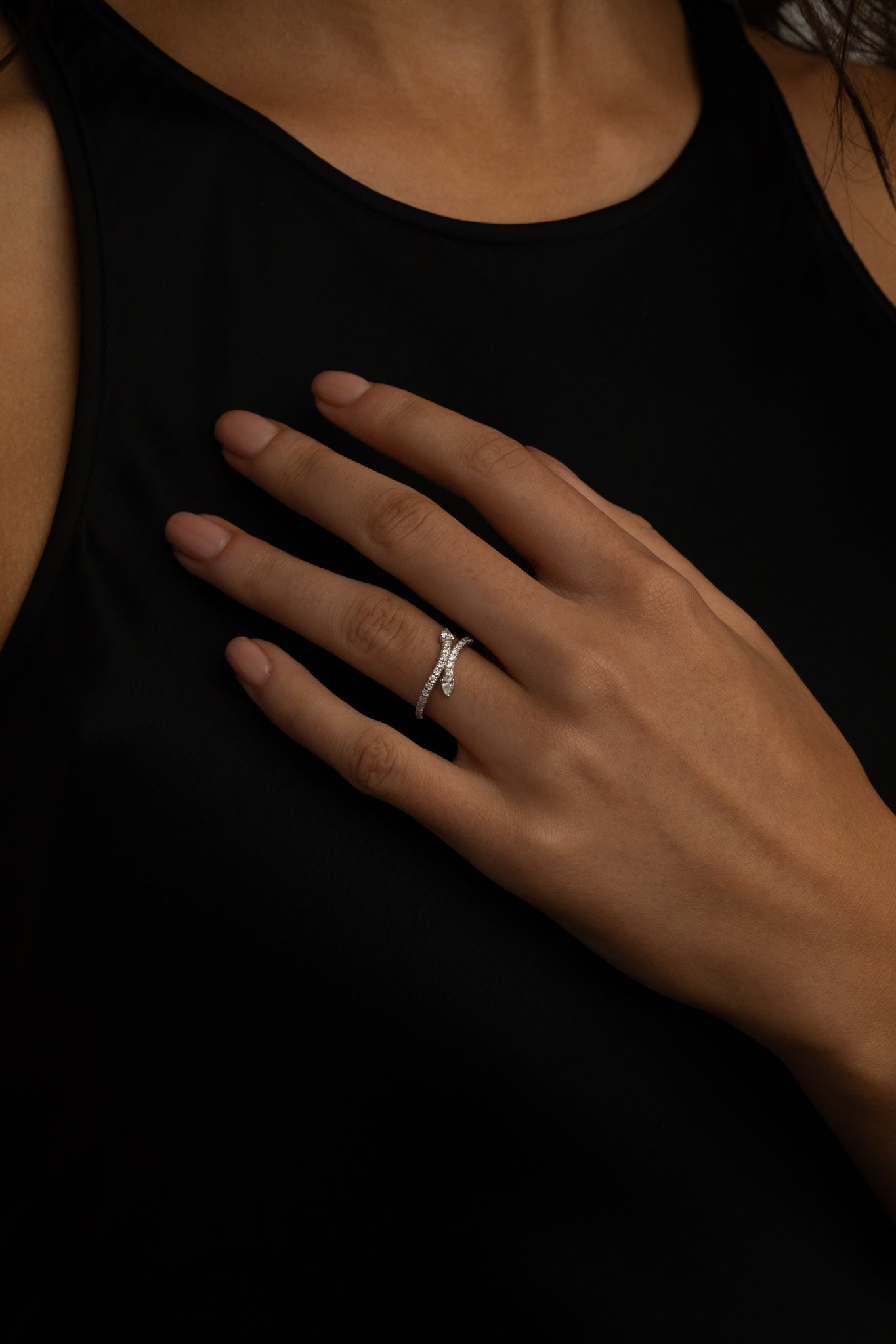 Mysterious and captivating, the Serpent Diamond Ring exudes an alluring charm. The ring wraps partly around the finger, tracing the delicate form of a serpent. With a combination of pear-cut and round pavé-set diamonds, the ring catches the light beautifully. The Serpent Diamond Ring is a standalone statement piece yet plays well with others, like our Solitaire Classics, for a sophisticated layered look.