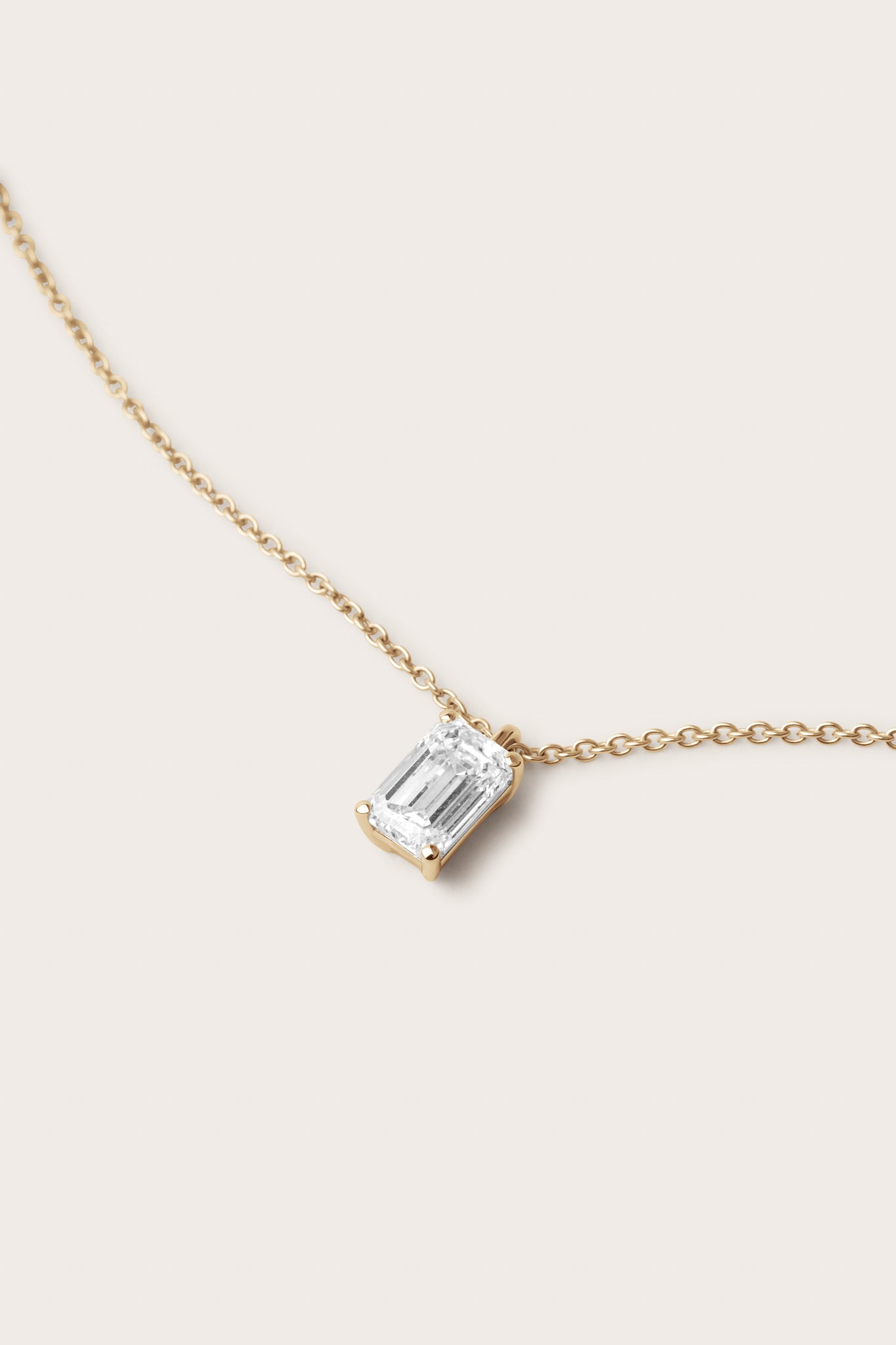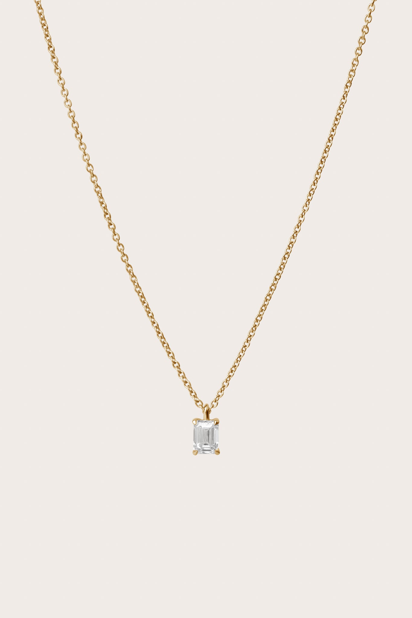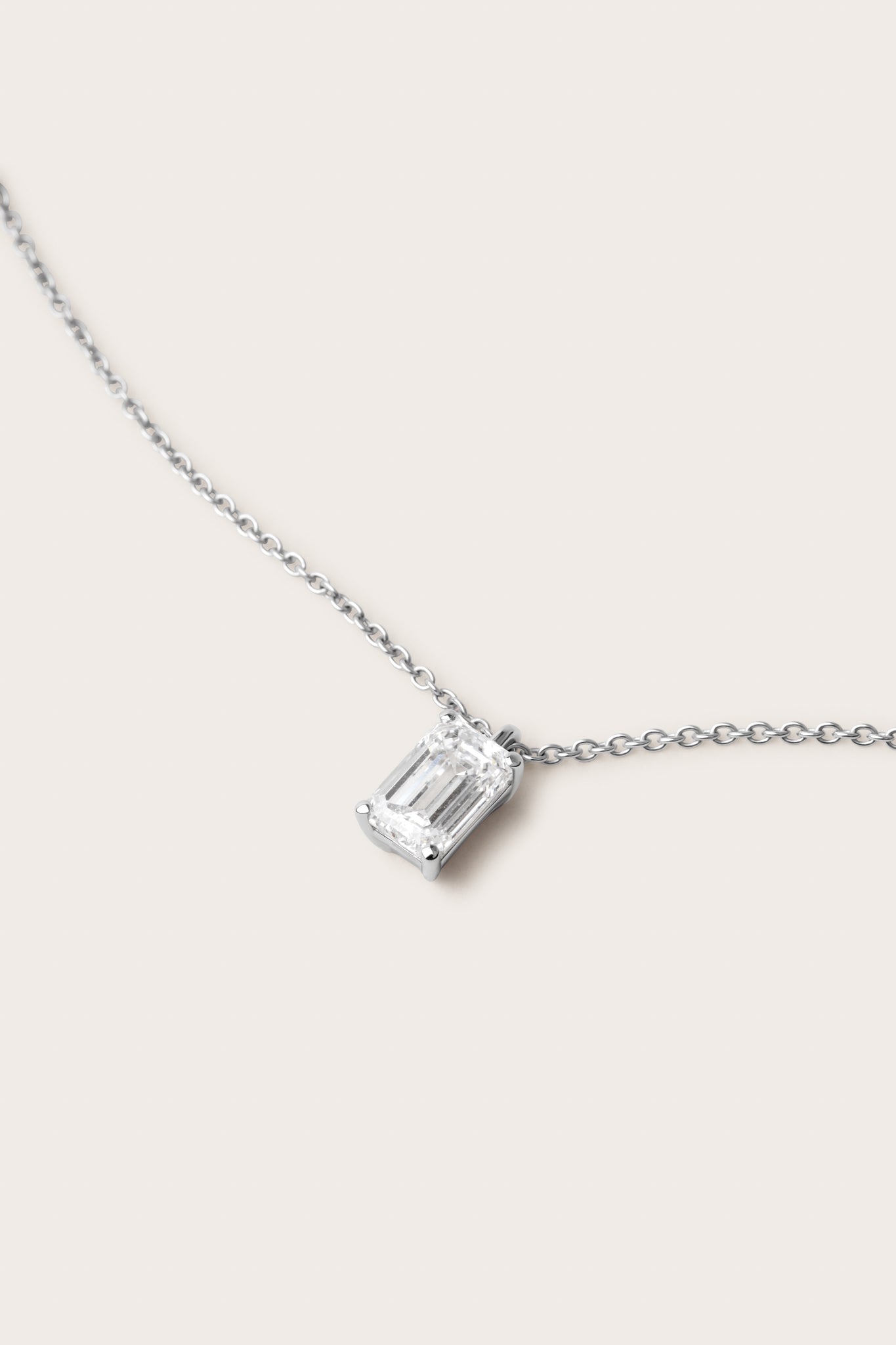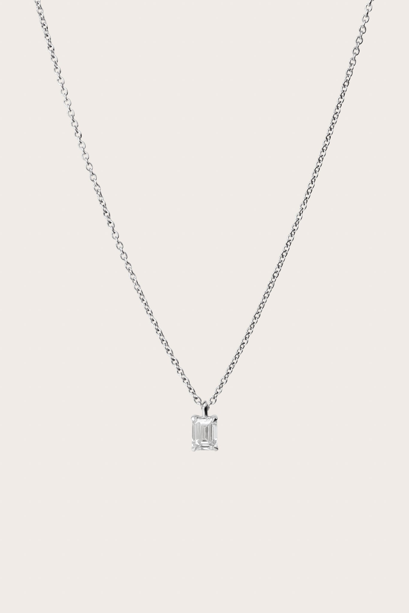 The Emerald Diamond Pendant Necklace offers modern elegance with a sustainably crafted emerald-cut diamond in a classic 18K gold setting.