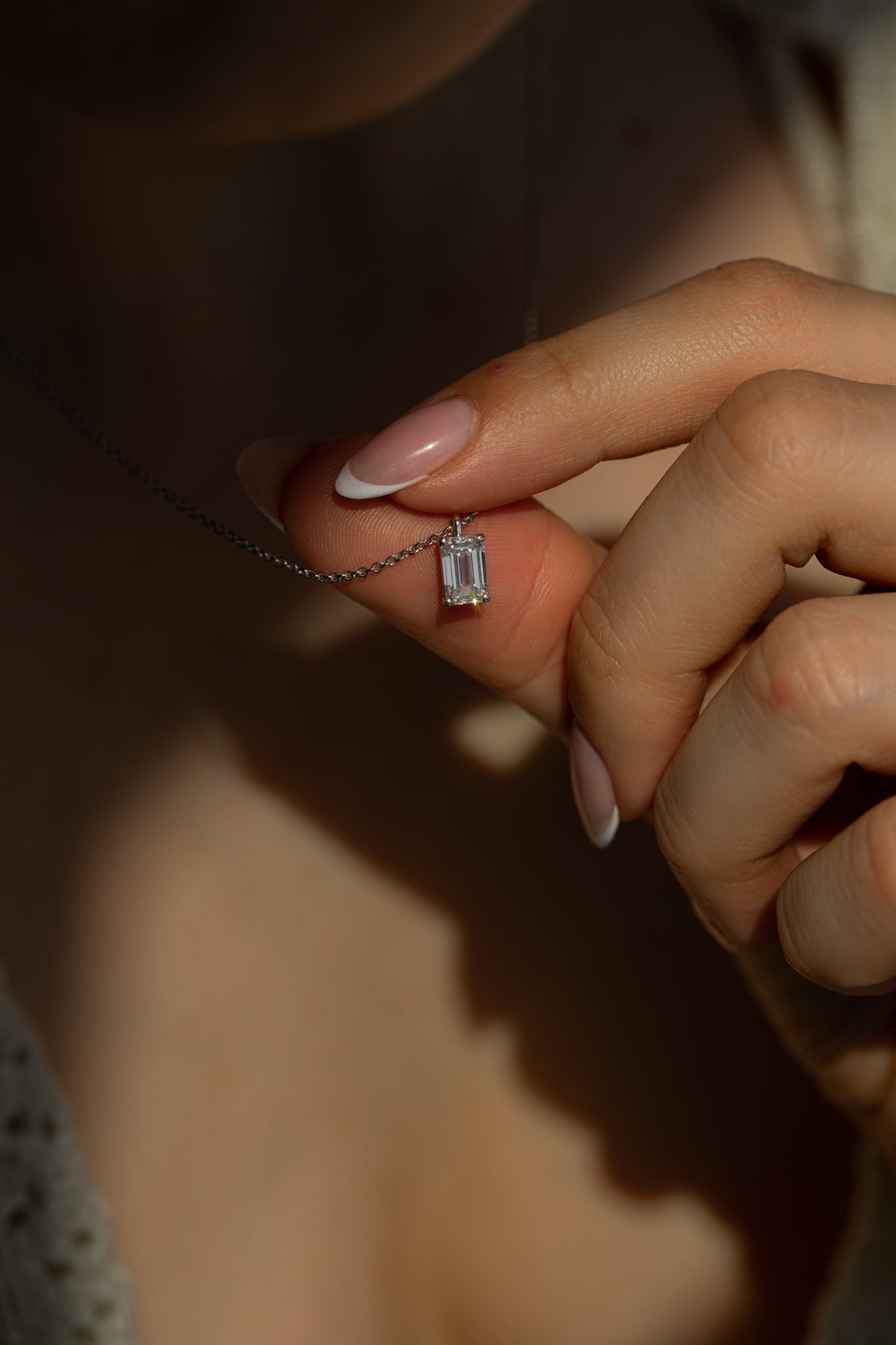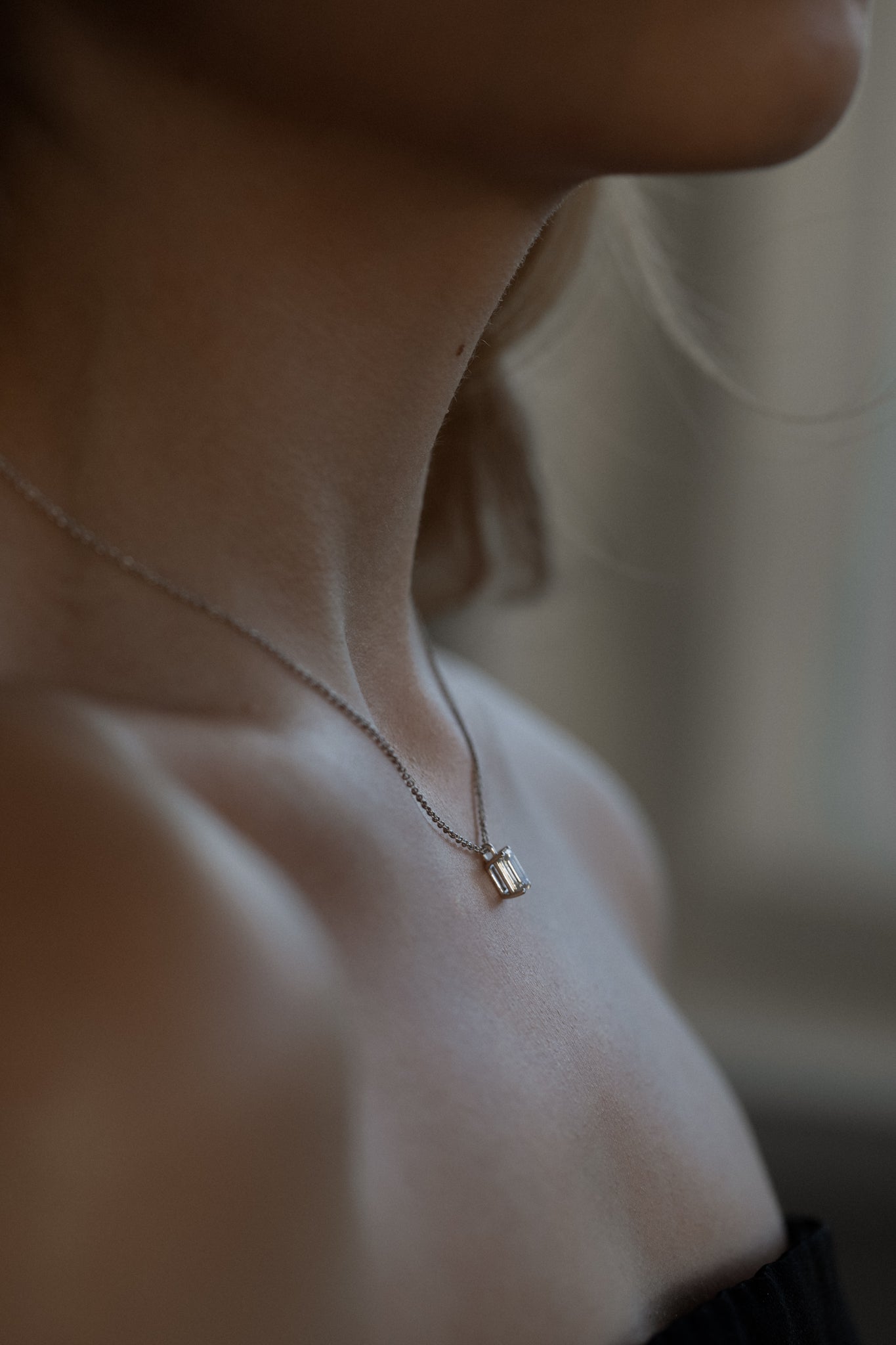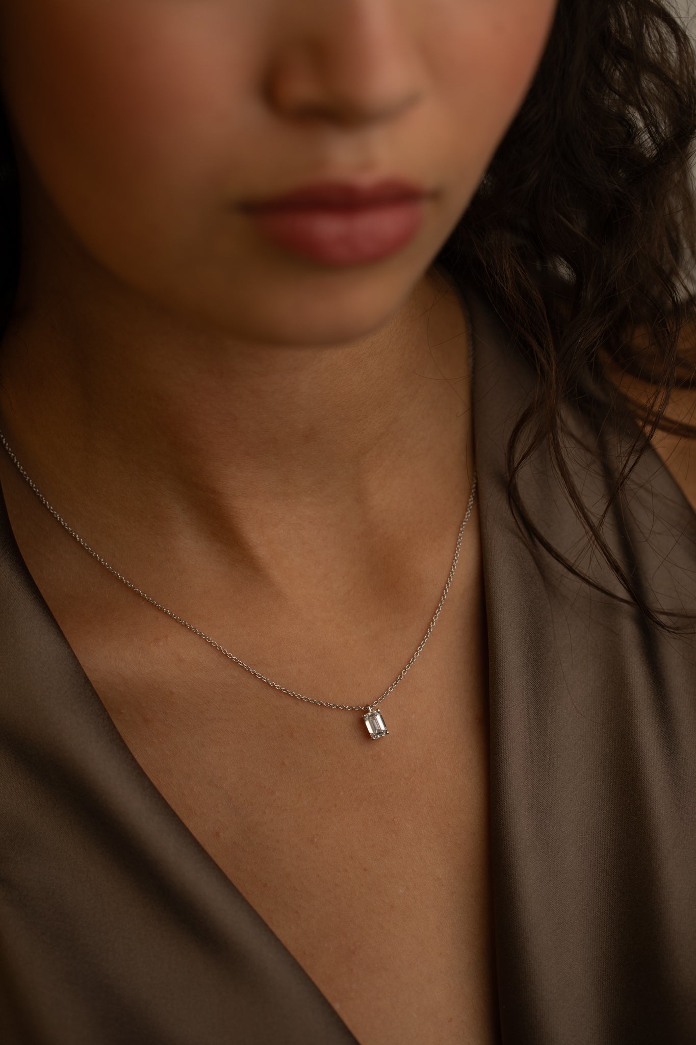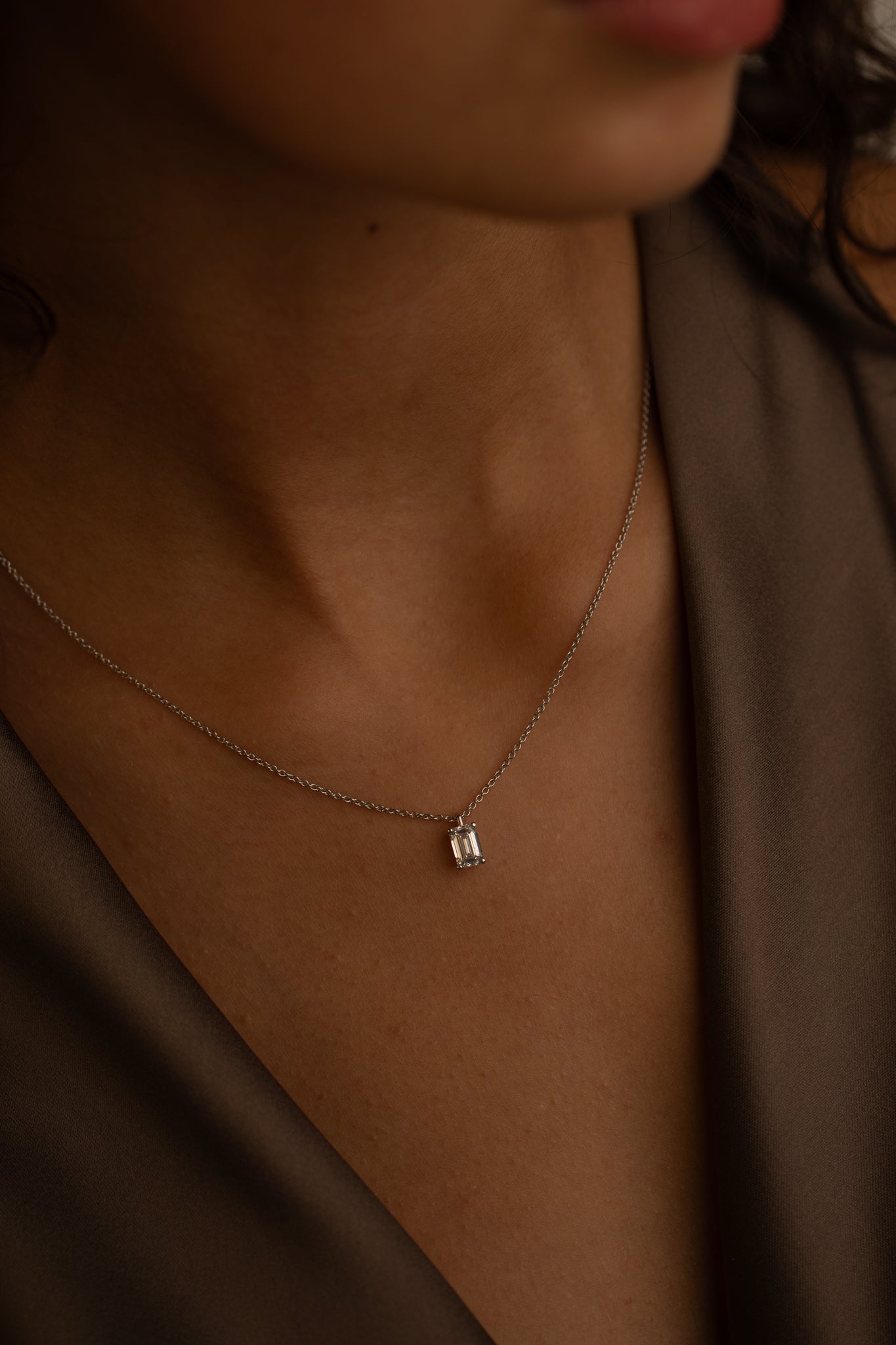 The Emerald Diamond Pendant Necklace offers modern elegance with a sustainably crafted emerald-cut diamond in a classic 18K gold setting.
