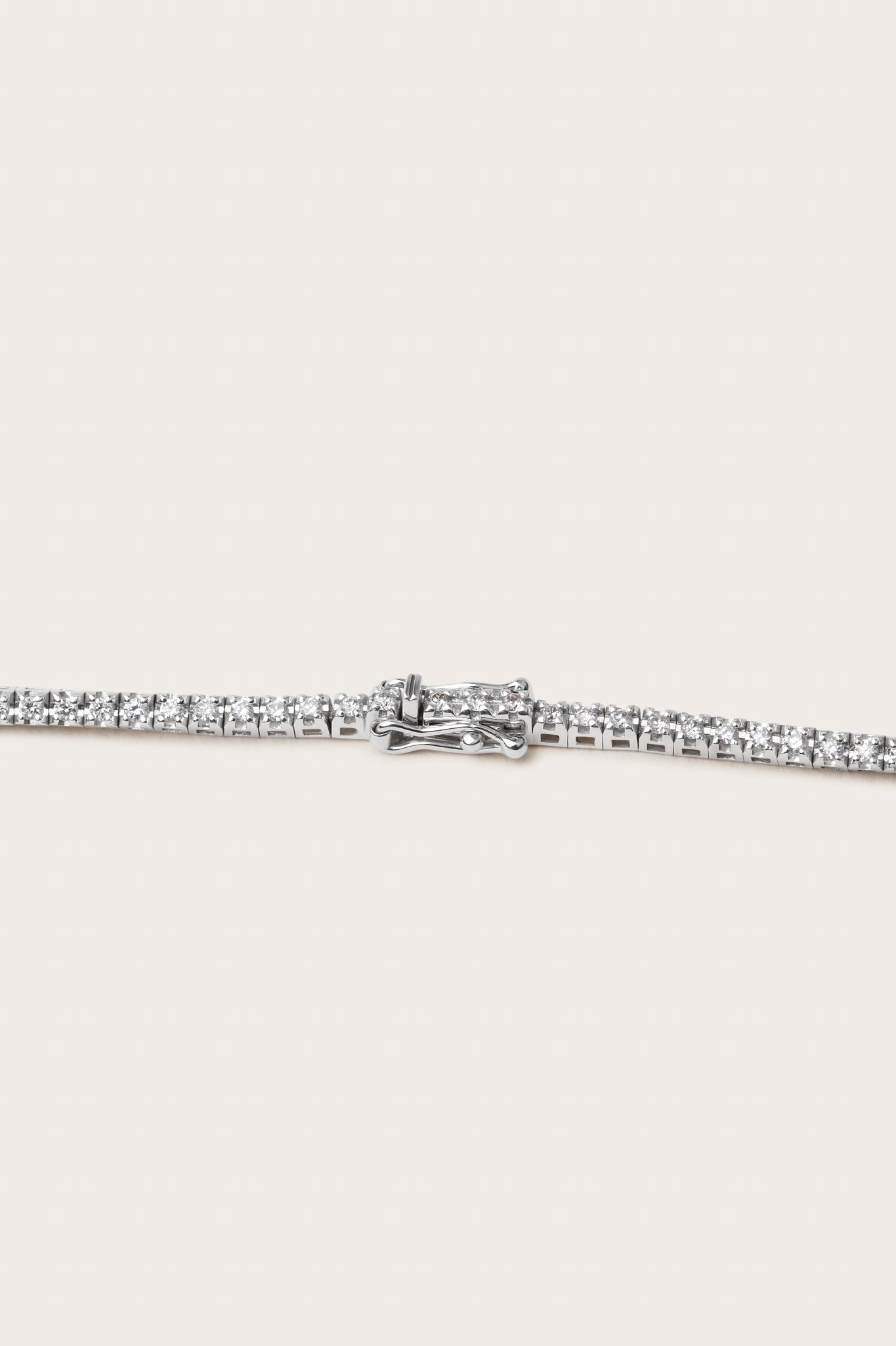 The Tennis Necklace is all about superior quality and elegant simplicity. Created with 18-karat solid white gold, the necklace has over 150 round brilliant-cut diamonds in a beautiful row. It is fastened with a traditional push lock to ensure security without compromising the classic design.