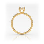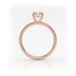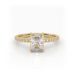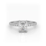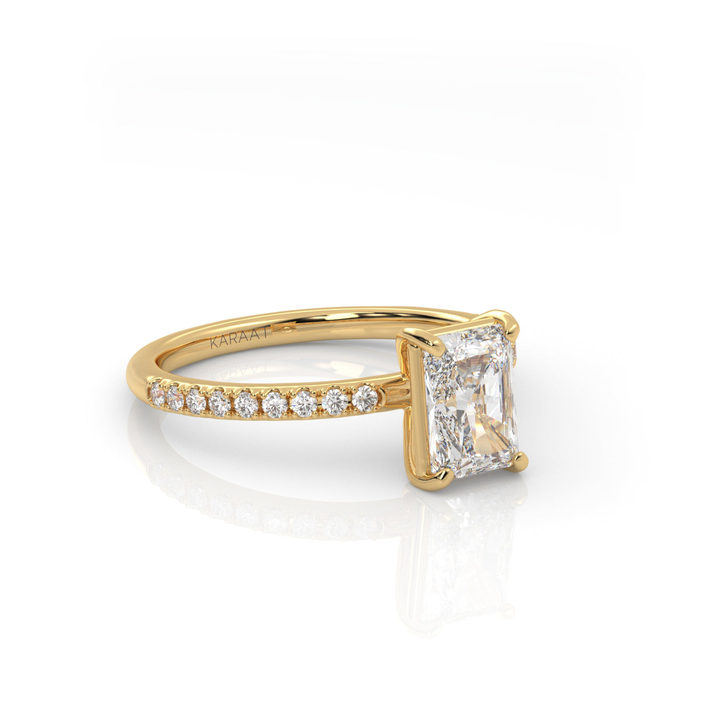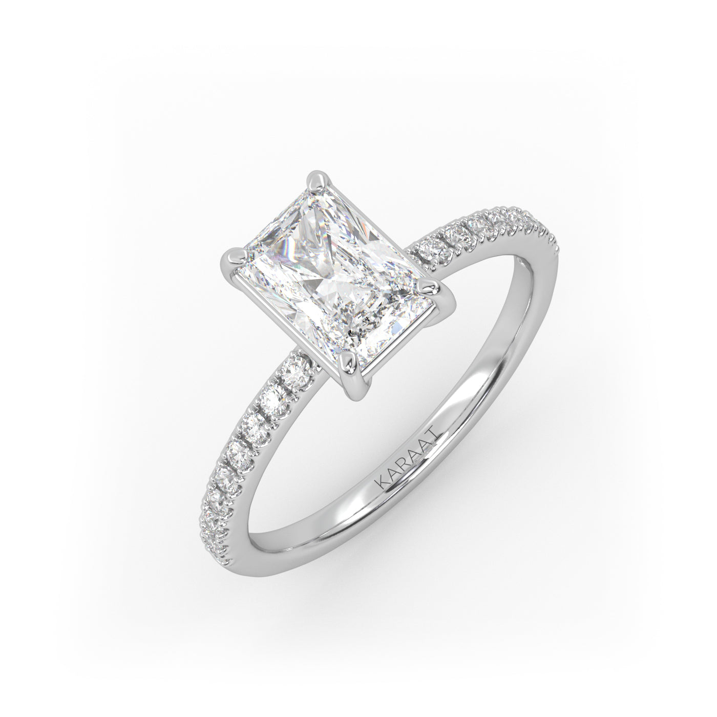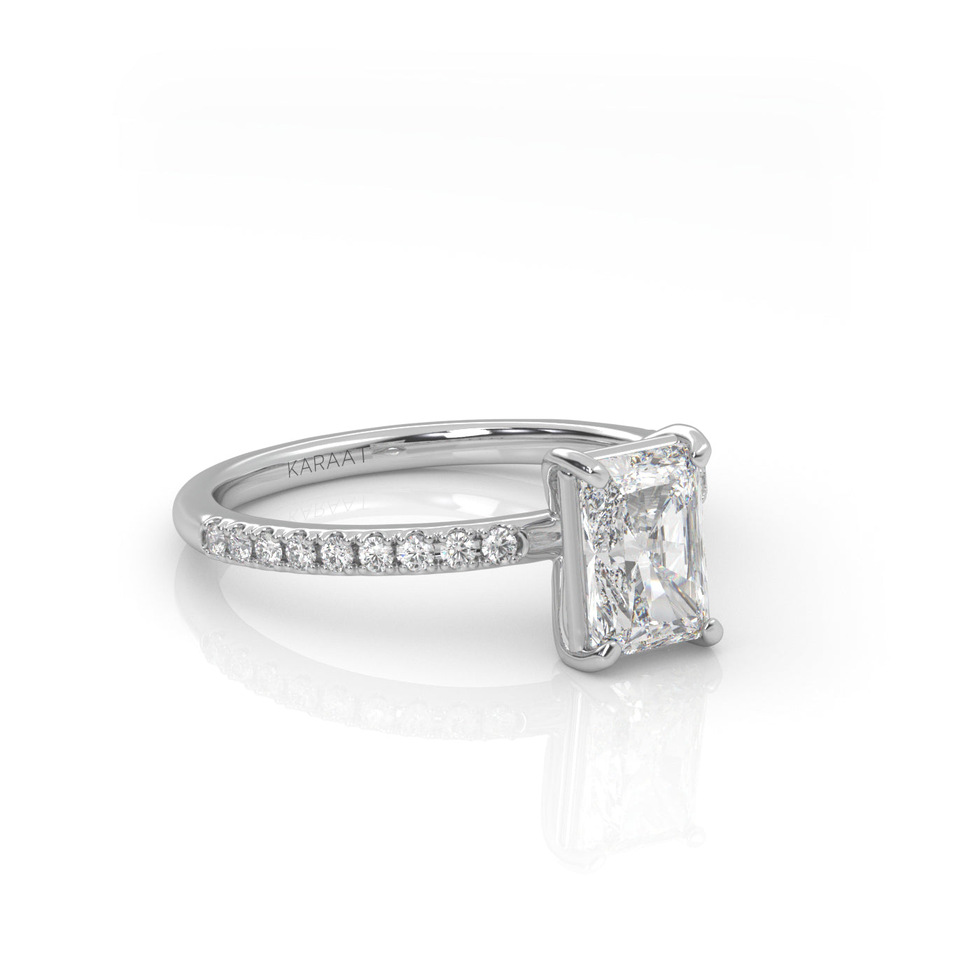 The Radiant Solitaire diamond ring with Pavé band is a timeless engagement ring that adds a stunning sparkle with pavé-set diamonds. Designed to maximize light, the sustainably created radiant-cut diamond is set high to ensure your center stone shines brightly.