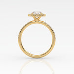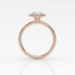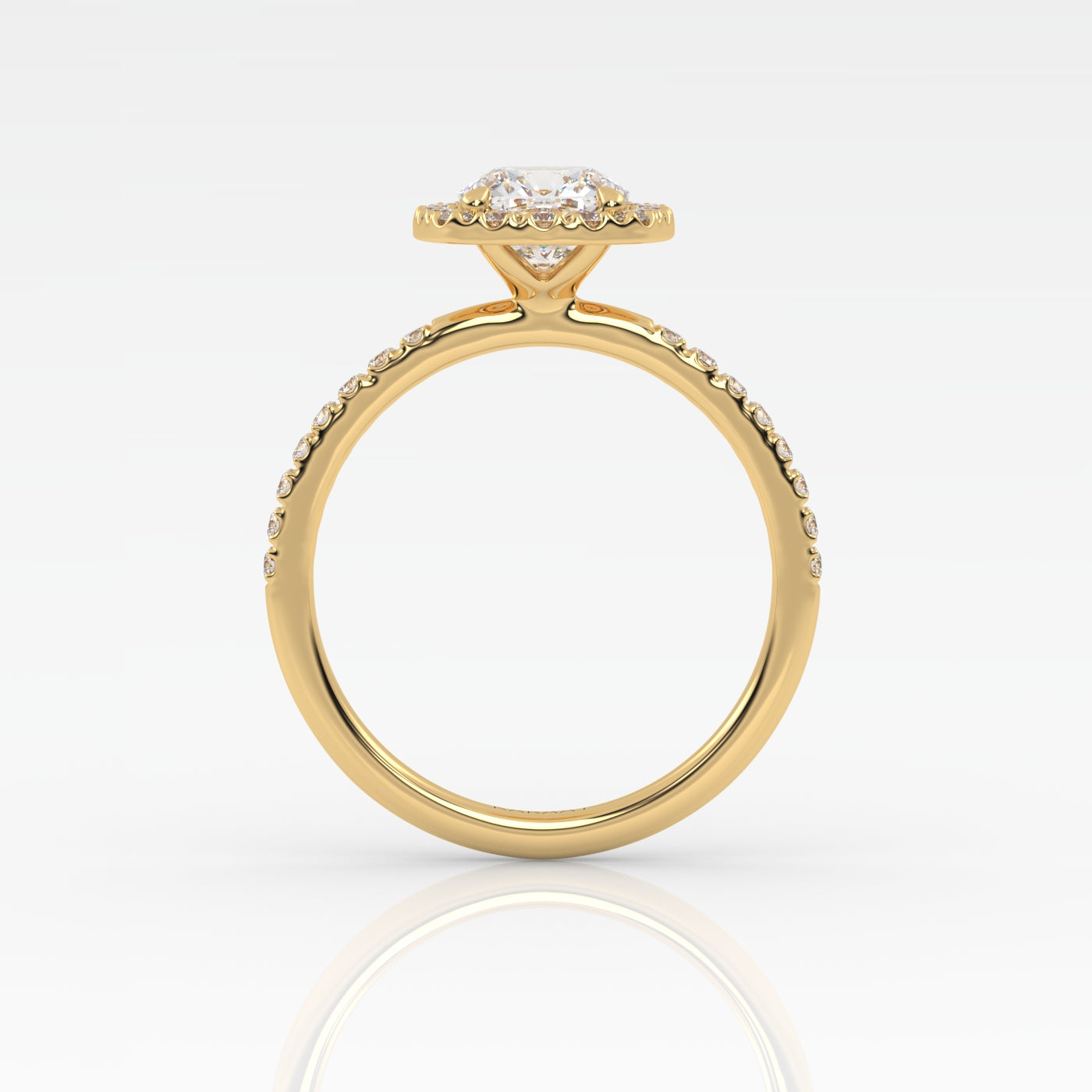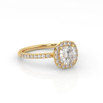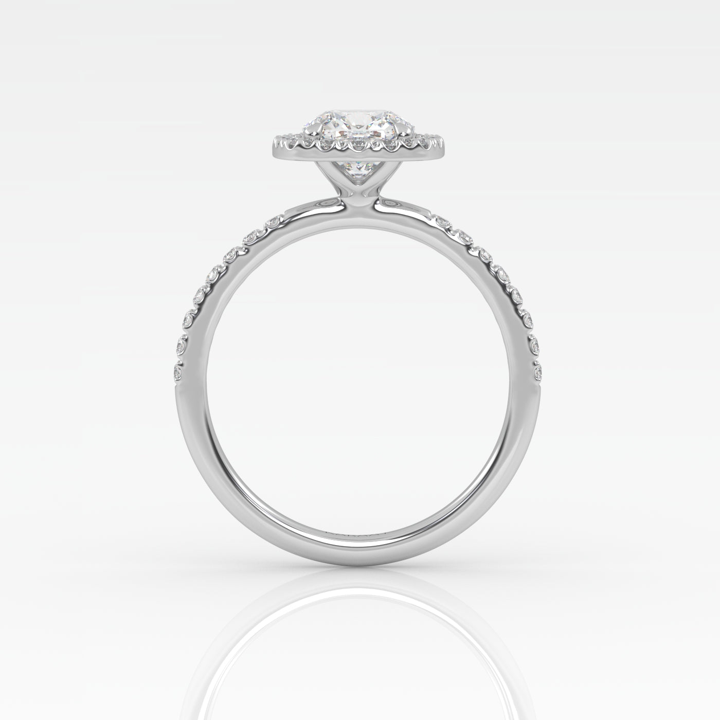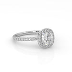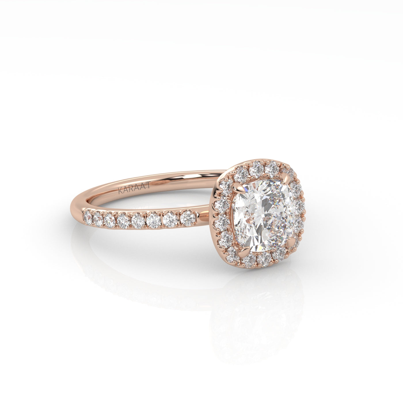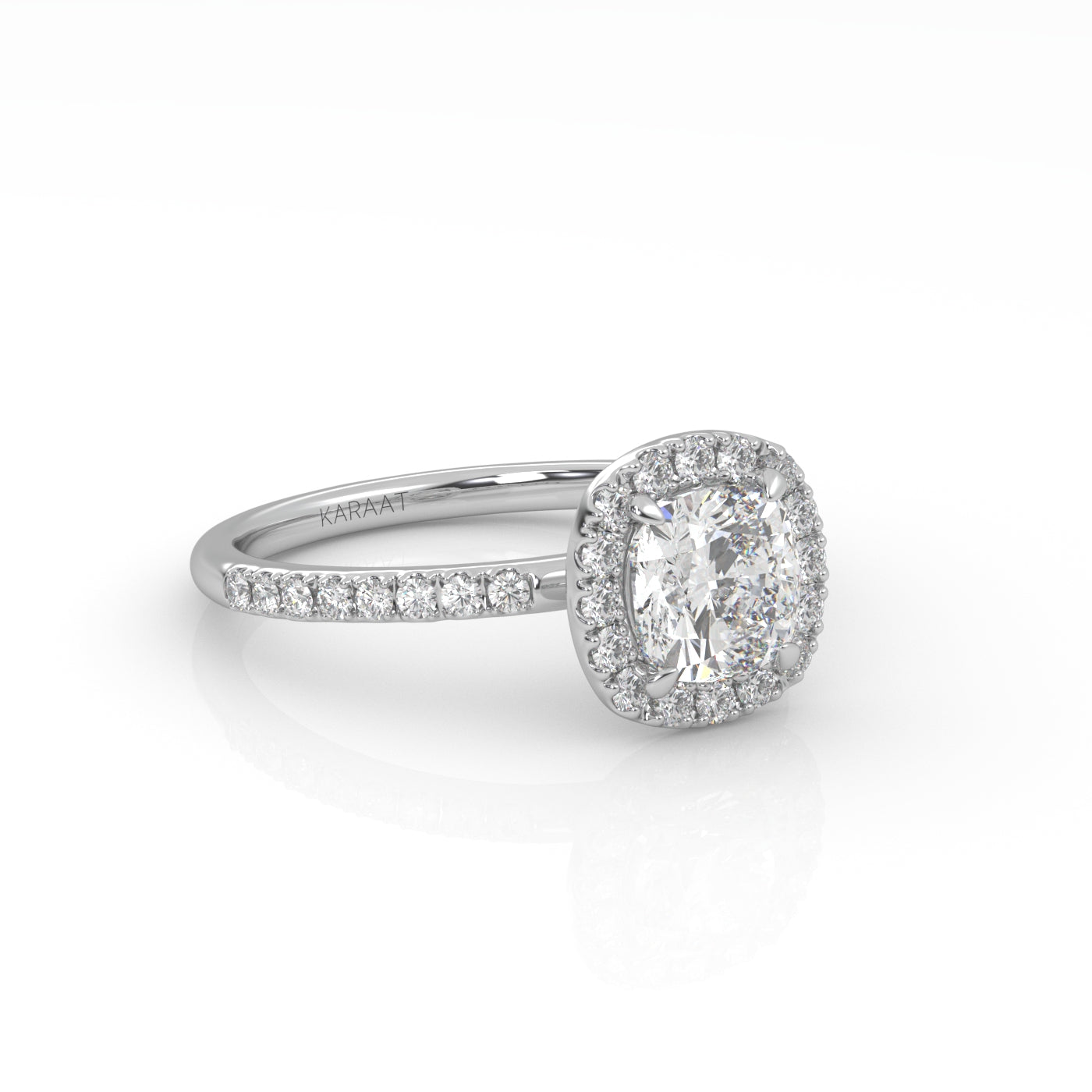The Cushion Solitaire diamond ring with Pavé band and Halo combines luxurious elements, exuding opulent romance. Known for its vibrant fire, the cushion cut emits colorful flashes and adds vintage charm, while the sustainably created center stone is set high to maximize brilliance.