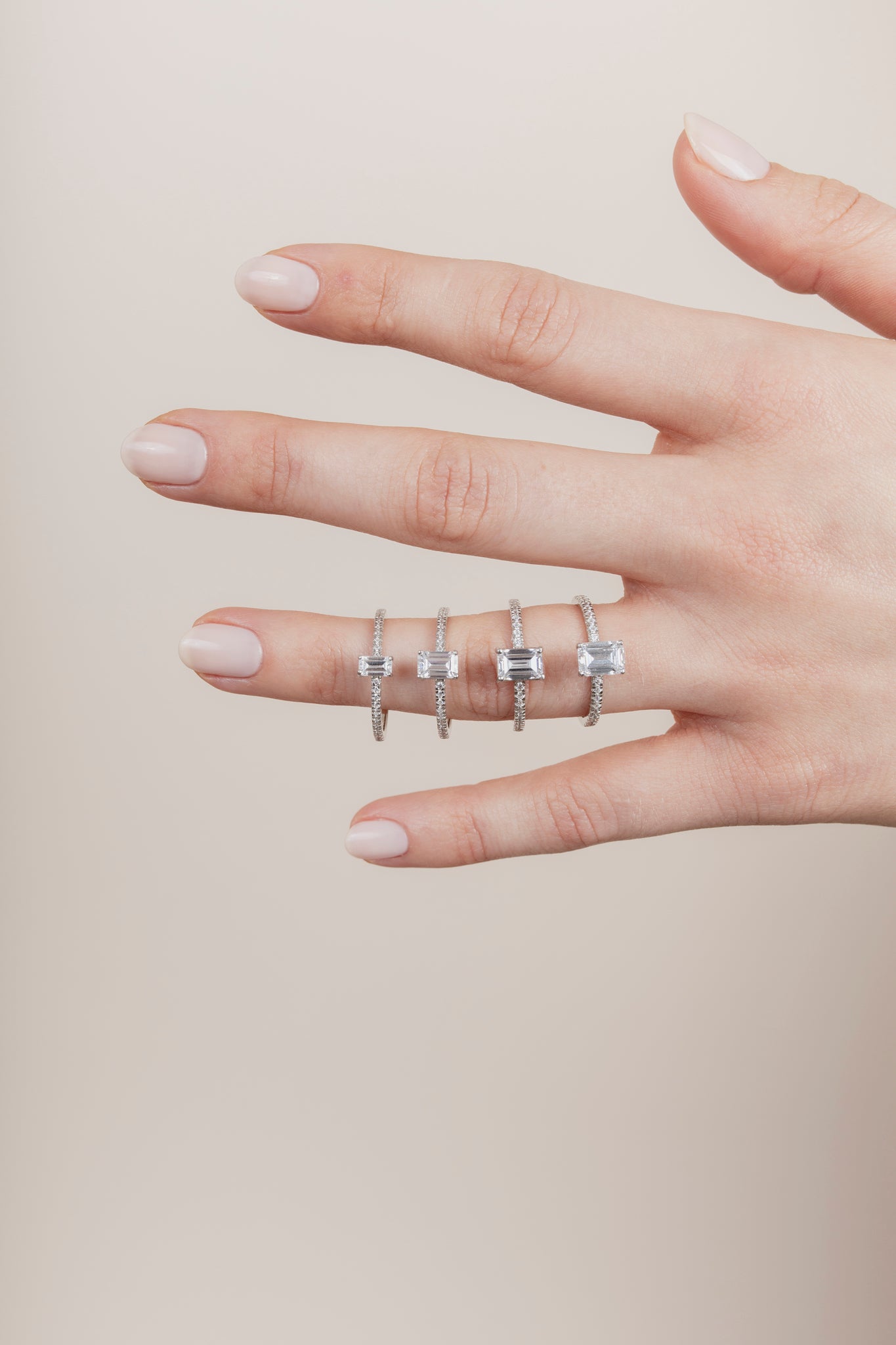 The Emerald Solitaire diamond ring with Pavé band is a sophisticated engagement ring with added sparkle in the form of pavé-set diamonds in the band. The rectilinear, step-cut facets of the center stone shift focus from brilliance to clarity, creating a clean, open look. Designed to draw in light so your diamond shines bright in its setting, the sustainably created emerald-cut diamond is set high and fits a ring of equal thickness - such as our Pavé Diamond Ring - next to it.