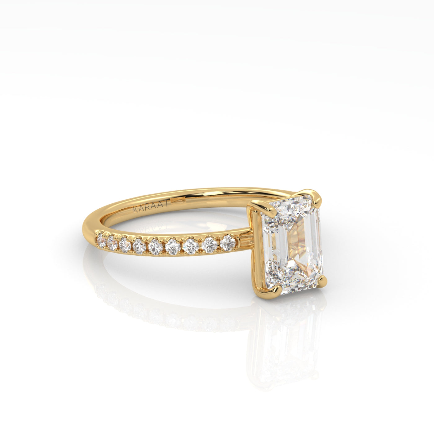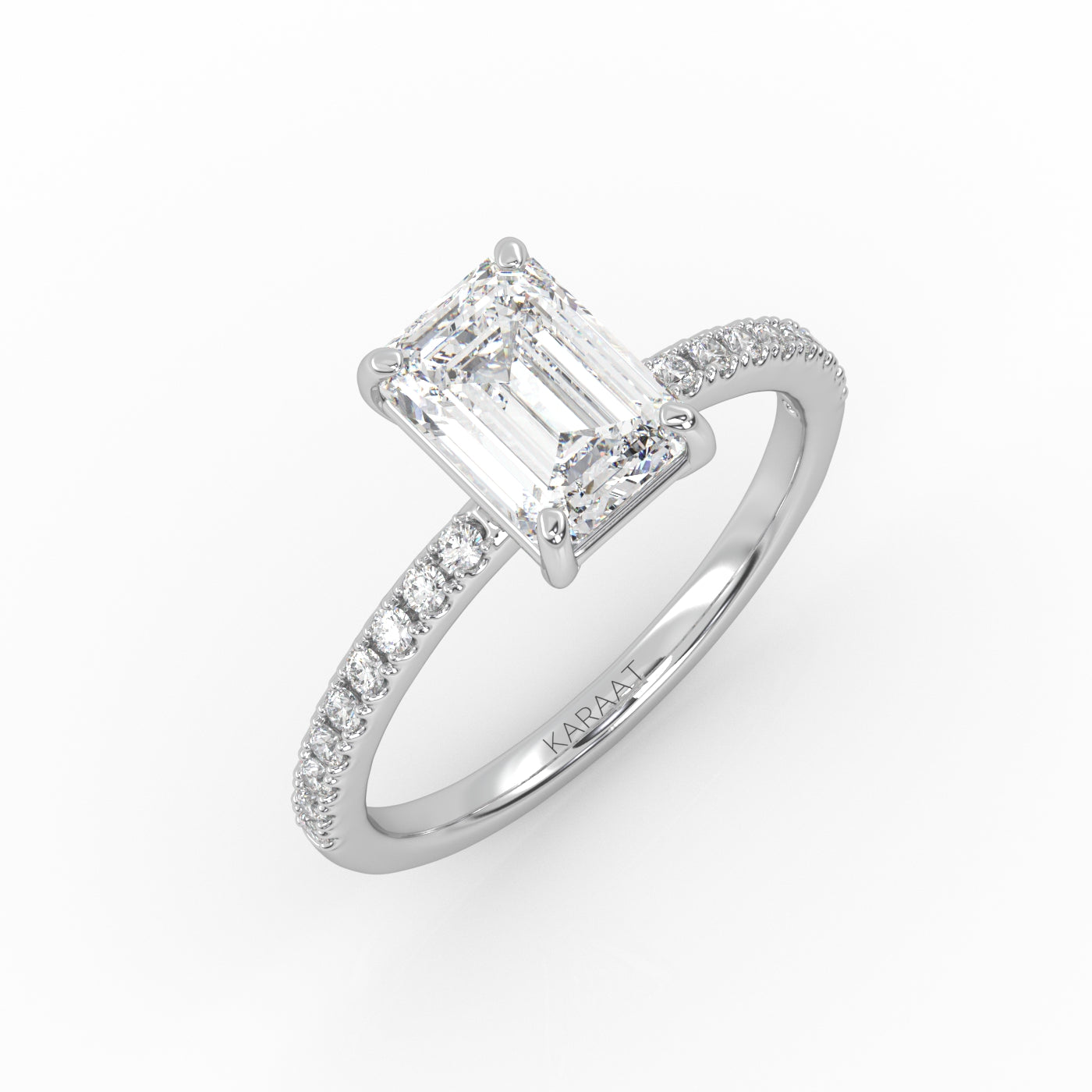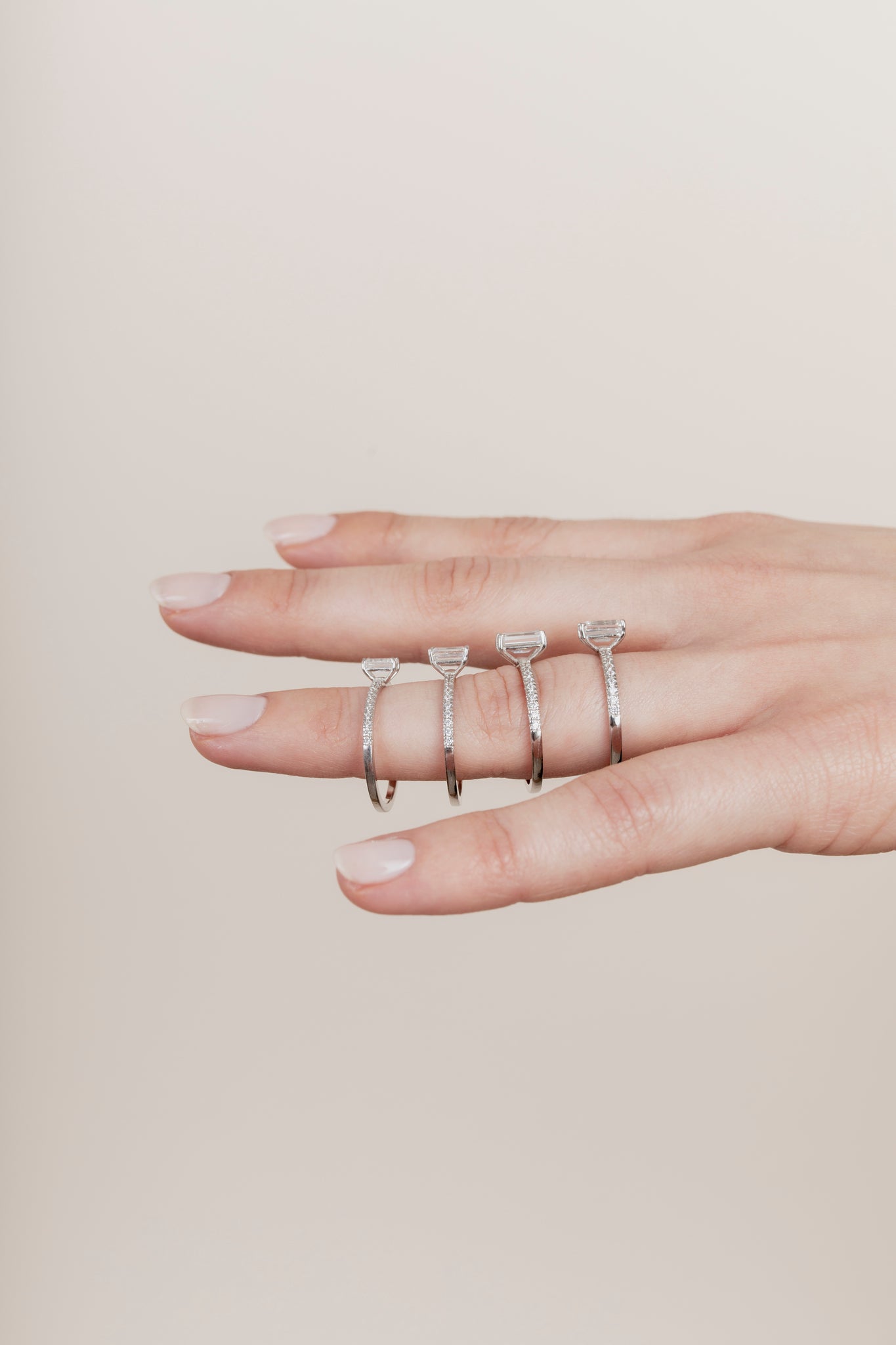 The Emerald Solitaire diamond ring with Pavé band exudes sophistication with its pavé-set diamonds. The rectilinear step-cut facets highlight clarity, while the sustainably created emerald-cut diamond is set high to maximize light and shine.