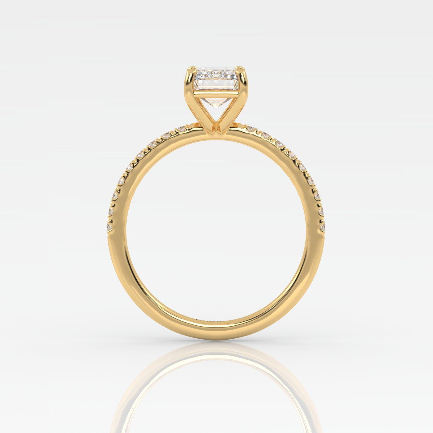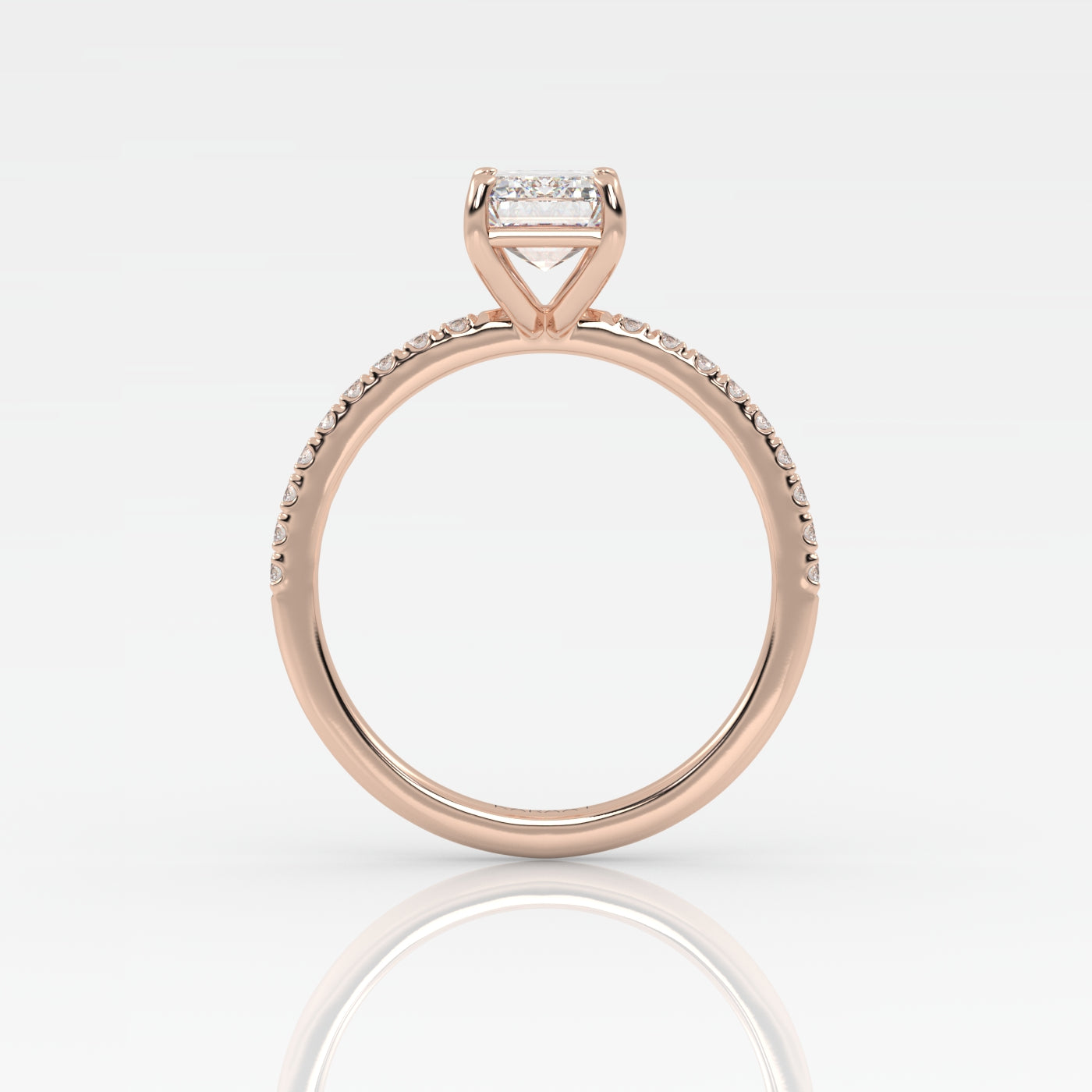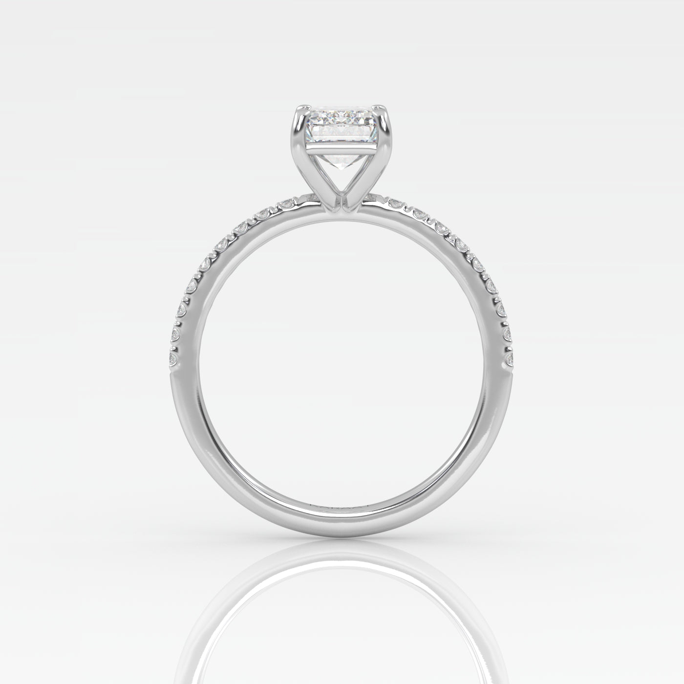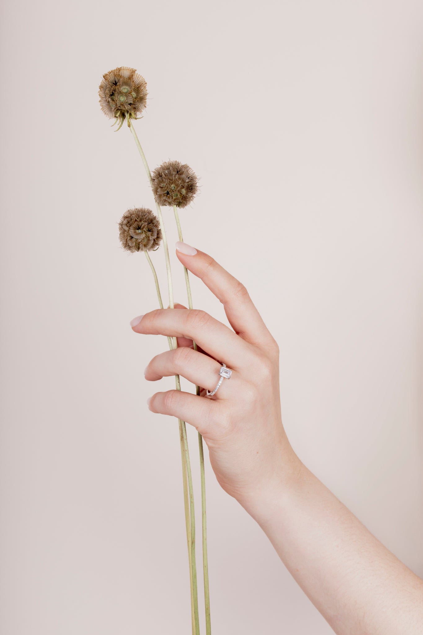 The Emerald Solitaire diamond ring with Pavé band exudes sophistication with its pavé-set diamonds. The rectilinear step-cut facets highlight clarity, while the sustainably created emerald-cut diamond is set high to maximize light and shine.