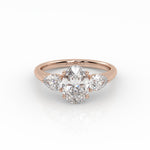 The Oval Trilogy diamond ring symbolizes the past, present, and future. Featuring two pear-cut side stones that enhance the brilliance of the oval center stone, this modern three-stone setting allows light to shine through, beautifully showcasing your unique story.