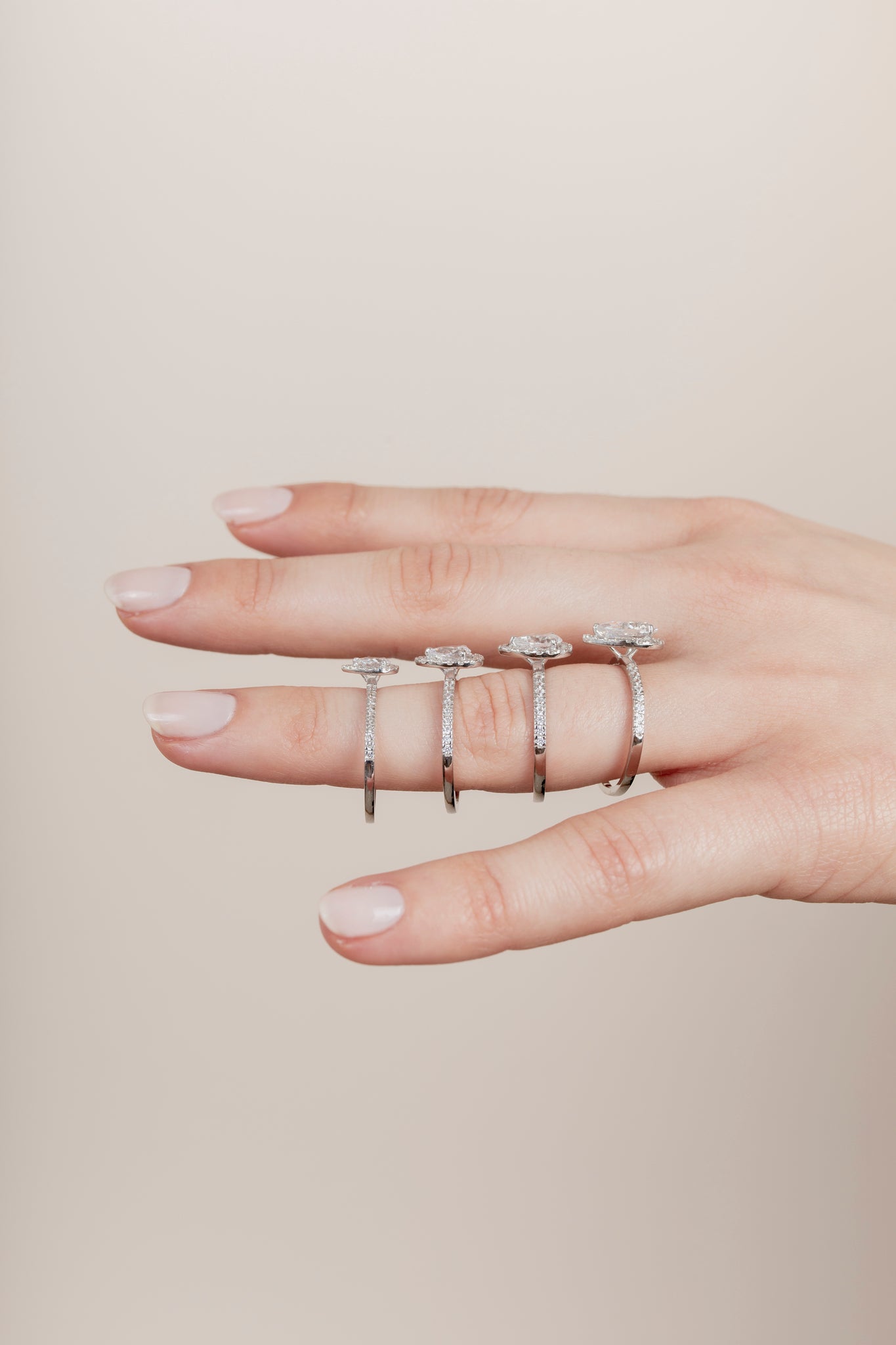 Shown with a 1-carat center stone. Model is wearing rings with 0.25, 0.5, 0.75 and 1ct center stones.