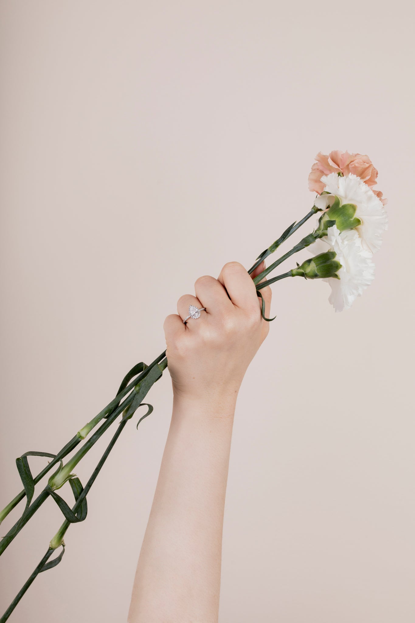 The Pear Solitaire diamond ring with pavé band and Halo is bold, unique and a fit for those who seek playful sophistication. With a rounded end and tapered shape, the teardrop-resembling diamond looks stunning with a halo that adds brilliance and volume to the ring. With beautiful pavé-set diamonds in the band, this ring has it all. Designed to draw in light so your diamond shines bright in its setting, the sustainably created pear-cut diamond is set high and fits a ring of equal thickness - such as our Pavé Diamond Ring - next to it.