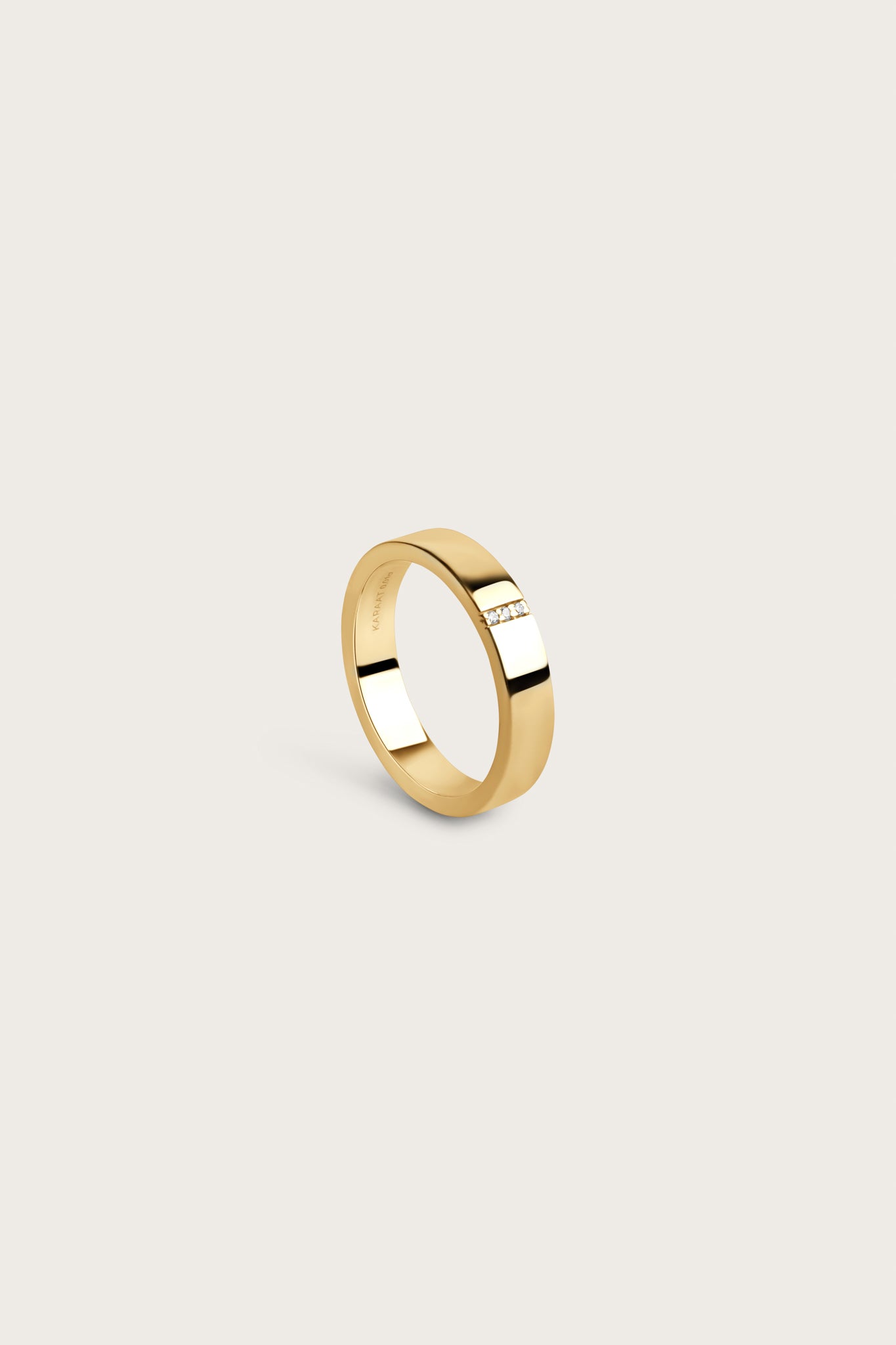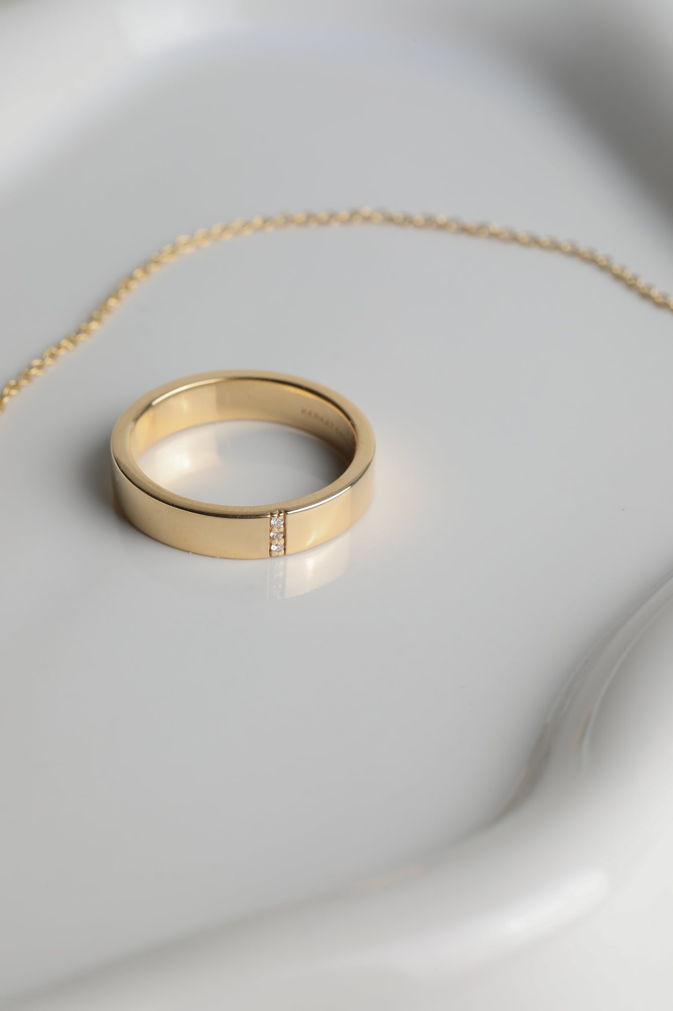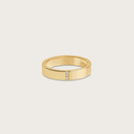 The Diamond Cigar Band blends bold structure with refined sparkle. Its sleek gold surface and vertical trio of diamonds create a modern, sculptural look that elevates any engagement ring pairing.