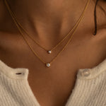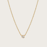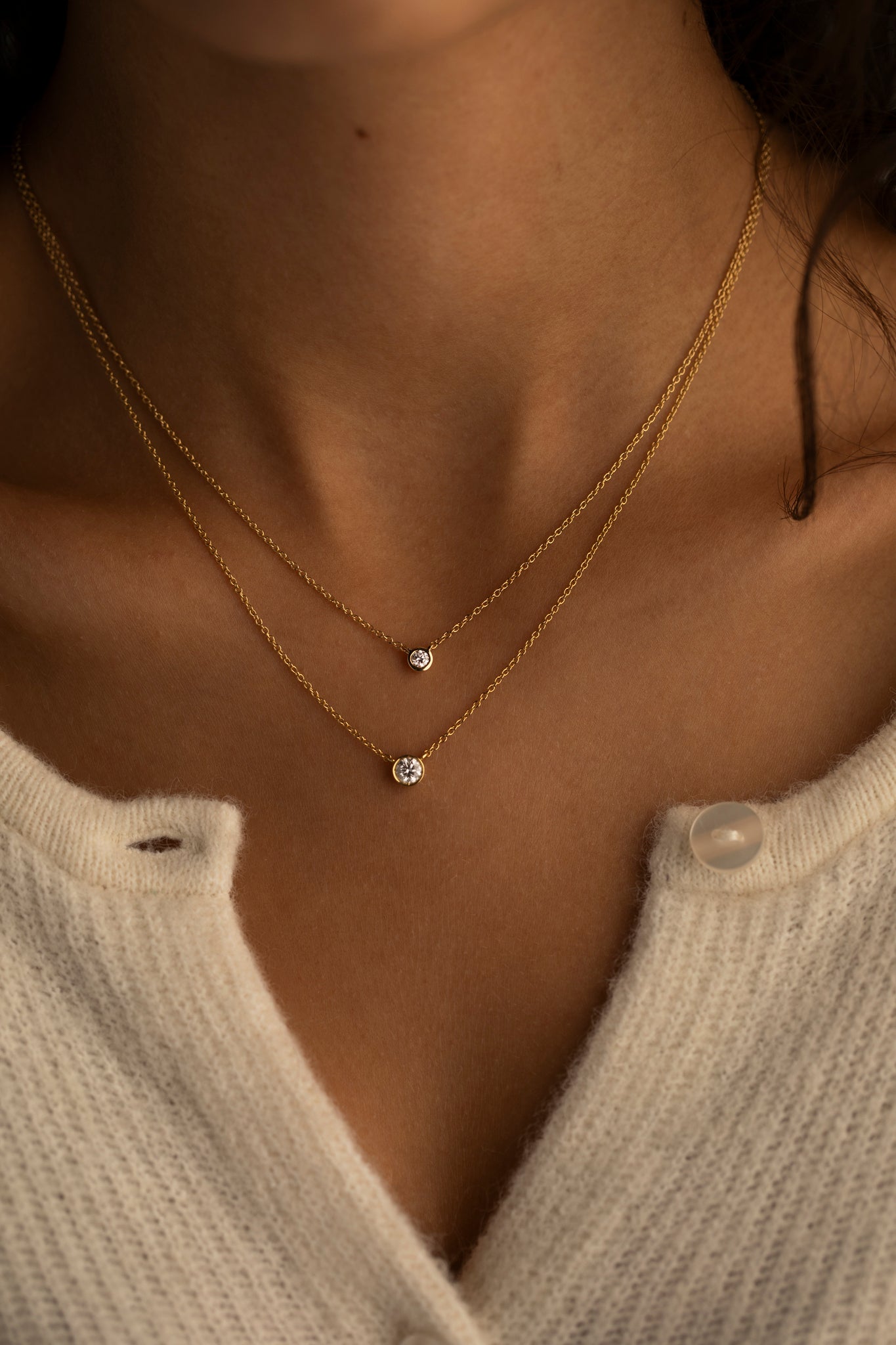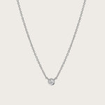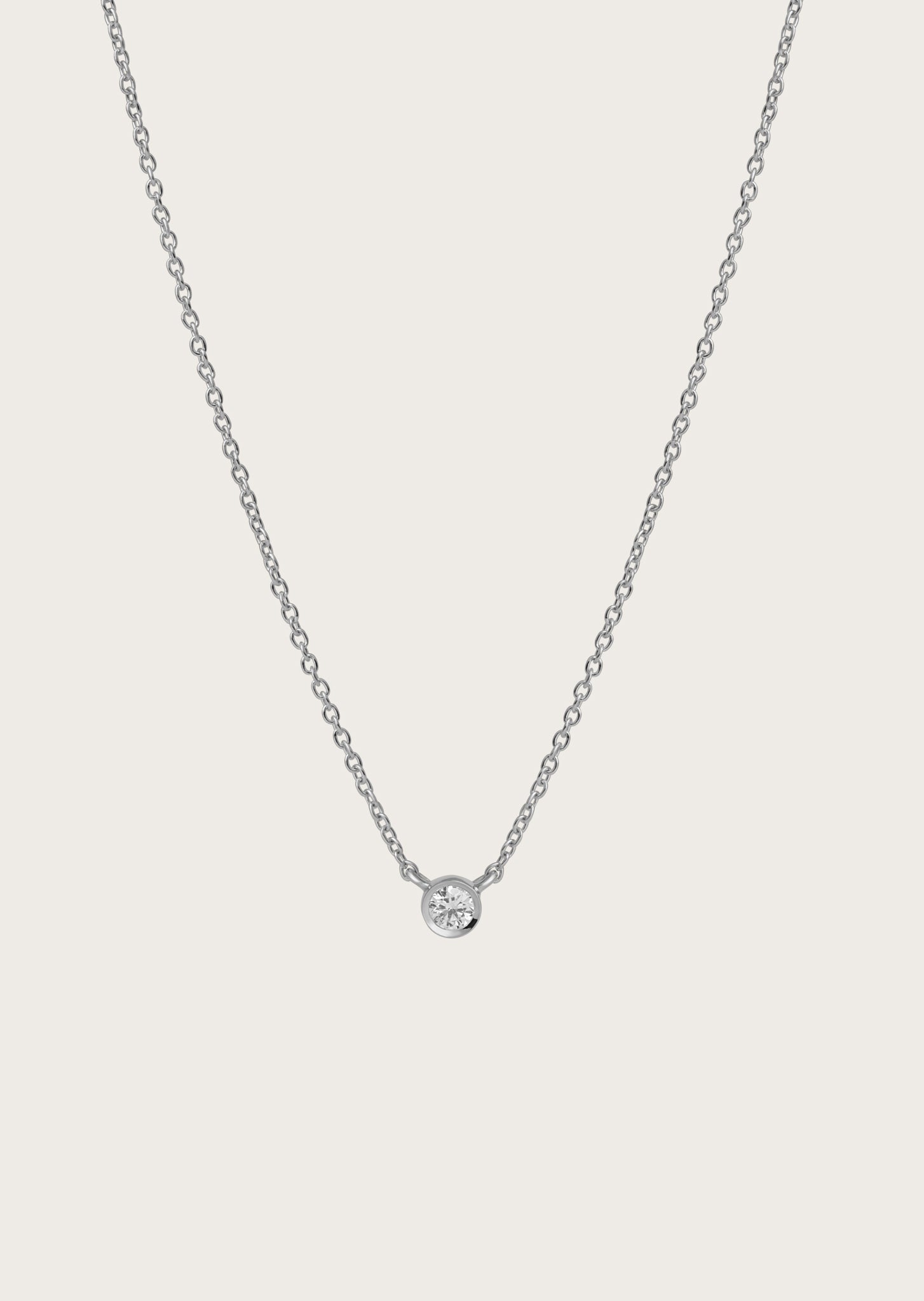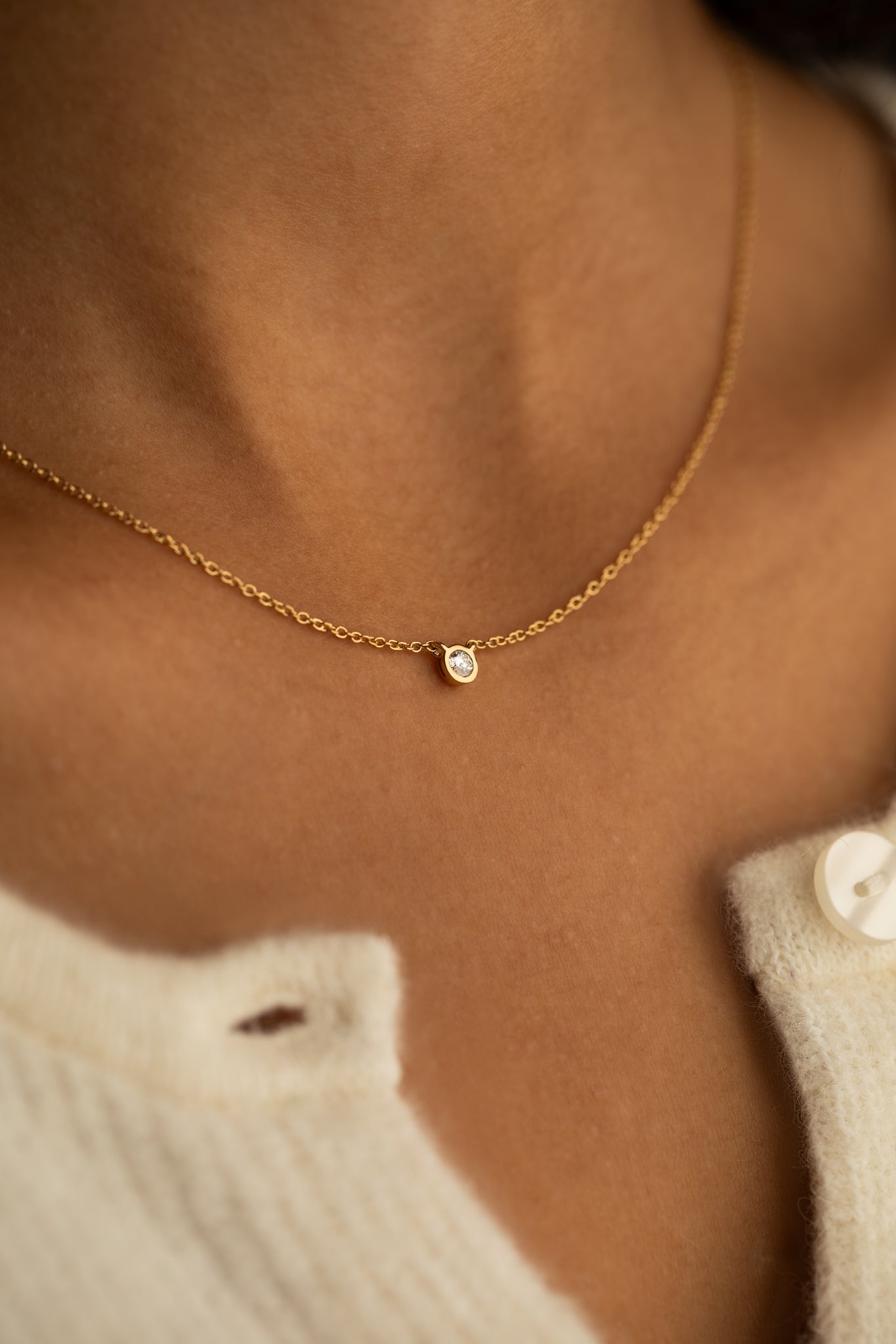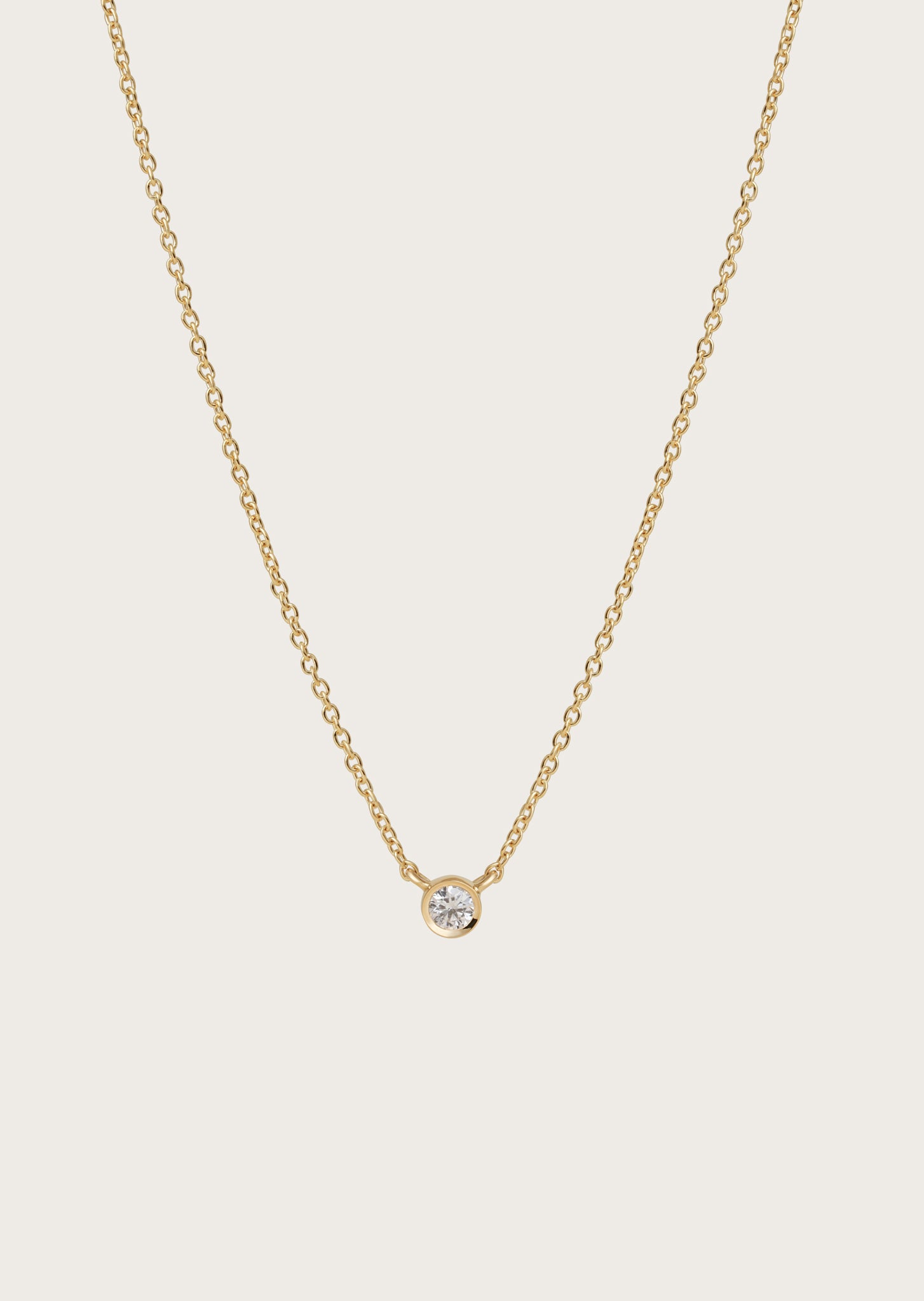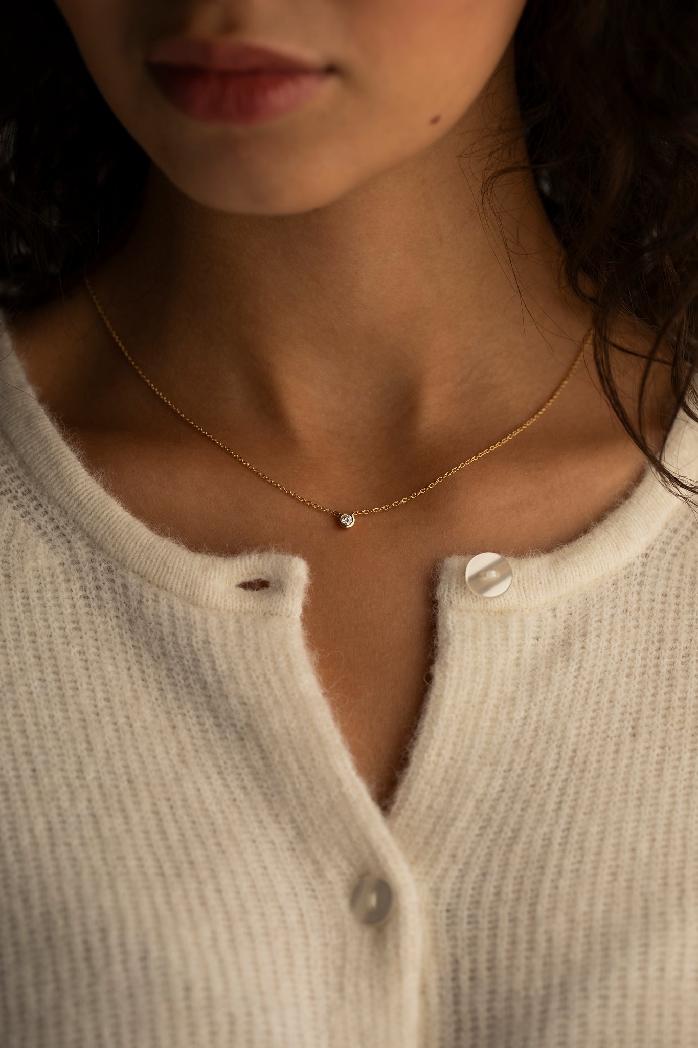 The Petite Bezel Necklace offers a dainty and versatile look, featuring a 0.1ct diamond set in a fine 18K gold chain, perfect for everyday wear.