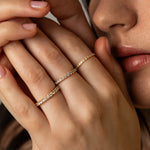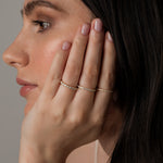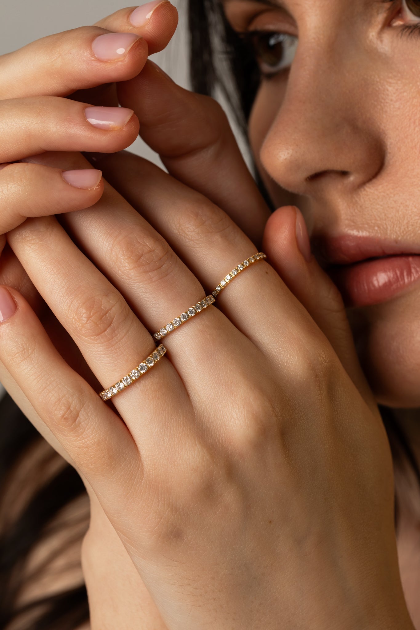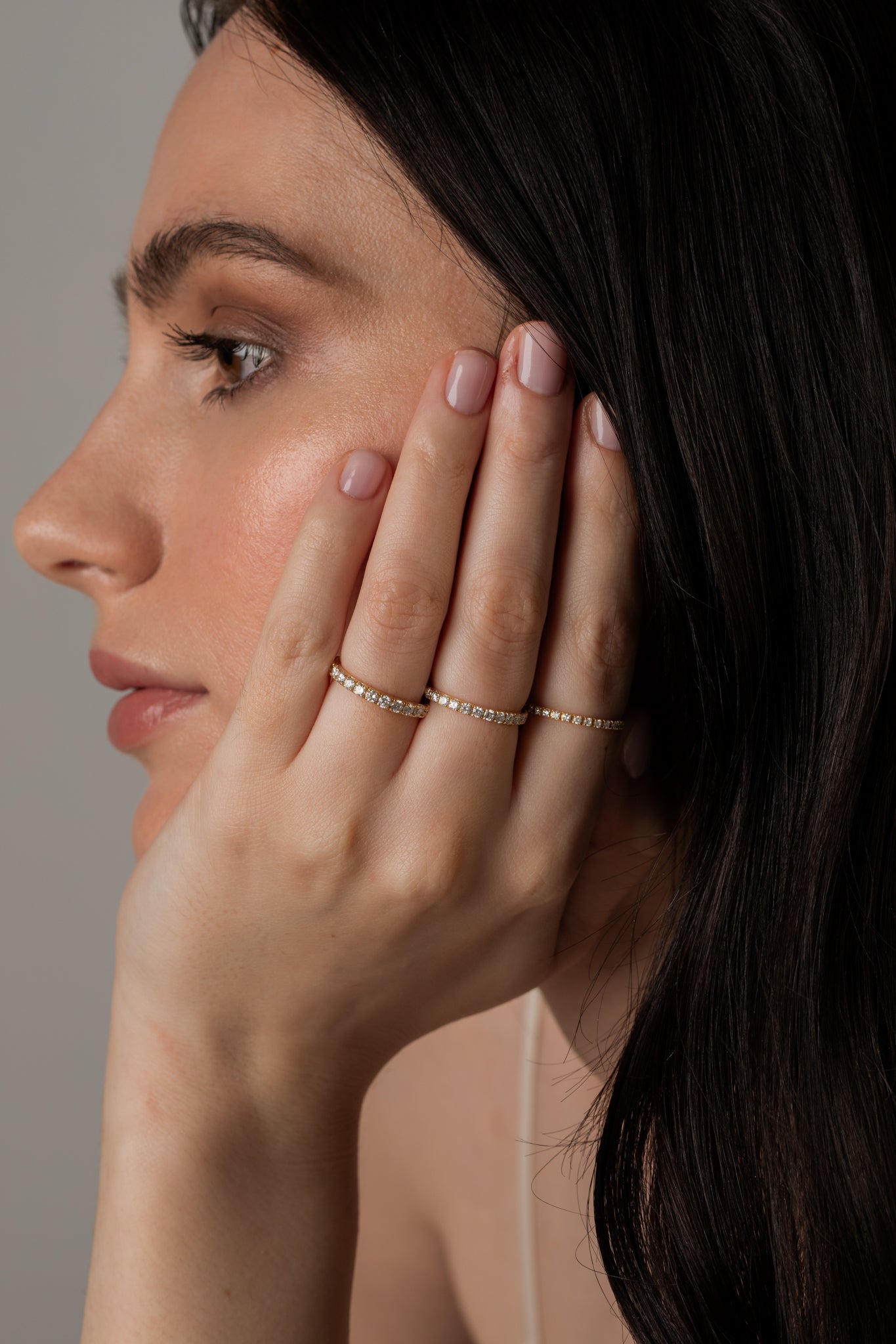 From left to right, model is wearing Pavé Diamond Ring III, Pavé Diamond Ring II, and Pavé Diamond Ring.