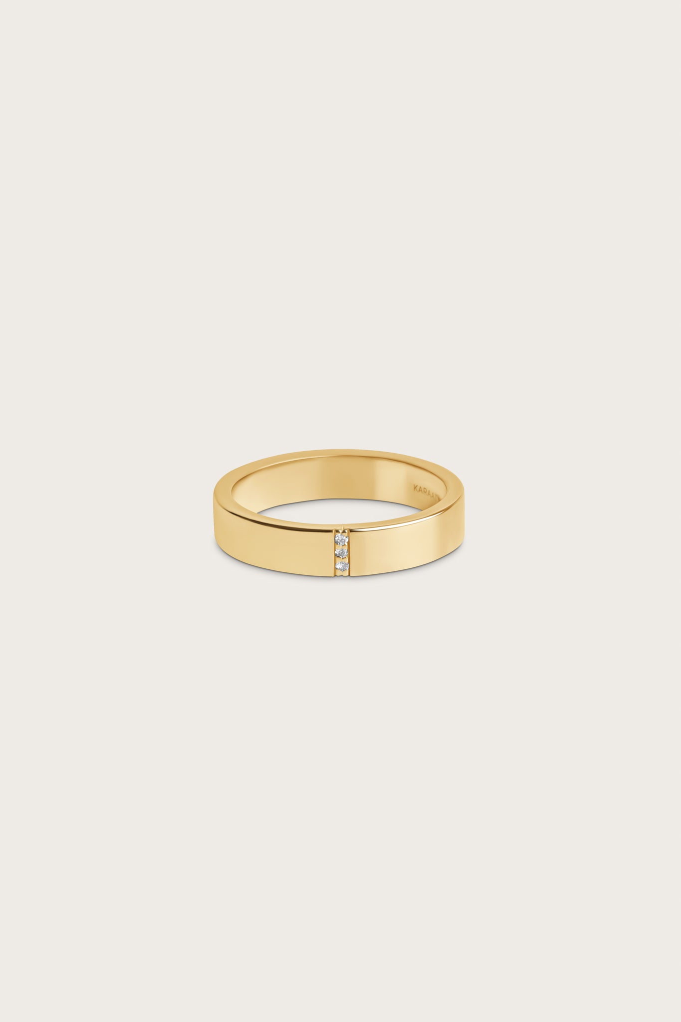 The Diamond Cigar Band blends bold structure with refined sparkle. Its sleek gold surface and vertical trio of diamonds create a modern, sculptural look that elevates any engagement ring pairing.