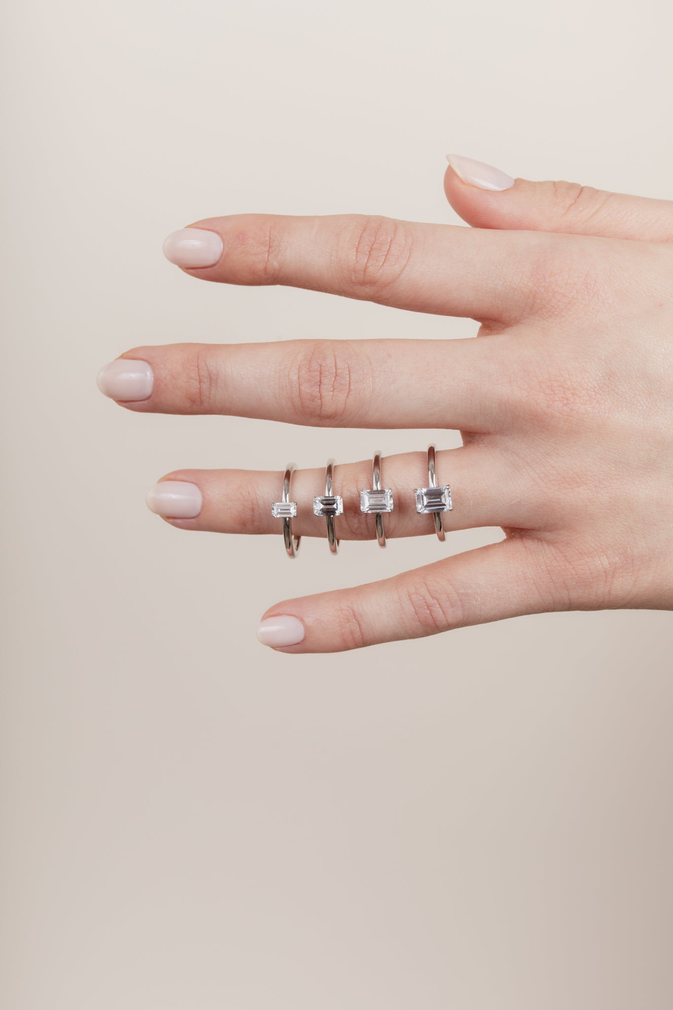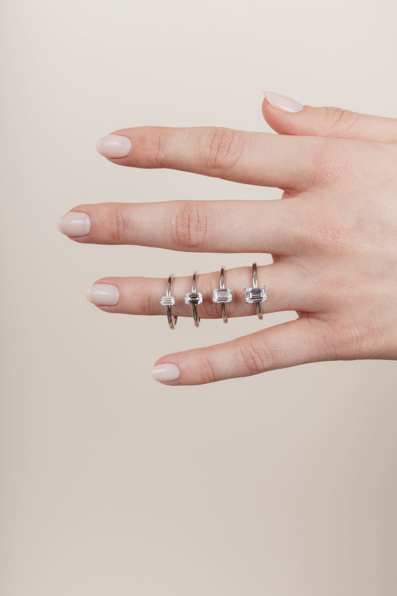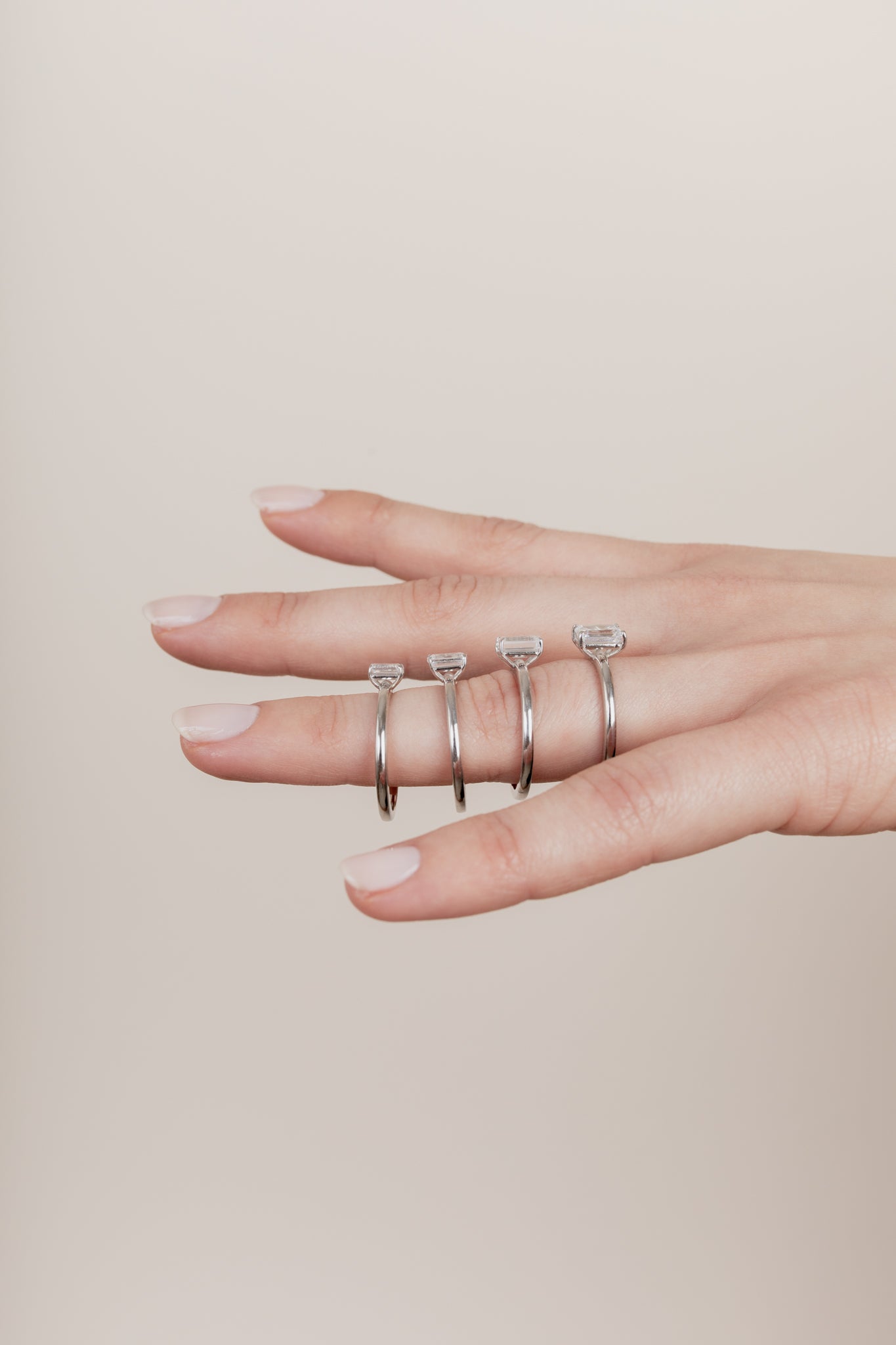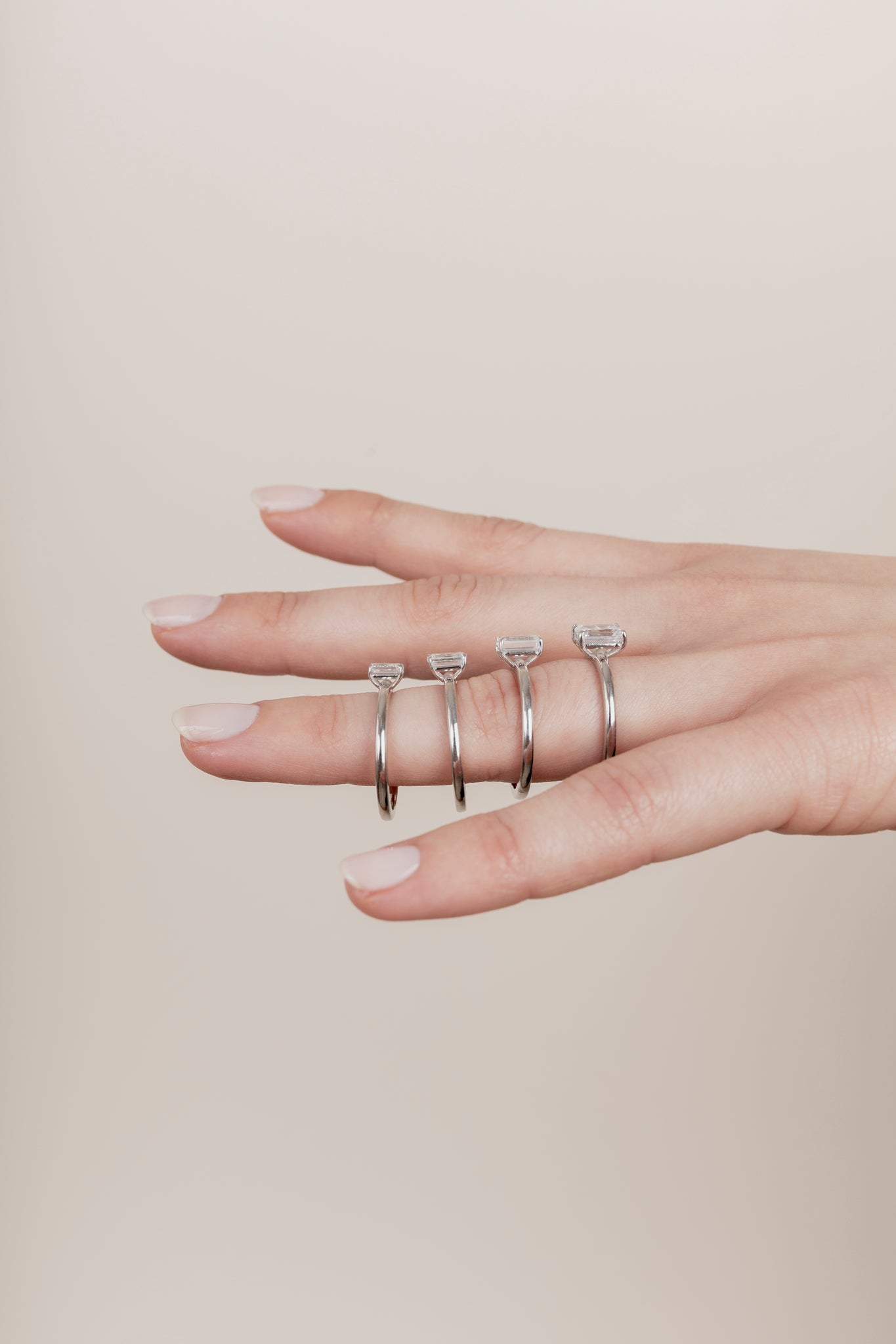 Shown with a 1-carat center stone. Model is wearing rings with 0.25, 0.5, 0.75 and 1ct center stones.