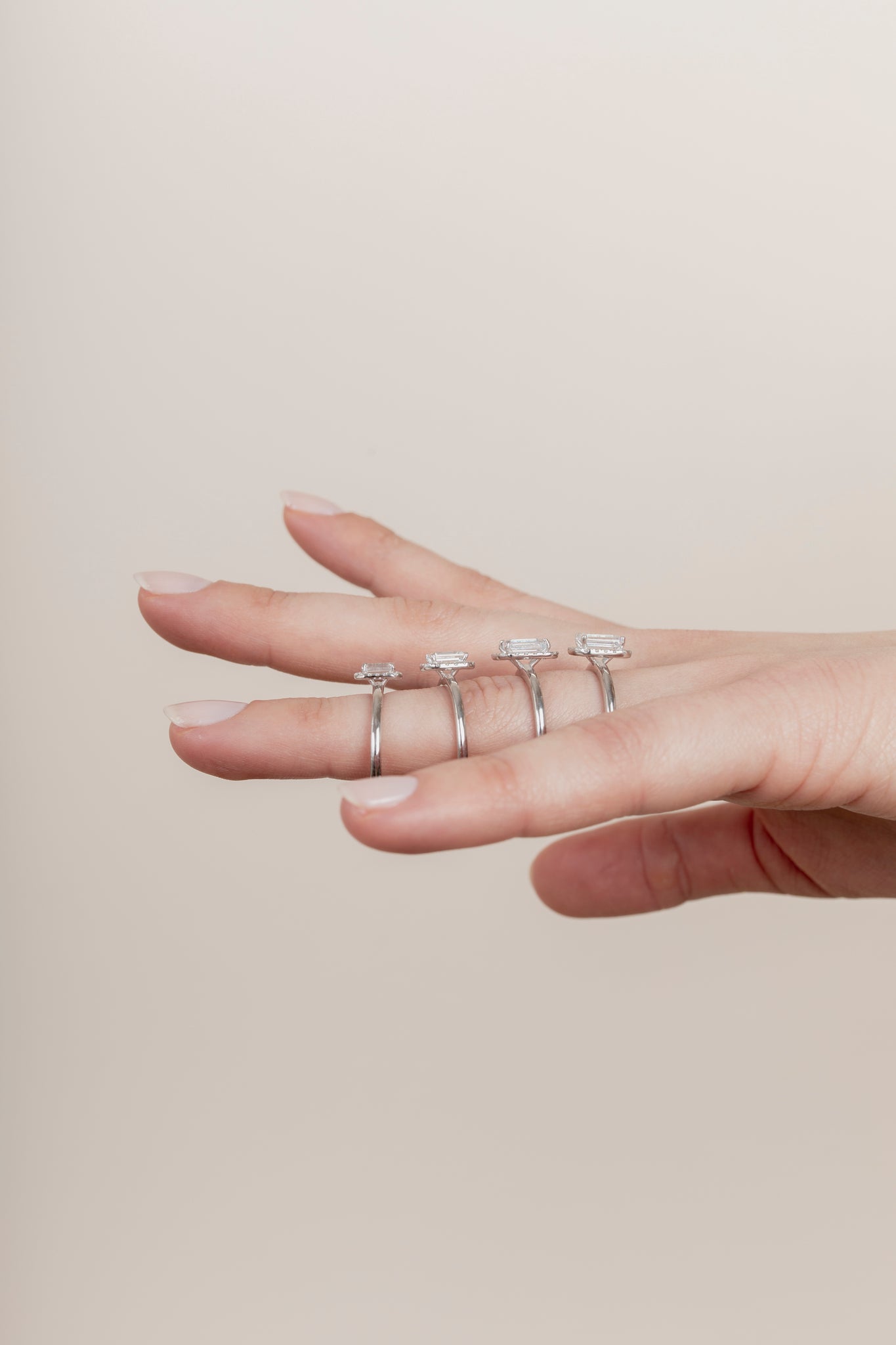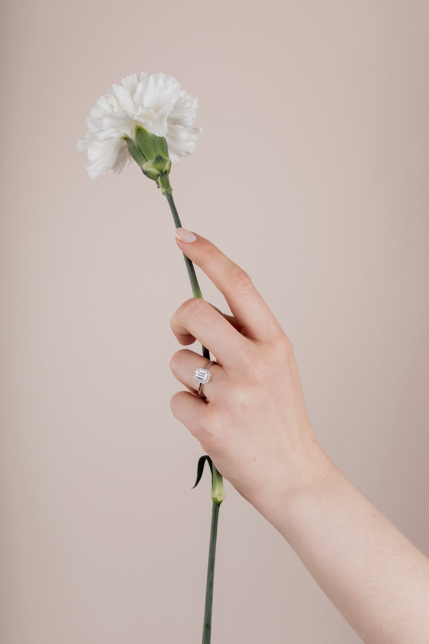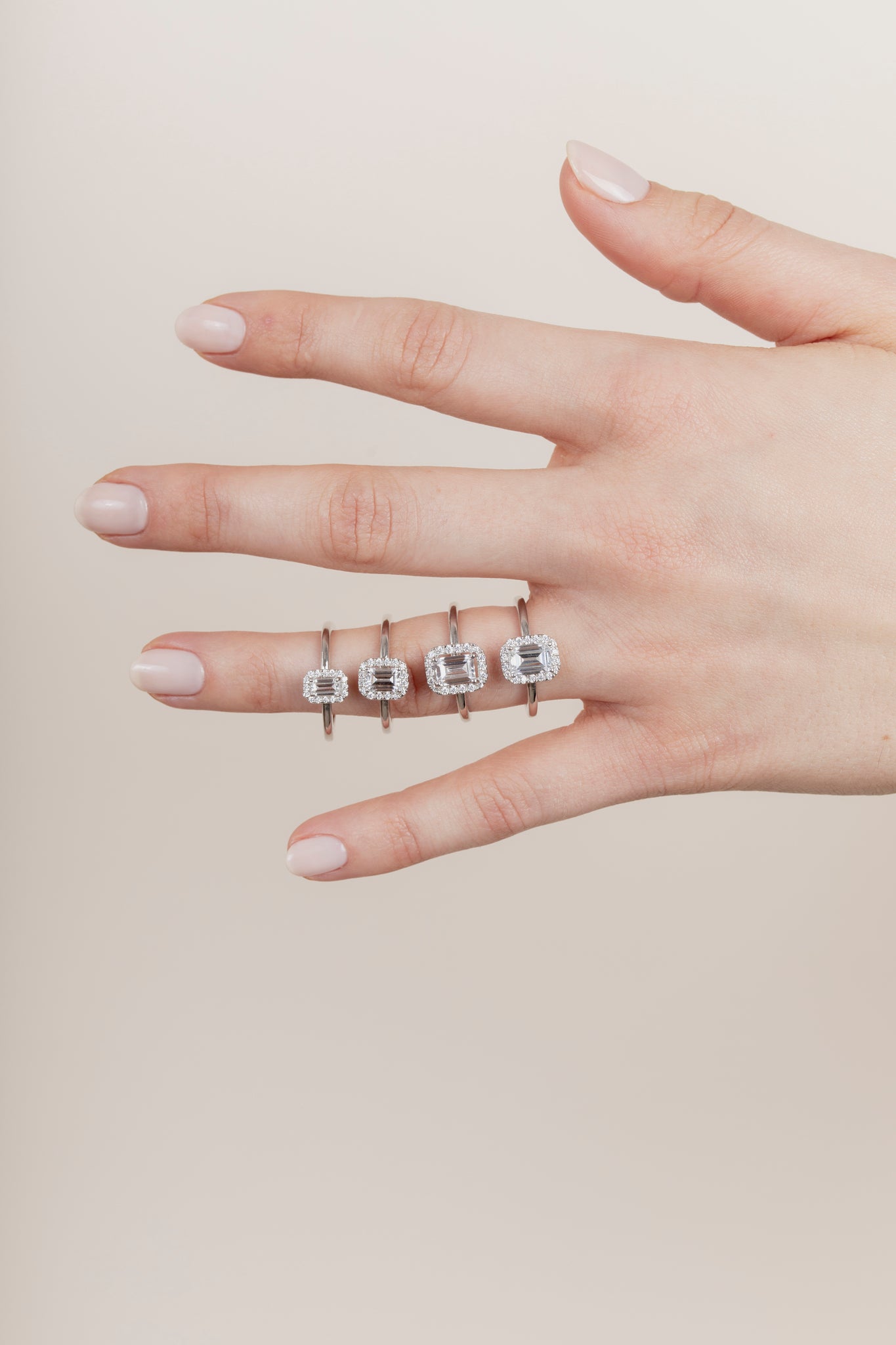 The Emerald Solitaire diamond ring with Halo is the embodiment of the simple, timeless and sophisticated engagement ring. The rectilinear, step cut facets highlight the diamond’s clarity, creating a clean, open look while the halo adds brilliance and volume. Designed to draw in light so your diamond shines bright in its setting, the sustainably created emerald-cut diamond is set high and fits a ring of equal thickness - such as our Pavé Diamond Ring - next to it.