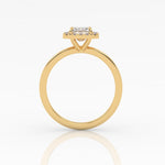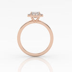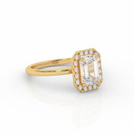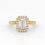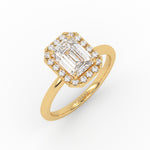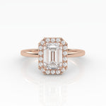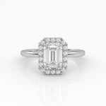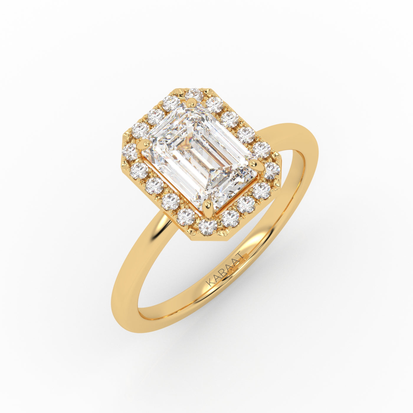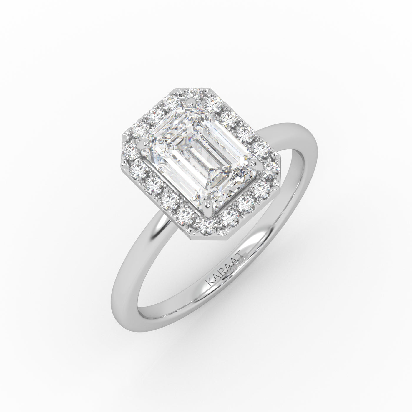 The Emerald Solitaire diamond ring with Halo embodies timeless sophistication. Its rectilinear step cut facets highlight clarity, creating a clean, open look, while the halo adds brilliance and volume. The sustainably created emerald-cut diamond is set high to maximize light and shine.