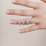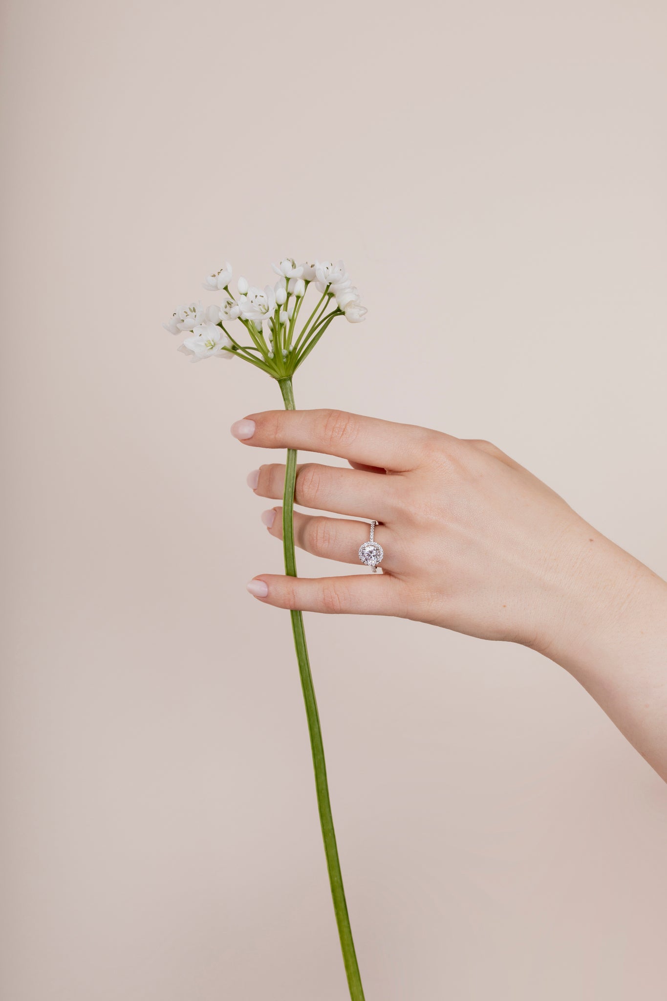The Round Solitaire diamond ring with Pavé band and Halo combines the most classic elements of an engagement ring, oozing romance and modern luxury. Designed to draw in light so your diamond shines bright in its setting, the sustainably created round brilliant-cut diamond and the halo surrounding it are set high and fit a ring of equal thickness - such as our Pavé Diamond Ring - next to it.