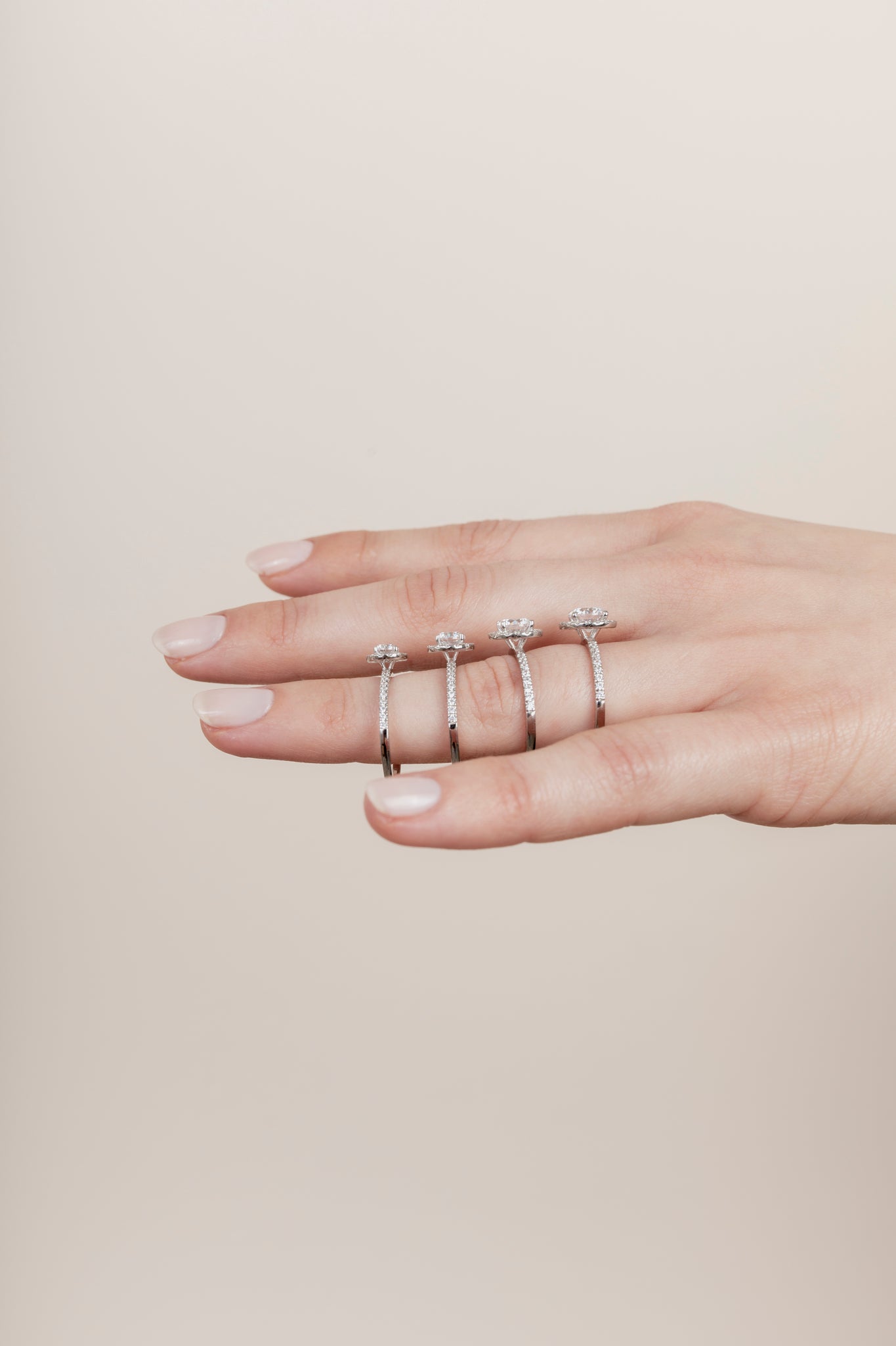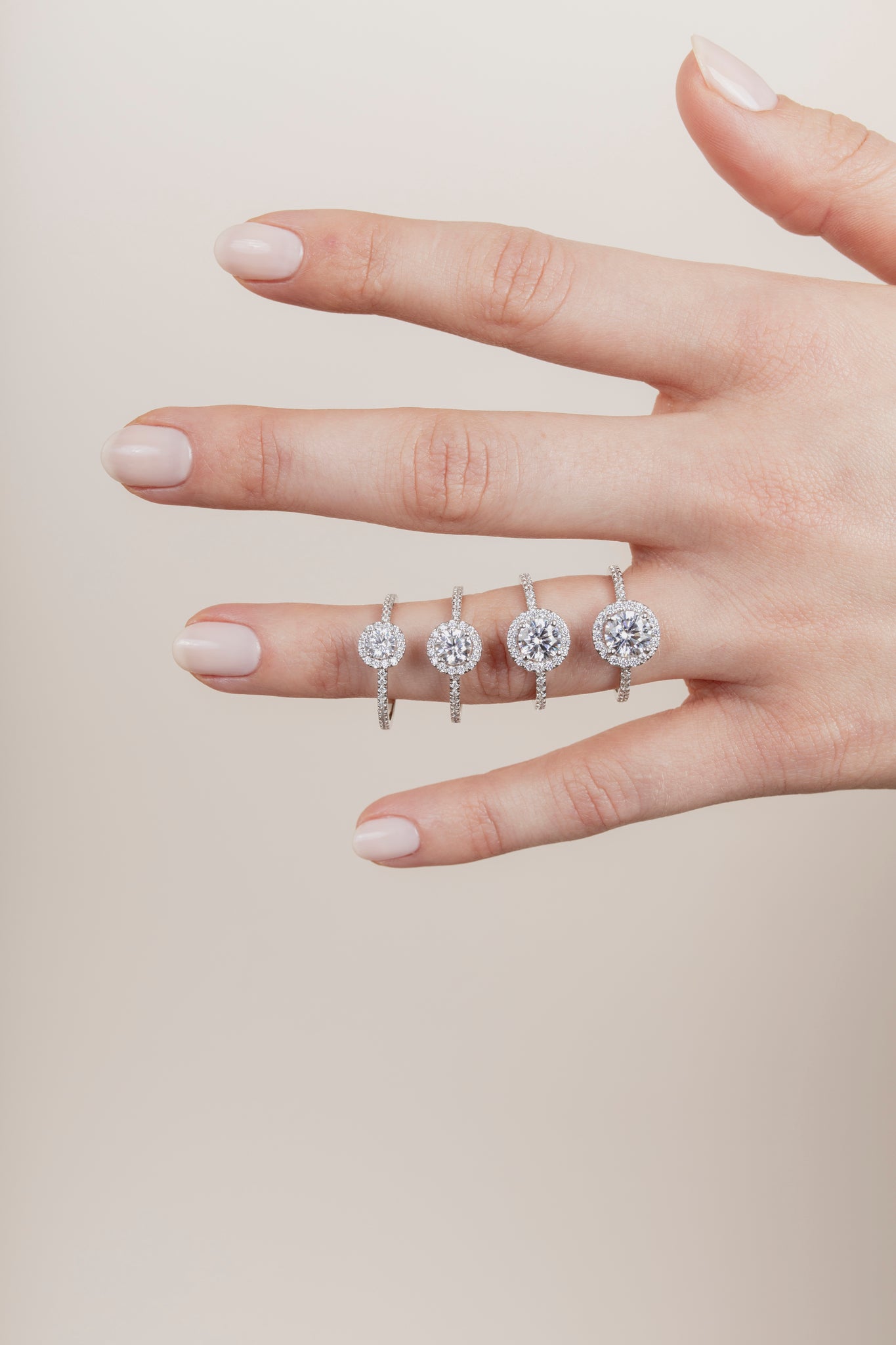 Shown with a 1-carat center stone. Model is wearing rings with 0.25, 0.5, 0.75 and 1ct center stones.