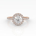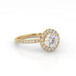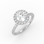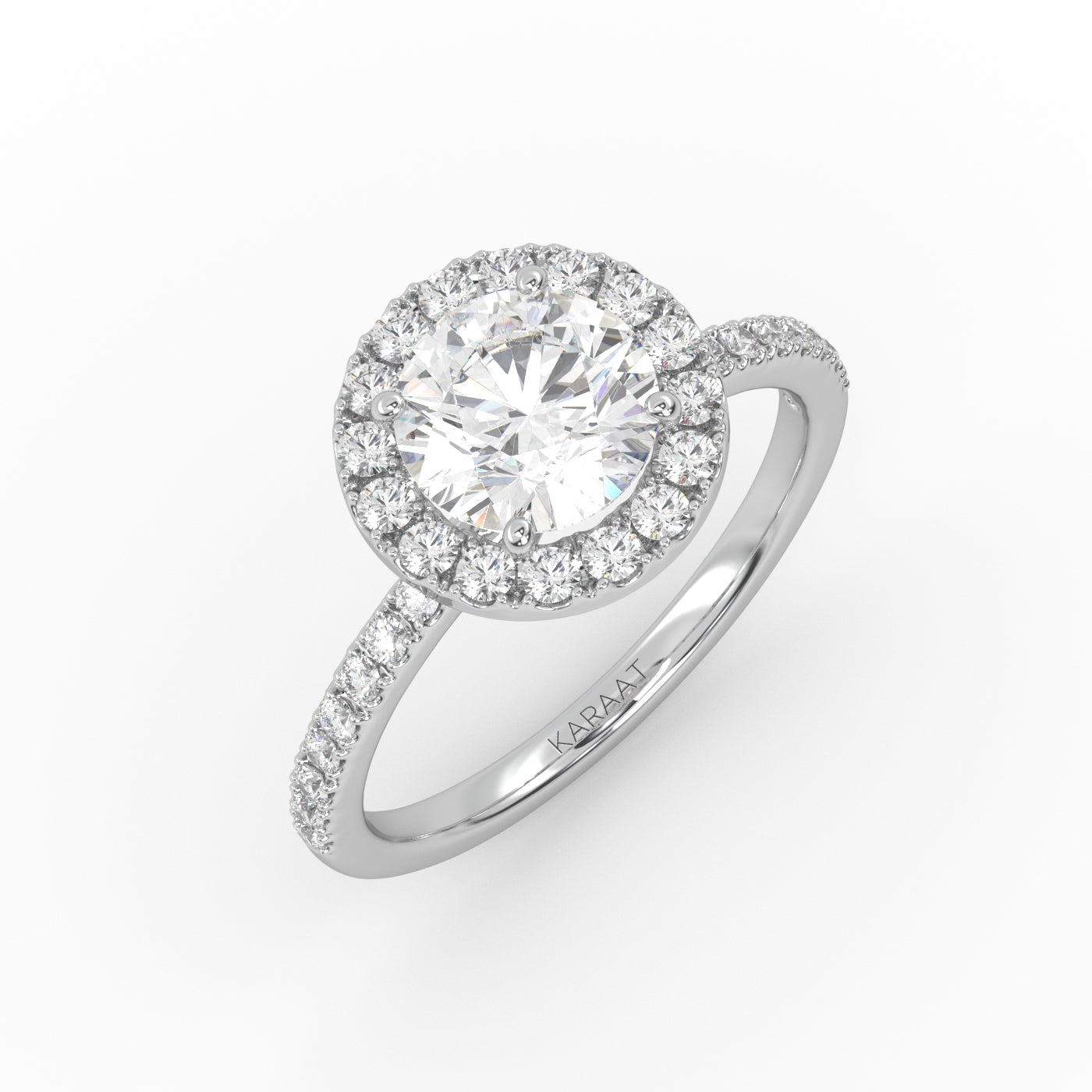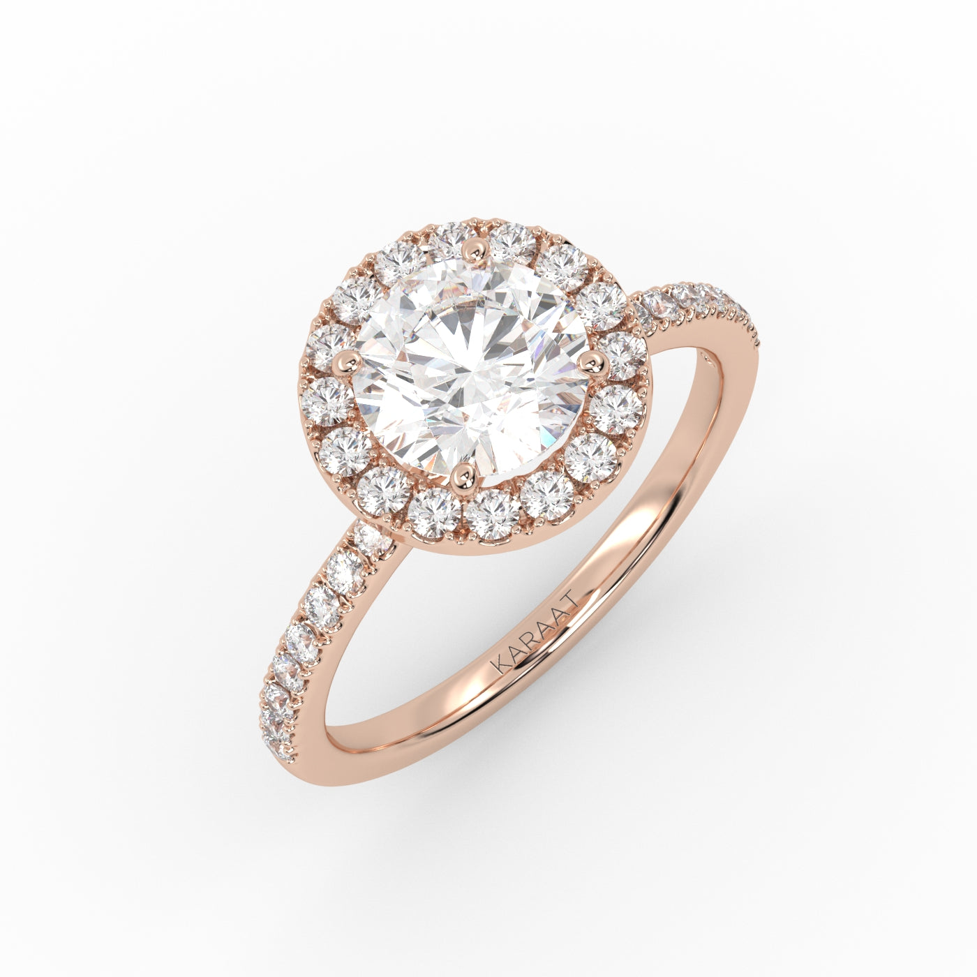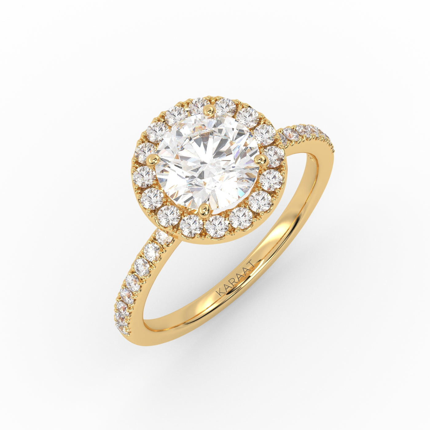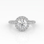 The Round Solitaire diamond ring with Pavé band and Halo embodies timeless sophistication. Its brilliant facets enhance clarity and sparkle, while the halo adds extra brilliance. With pavé-set diamonds in the band, this ring showcases the sustainably created round-cut diamond set high for maximum shine.