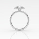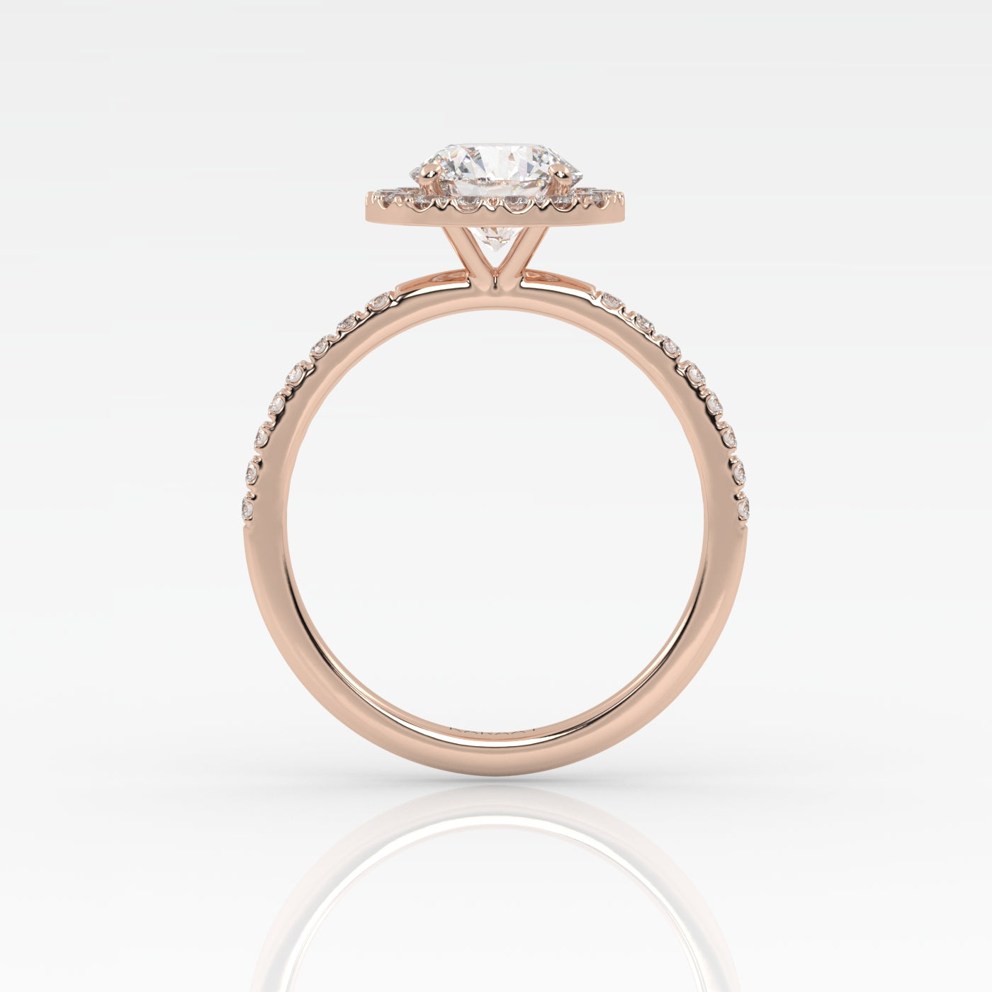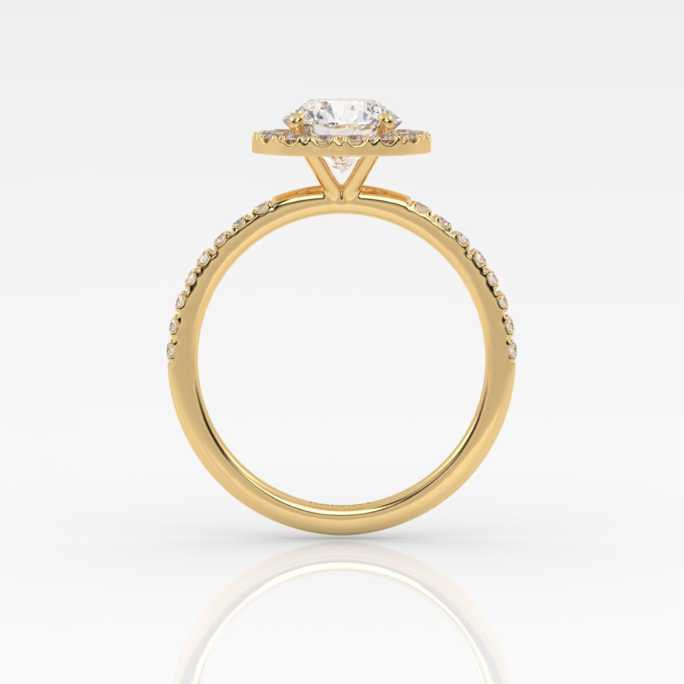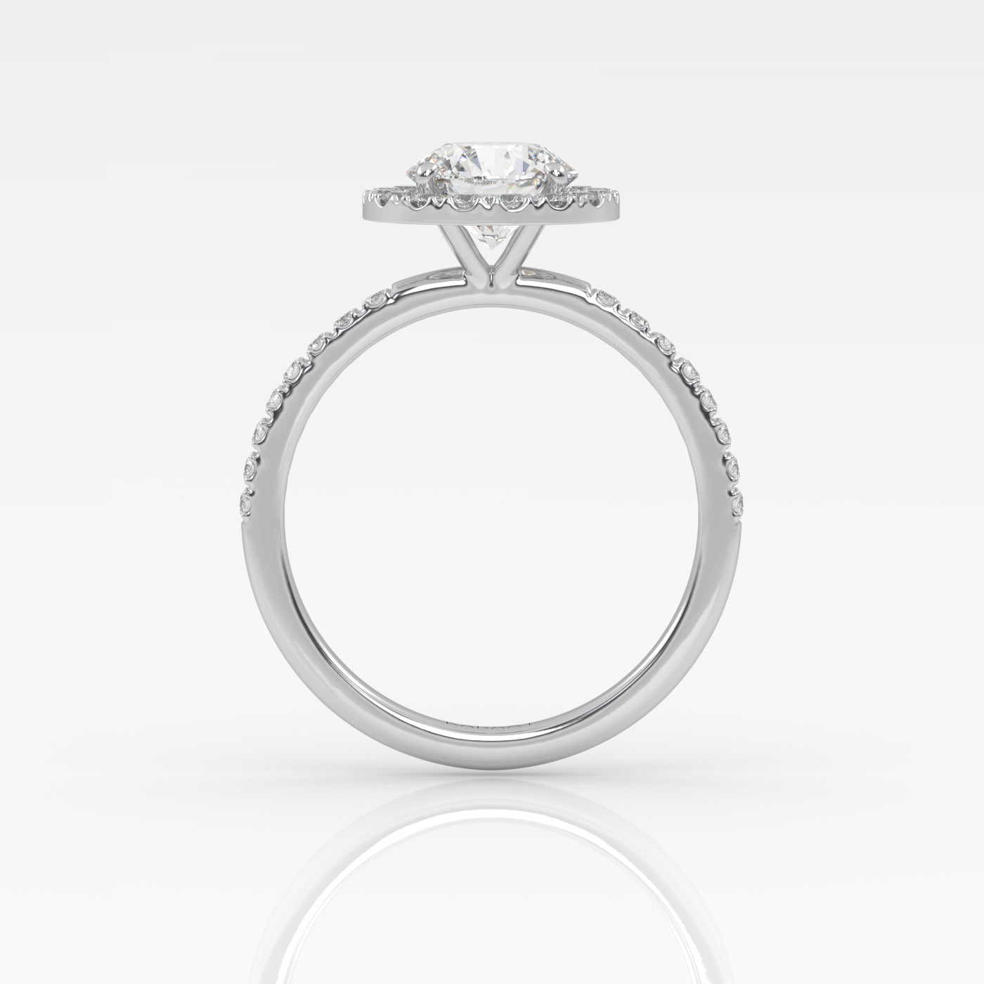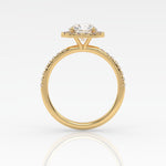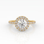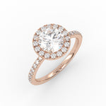 The Round Solitaire diamond ring with Pavé band and Halo embodies timeless sophistication. Its brilliant facets enhance clarity and sparkle, while the halo adds extra brilliance. With pavé-set diamonds in the band, this ring showcases the sustainably created round-cut diamond set high for maximum shine.