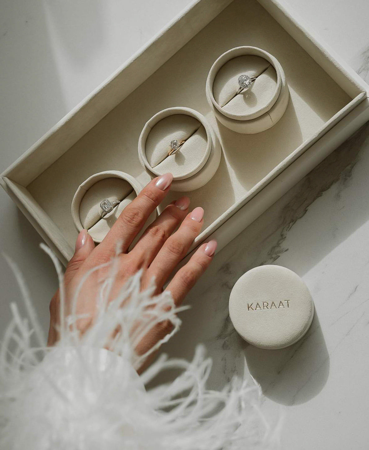 These samples represent the style, not quality, of a finished KARAAT ring. As all our jewelry, our engagement and wedding rings are created with 18-karat gold and high quality lab-grown diamonds.