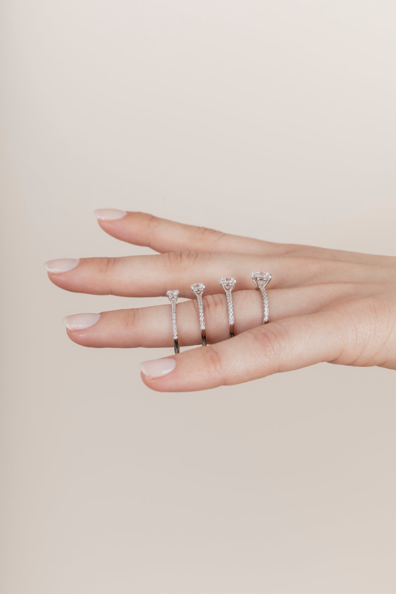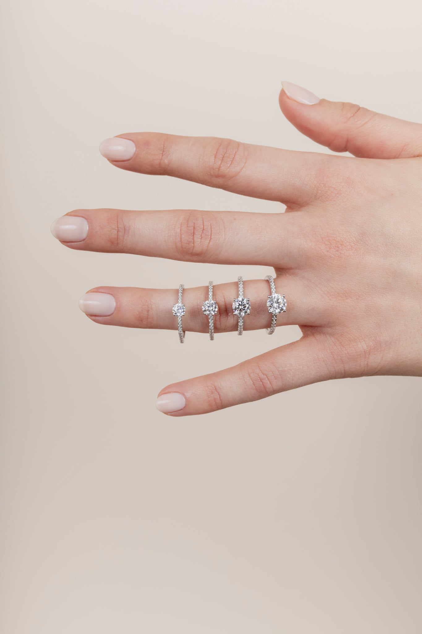Shown with a 1-carat center stone. Model is wearing rings with 0.25, 0.5, 0.75 and 1ct center stones.