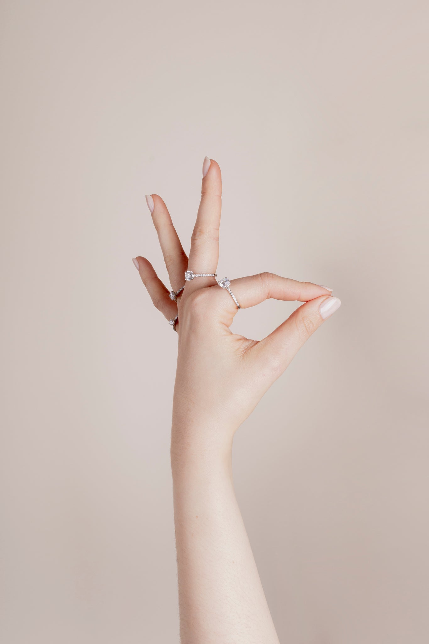 The Round Solitaire diamond ring with the Pavé band is a timeless engagement ring with added sparkle in the form of pavé-set diamonds in the band. Designed to draw in light so your center stone shines bright in its setting, the sustainably created round brilliant-cut diamond is set high and fits a ring of equal thickness - such as our Pavé Diamond Ring - next to it.