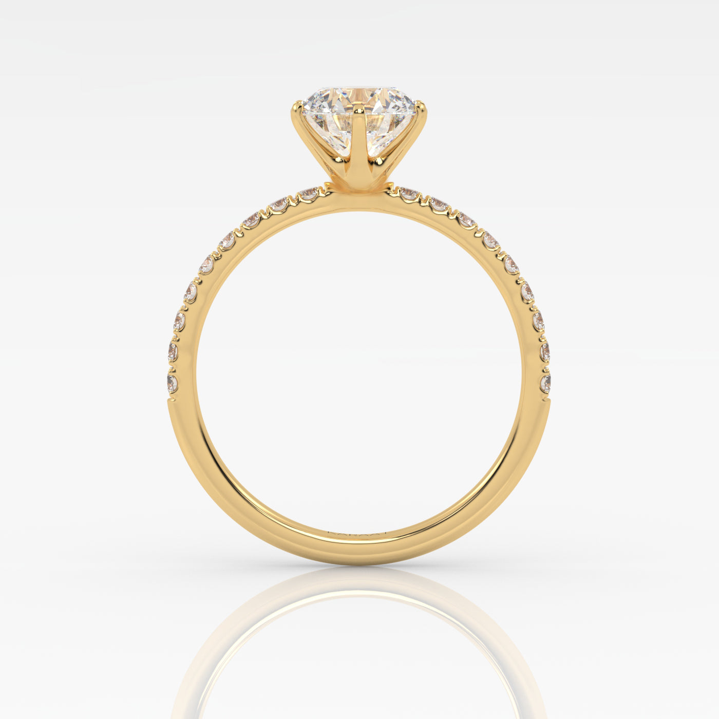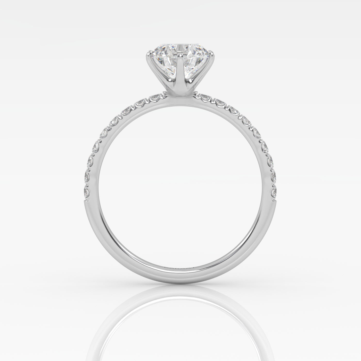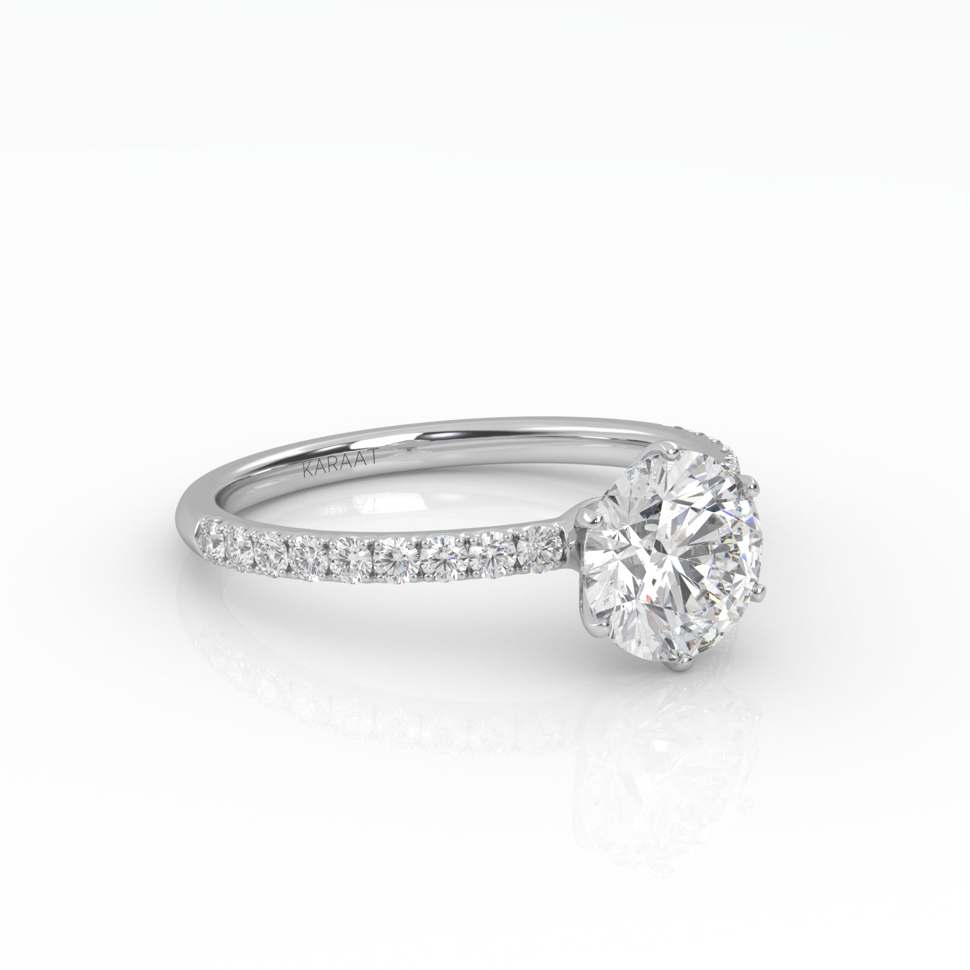 Pyöreä Solitaire-sormus kruunuistutuksella ja sivukivillä säihkyy upeasti ja korostaa keskikiveä runkoon istutettujen timanttien ansiosta. Istutuksen kynnet on sijoitettu tasaisesti timantin ympärille luoden vankan istutuksen timantille sekä korostaen etenkin pyöreää timanttimuotoa. Kruunuistutus sopii täydellisesti etenkin suurempiin timanttikokoihin ja antaa timanttisi säihkyä joka puolelta. Keskikivi on istutettu 18 karaatin kierrätyskullasta valmistettuun sormukseen tarpeeksi korkealle että sen viereen mahtuu Pavé-rivisormuksemme.