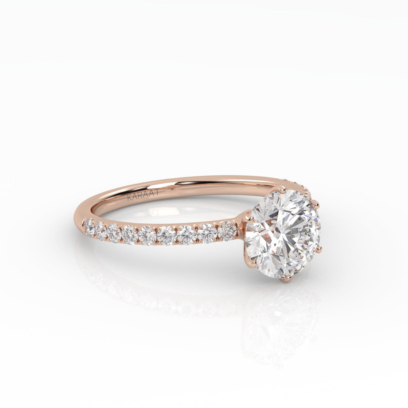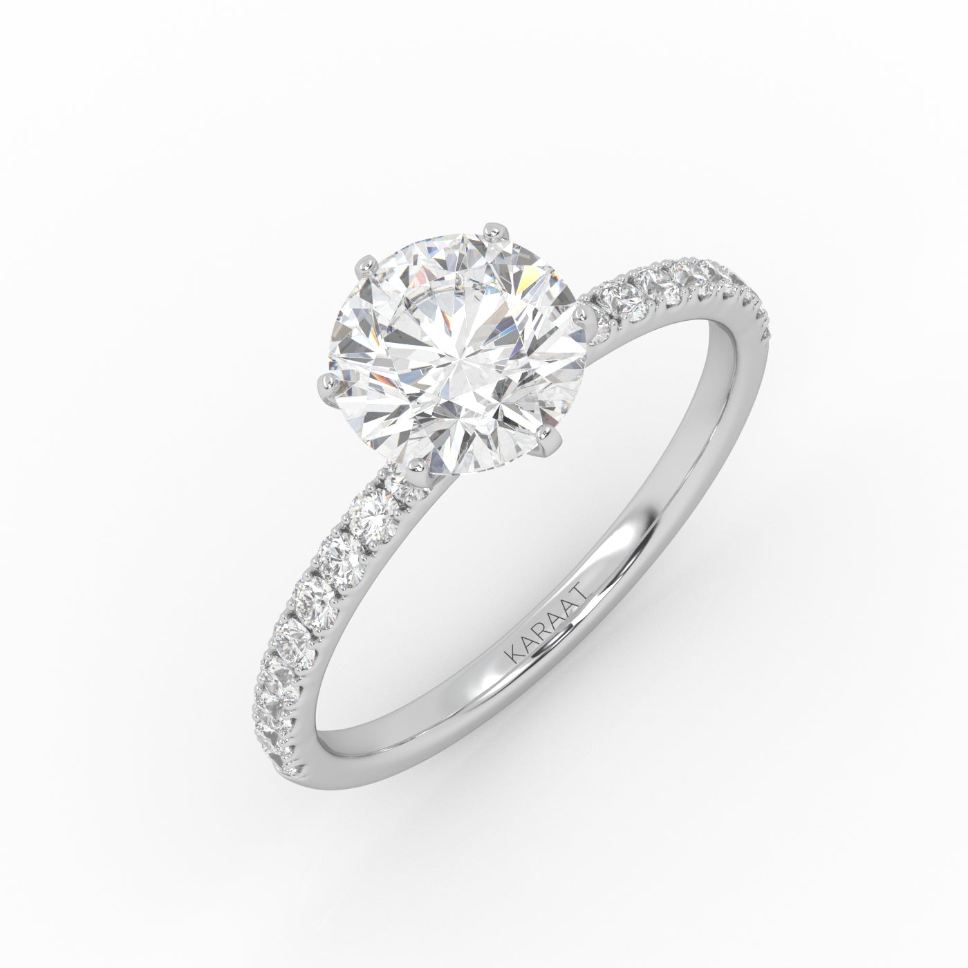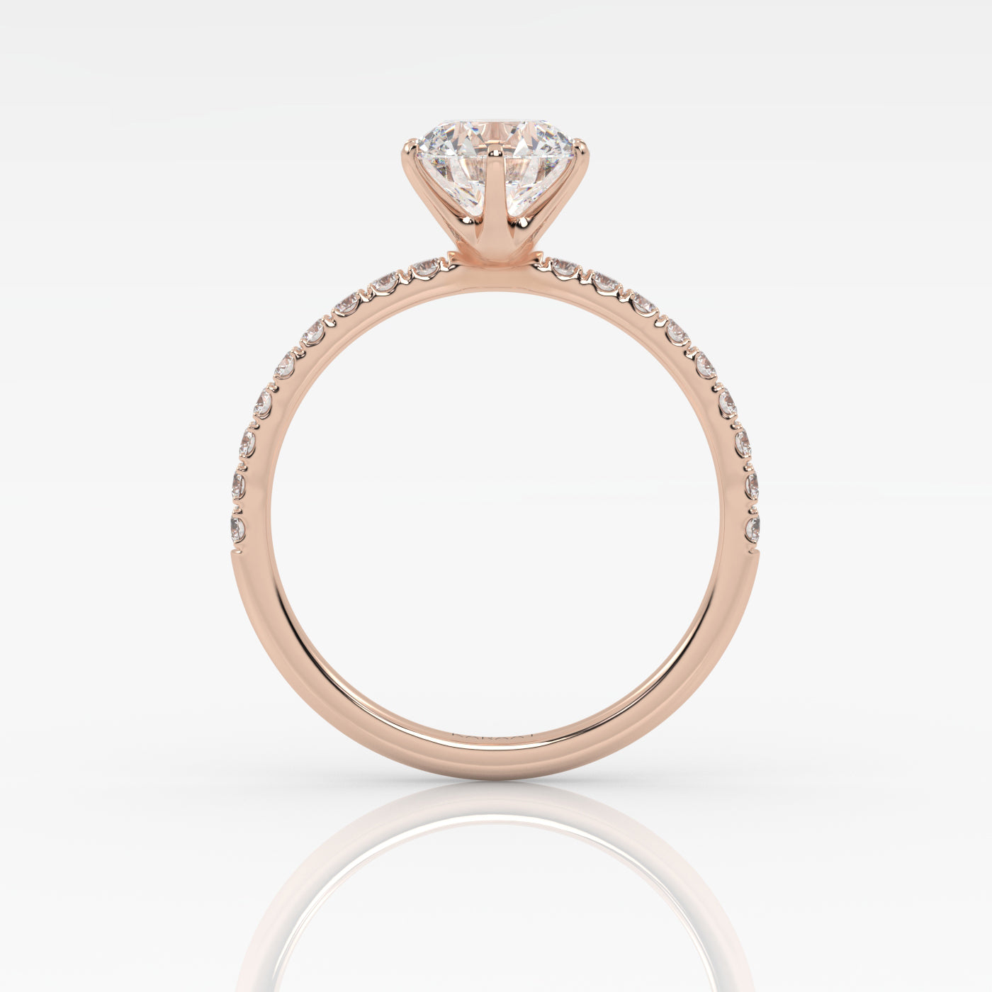 Pyöreä Solitaire-sormus kruunuistutuksella ja sivukivillä säihkyy upeasti ja korostaa keskikiveä runkoon istutettujen timanttien ansiosta. Istutuksen kynnet on sijoitettu tasaisesti timantin ympärille luoden vankan istutuksen timantille sekä korostaen etenkin pyöreää timanttimuotoa. Kruunuistutus sopii täydellisesti etenkin suurempiin timanttikokoihin ja antaa timanttisi säihkyä joka puolelta. Keskikivi on istutettu 18 karaatin kierrätyskullasta valmistettuun sormukseen tarpeeksi korkealle että sen viereen mahtuu Pavé-rivisormuksemme.