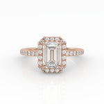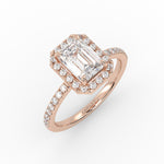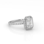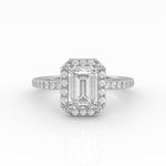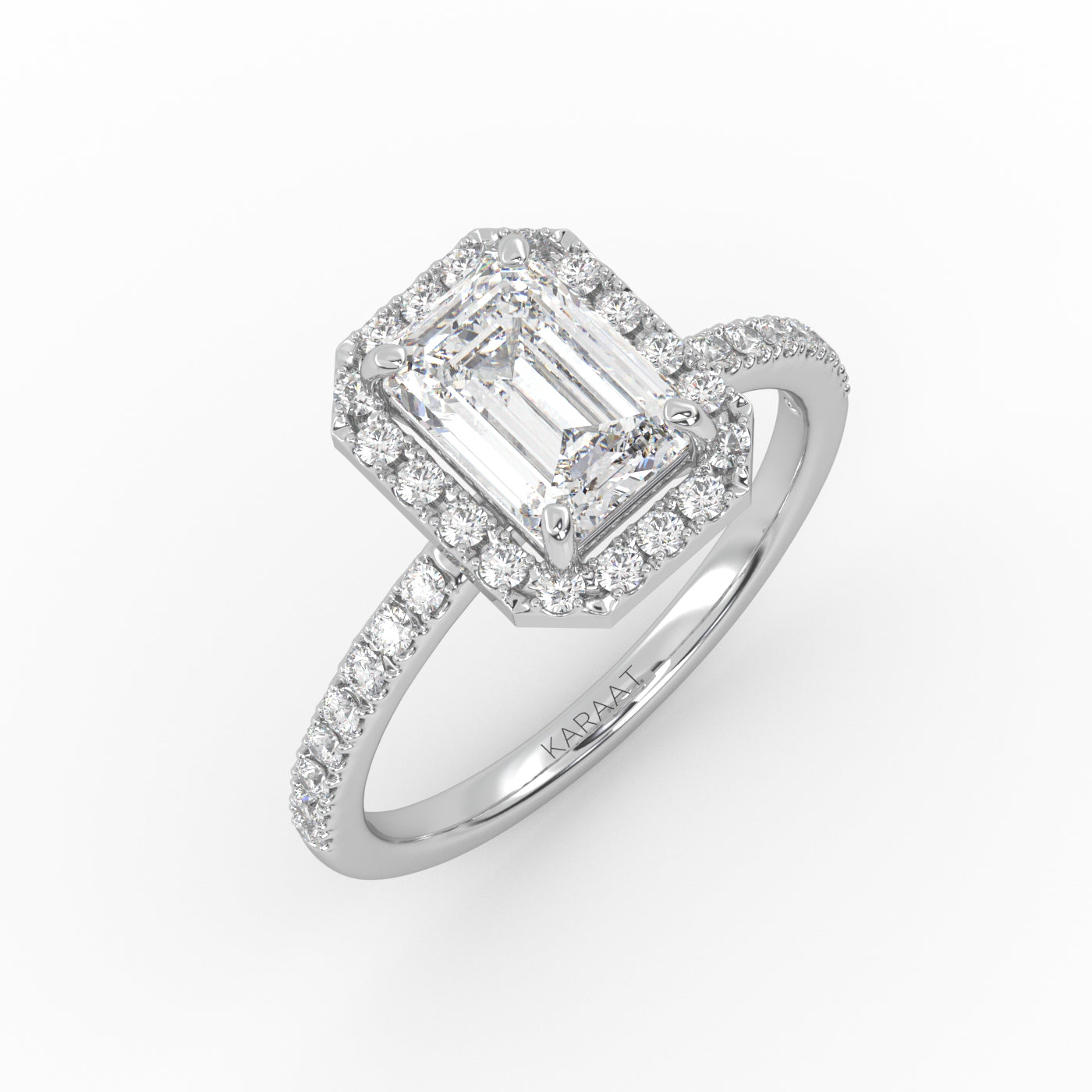Emerald Solitaire-sormus sivukivillä ja halolla säteilee eleganssia ja ylellisyyttä. Smaragdihiotun timantin, halon ja pavé-sivukivien yhdistelmä antaa sormukselle ajattoman ilmeen sekä näyttävän säihkeen, joka pääsee oikeuksiinsa klassisessa solitaire-istutuksessa.