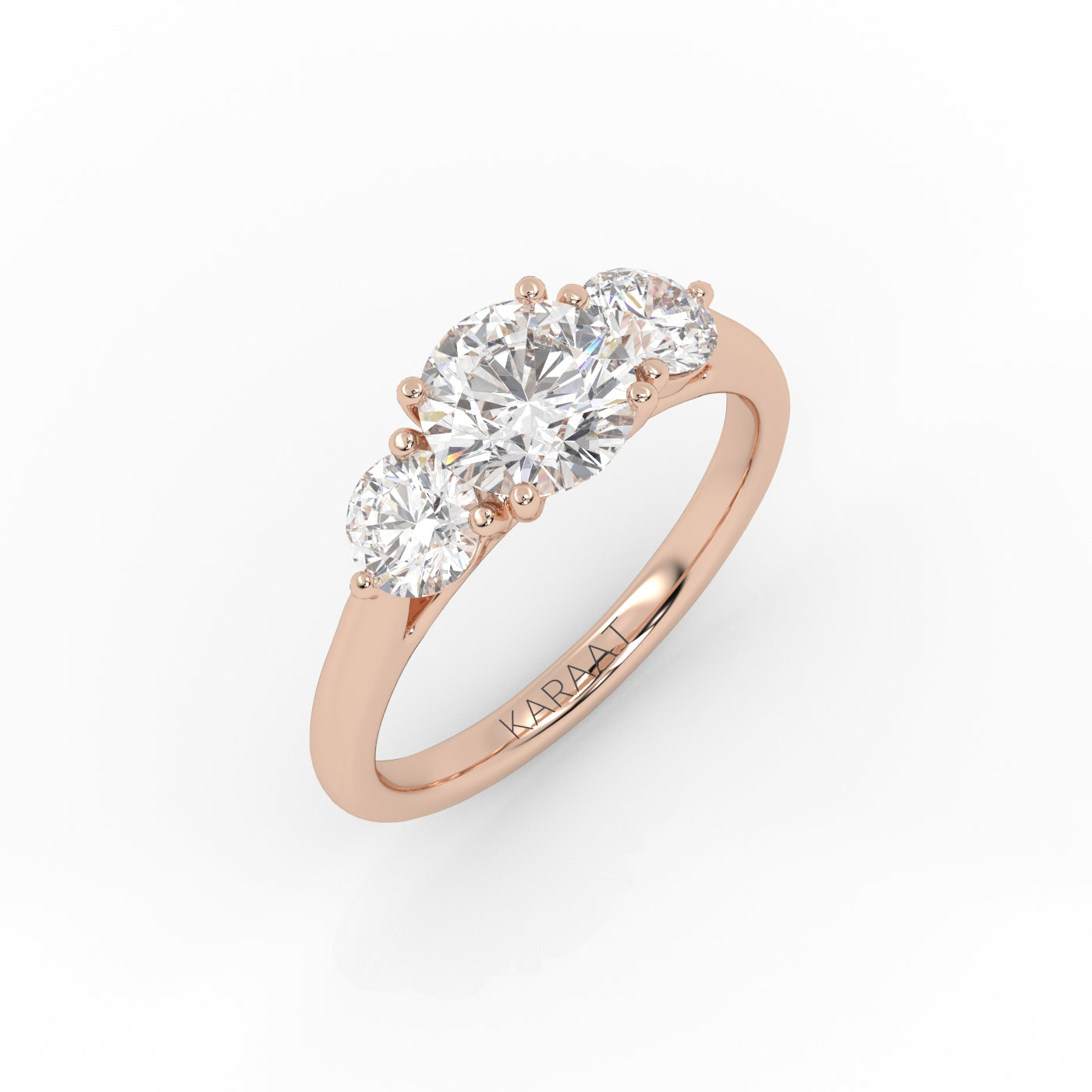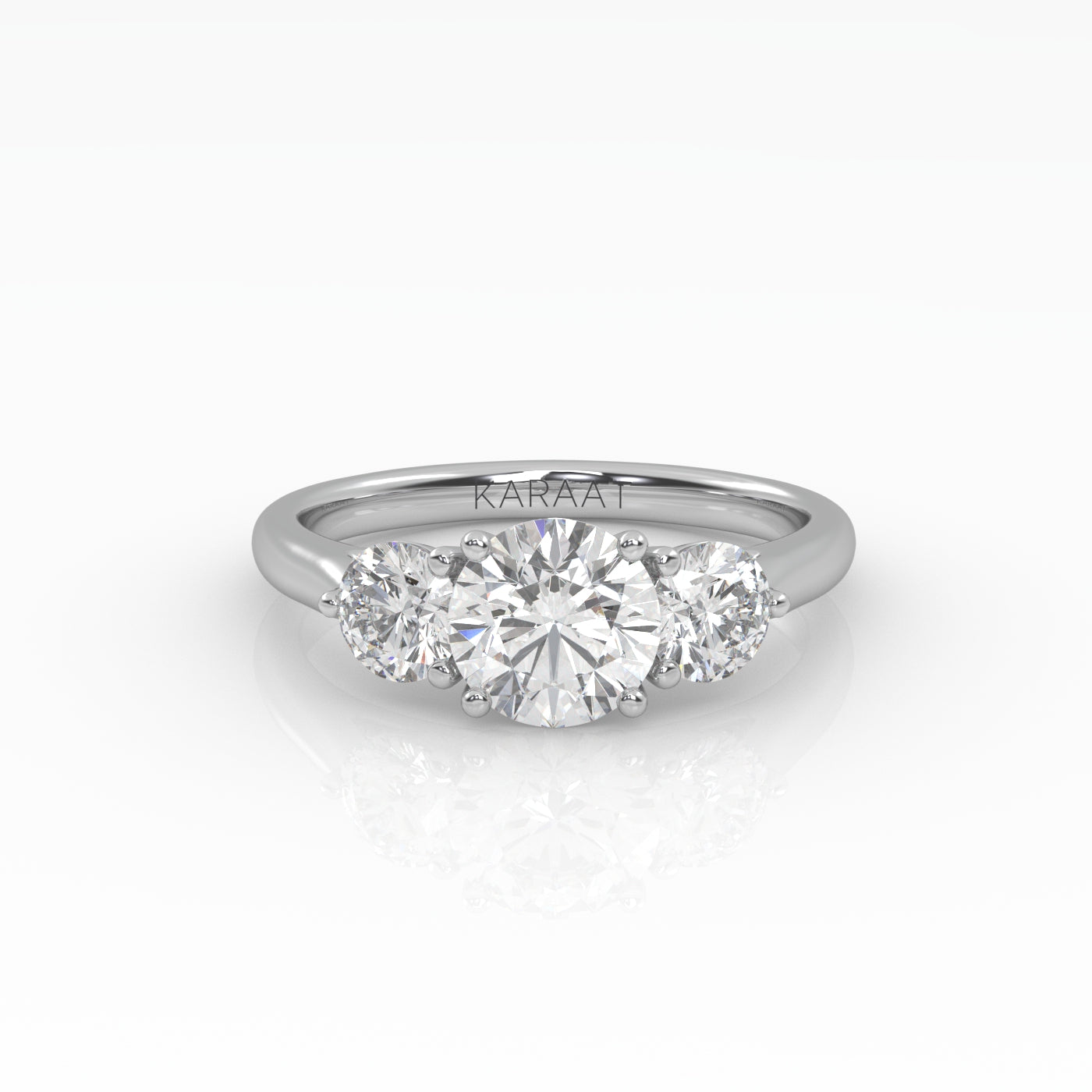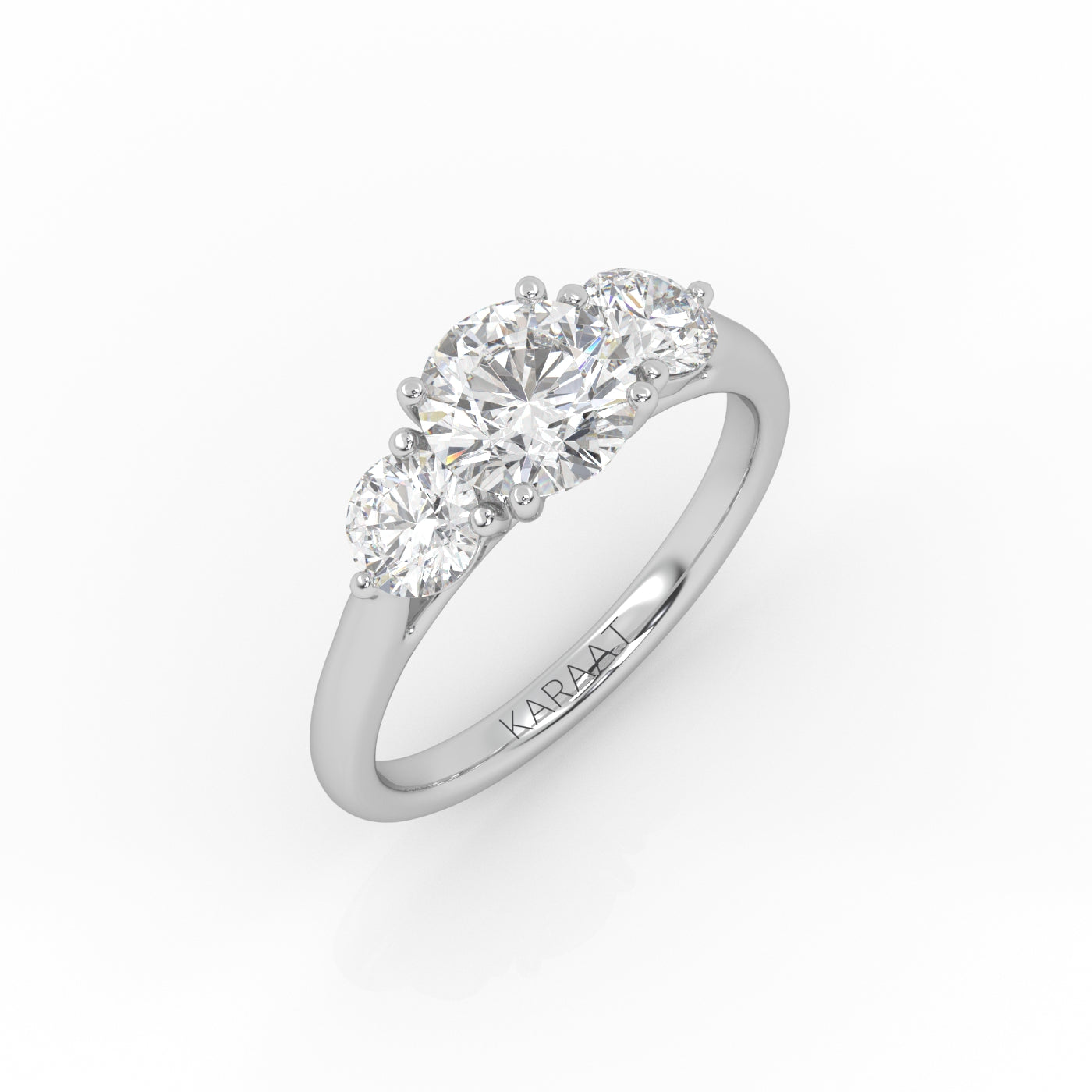 Round Trilogy-timanttisormus symboloi menneisyyttä, nykyisyyttä ja tulevaisuutta upealla pyöreillä keski- ja sivukivillä. Näyttävä kolmen timantin rivi säihkyy upeasti elegantin siluetin päästäessä siihen runsaasti valoa.