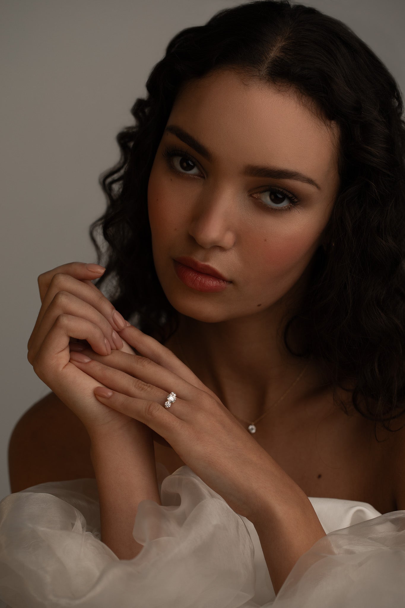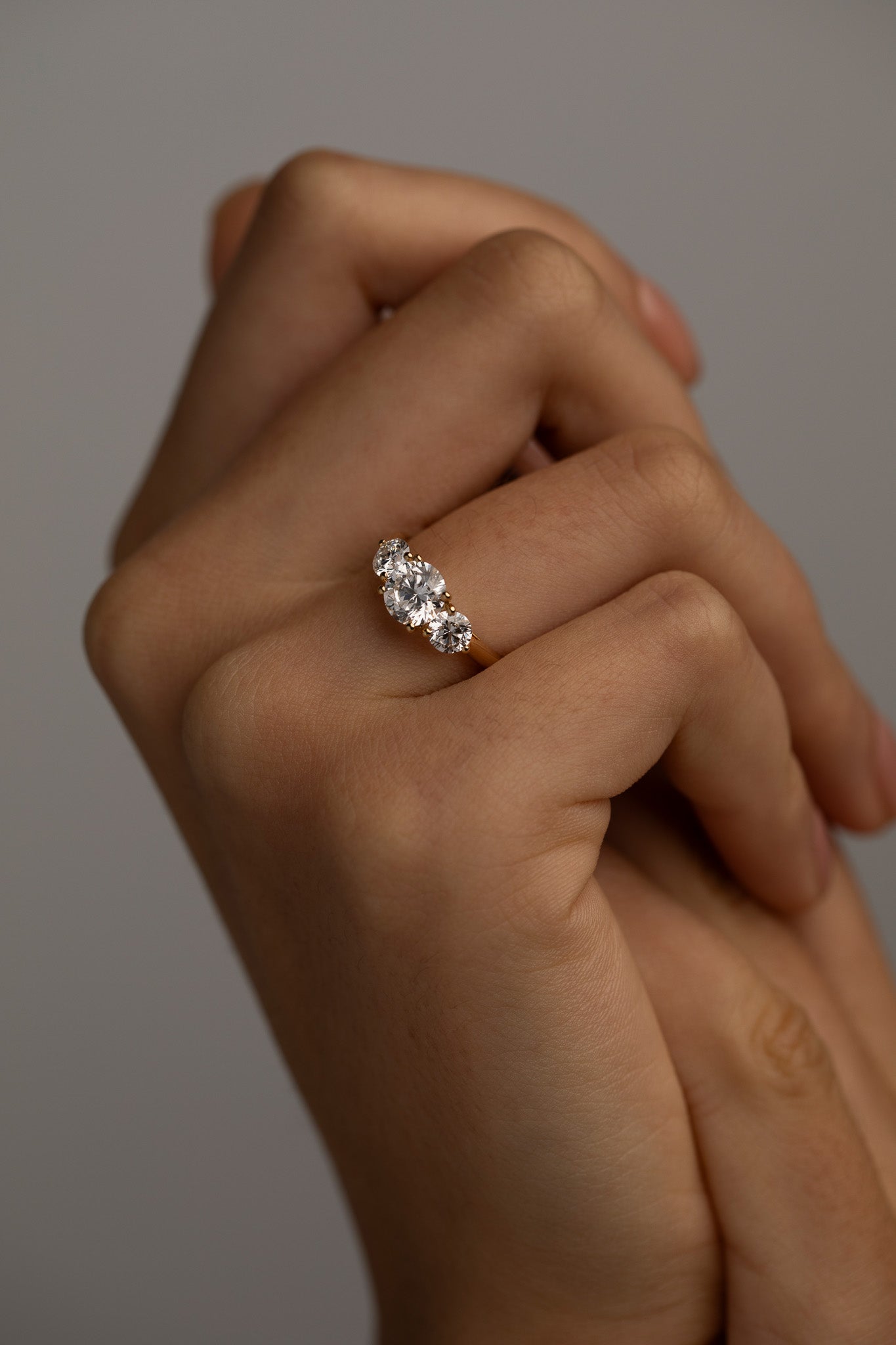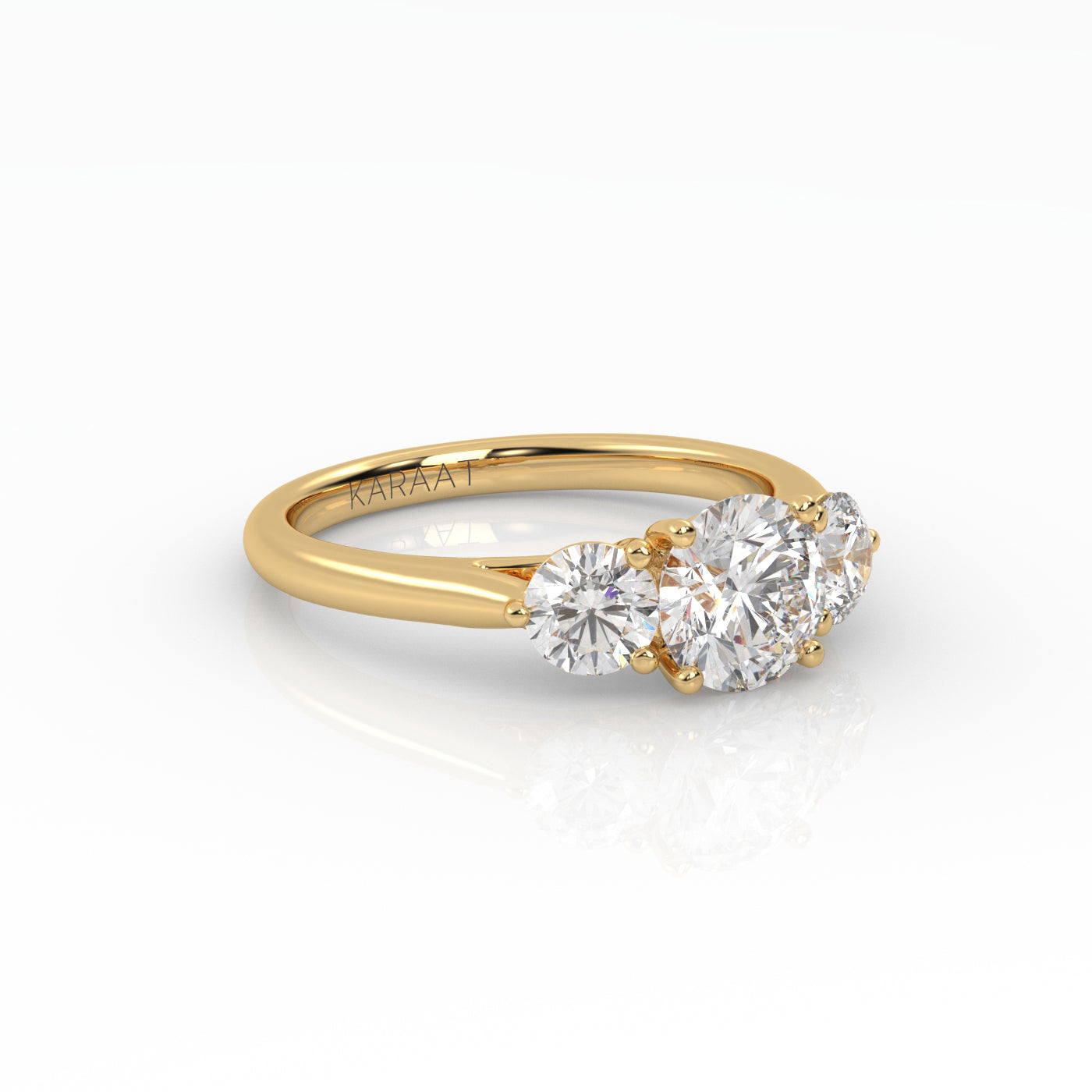 Round Trilogy-timanttisormus symboloi menneisyyttä, nykyisyyttä ja tulevaisuutta upealla pyöreillä keski- ja sivukivillä. Näyttävä kolmen timantin rivi säihkyy upeasti elegantin siluetin päästäessä siihen runsaasti valoa.