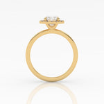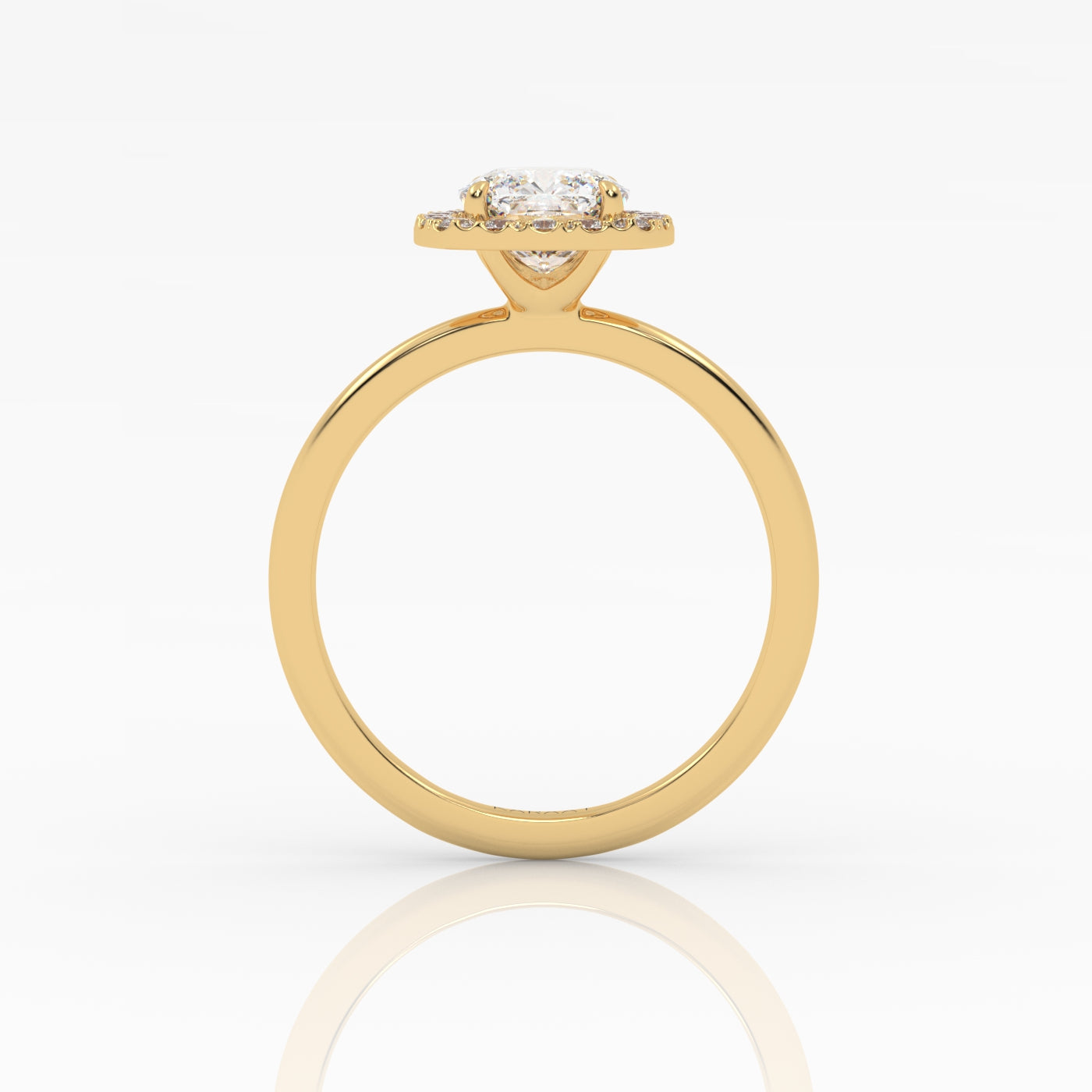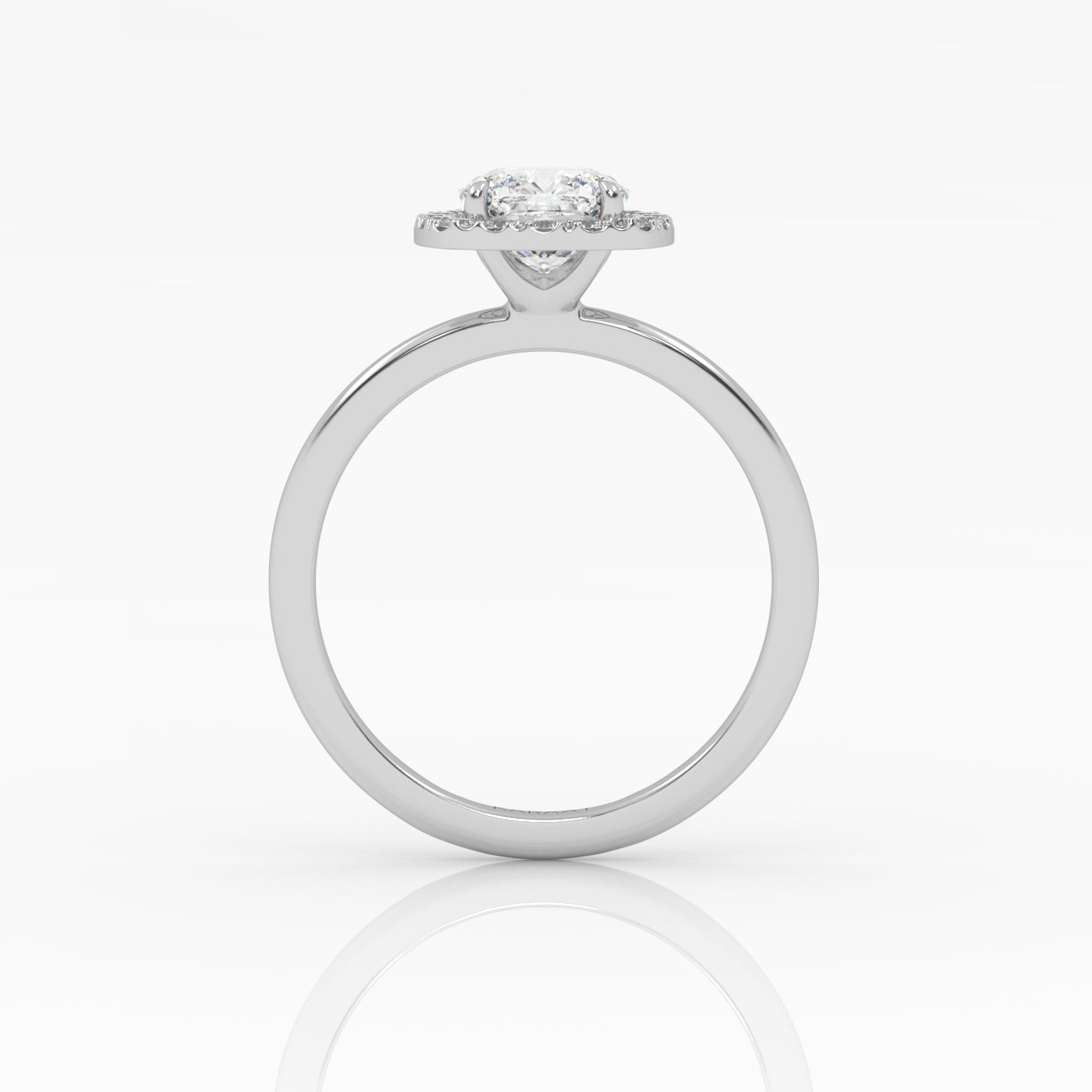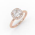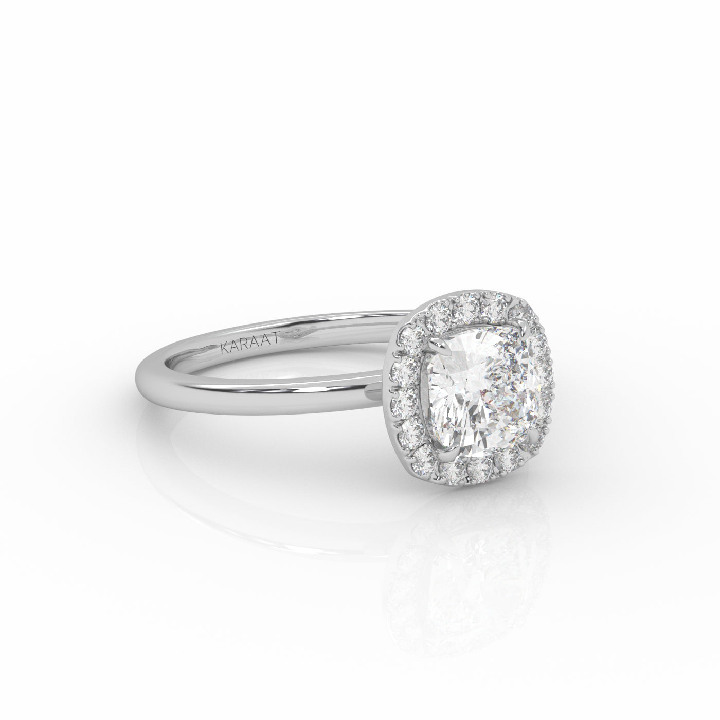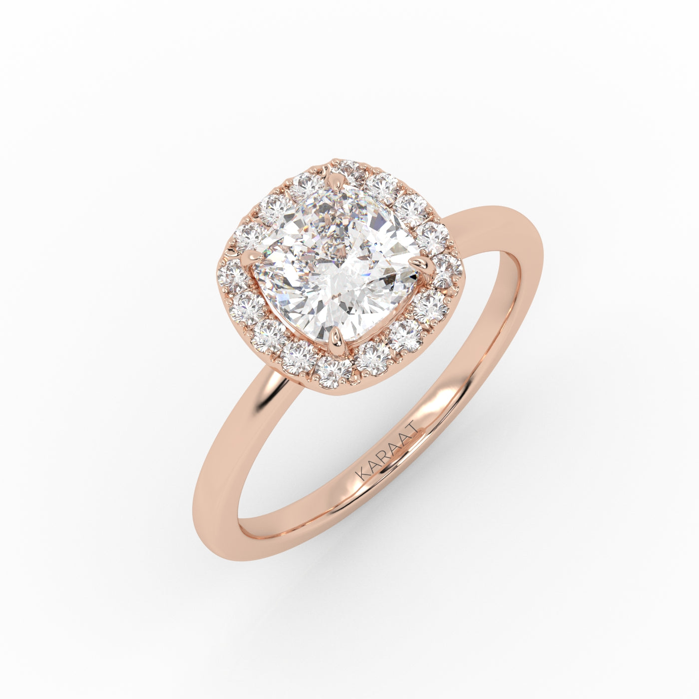 The Cushion Solitaire diamond ring with Halo radiates romance and luxury. Its vibrant cushion cut and diamond halo create a timeless vintage charm, while the sustainably created center stone is set high for maximum brilliance.