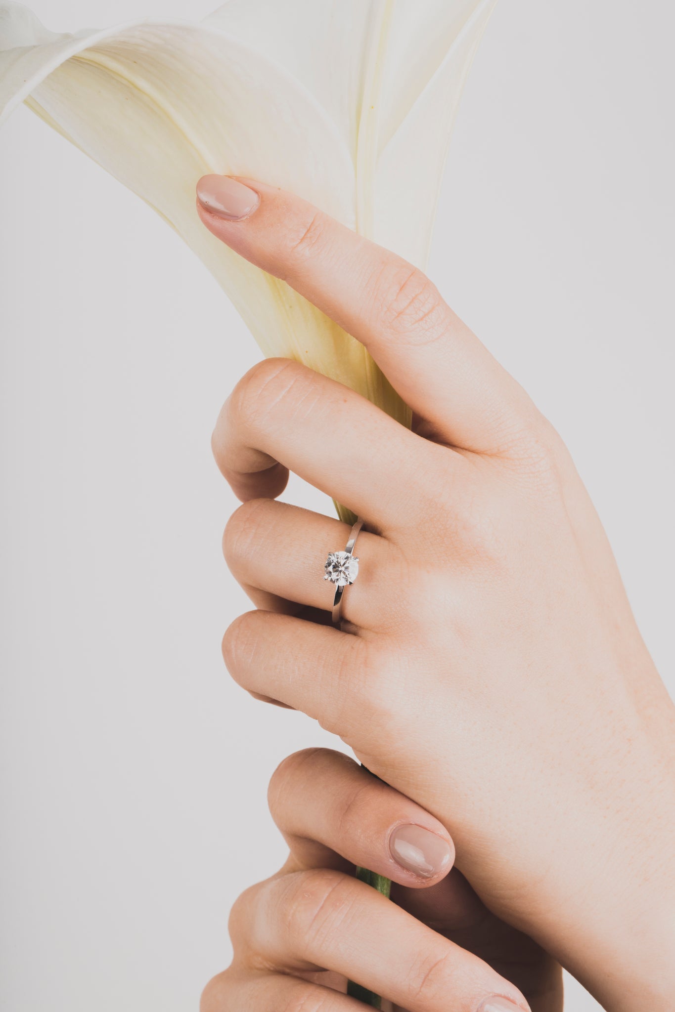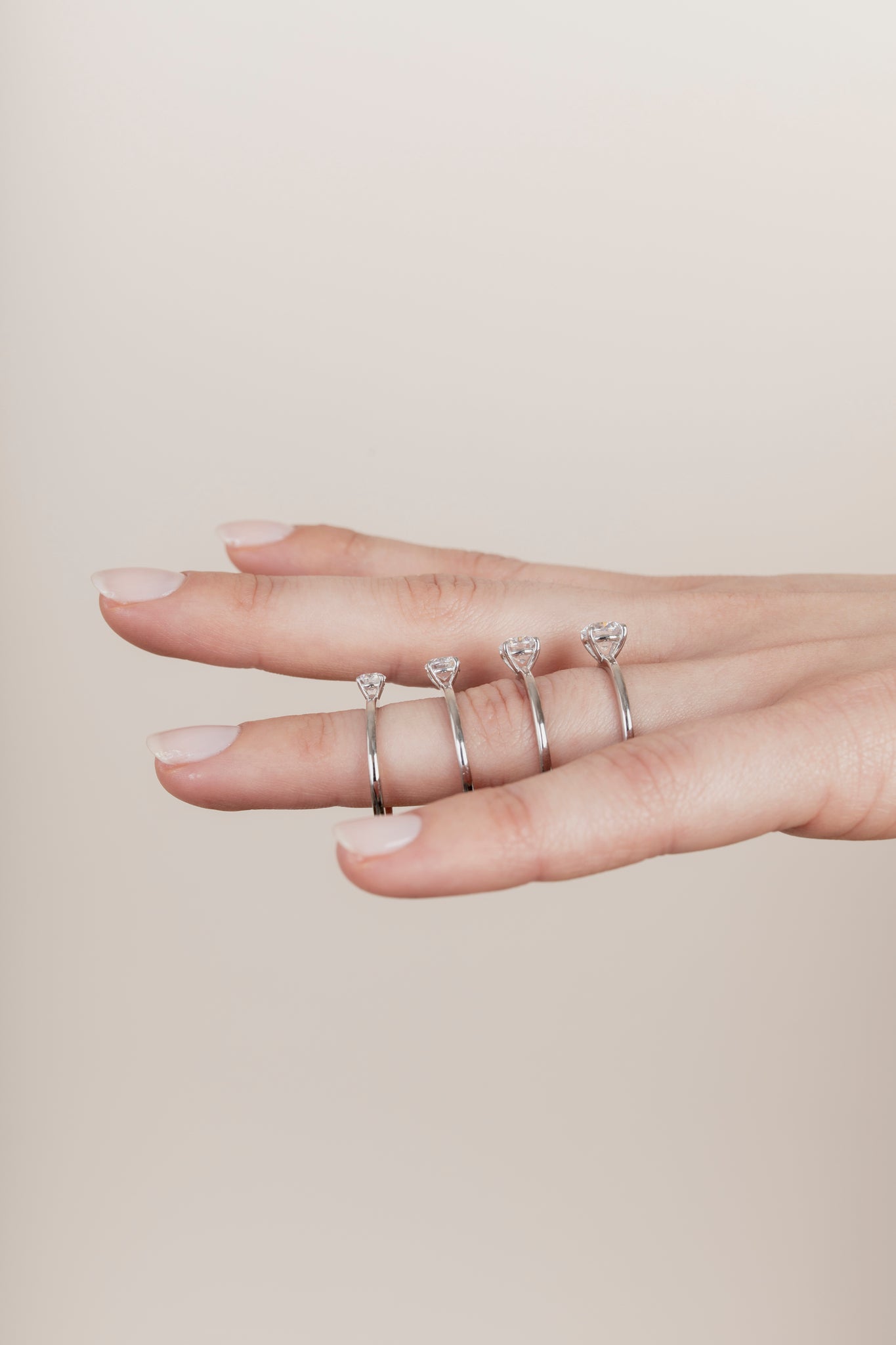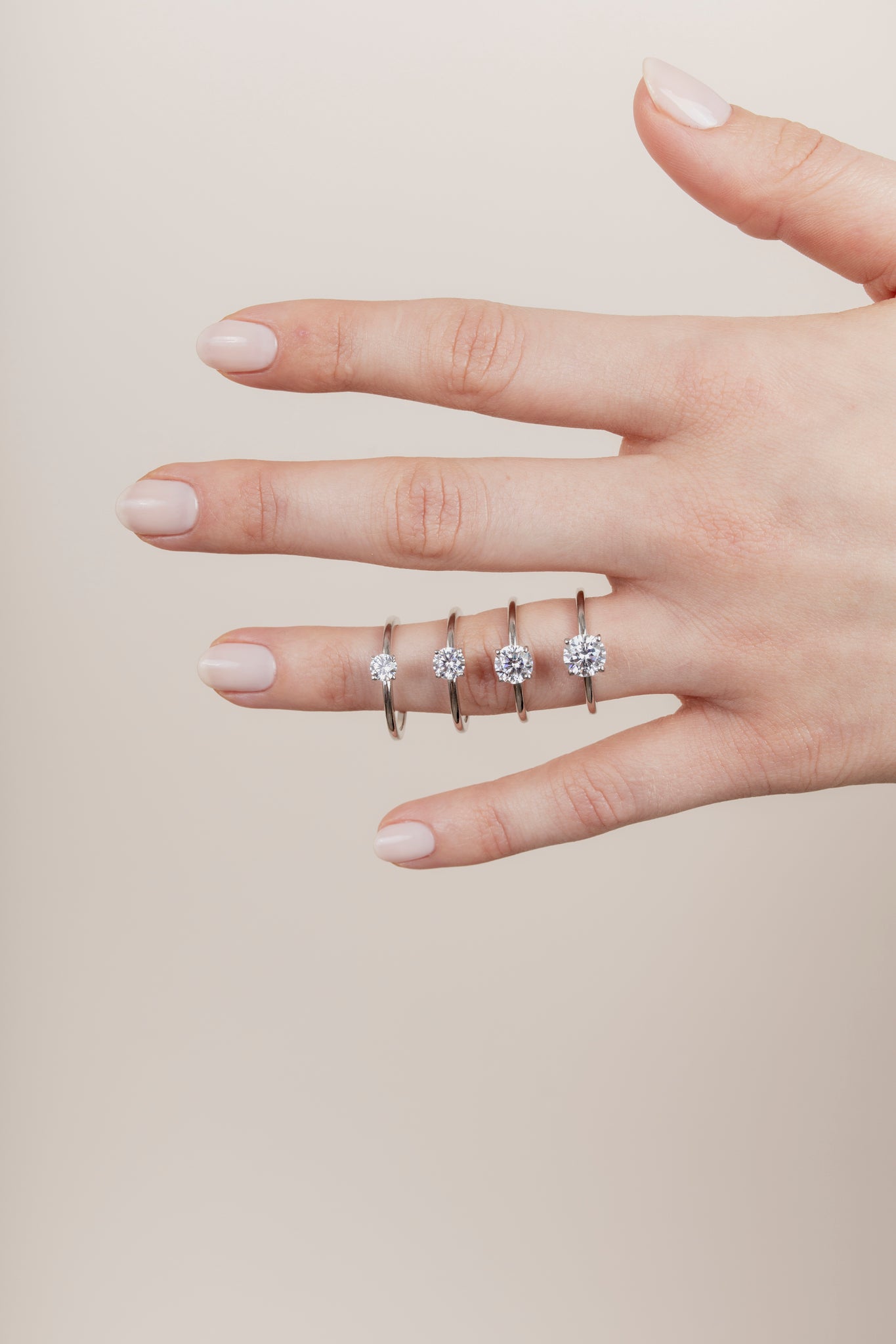 Shown with a 1-carat center stone. Model is wearing rings with 0.25, 0.5, 0.75 and 1ct center stones.